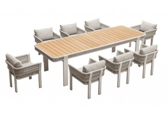 Kolekcja BORROMEO to połączenie prostoty konstrukcji aluminiowej z plecionką z liny polipropylenowej i wygodnych poduszek. Mieszanka konwencjonalnego wzornictwa z przyjemną nostalgią! Blaty z drewna teakowego.