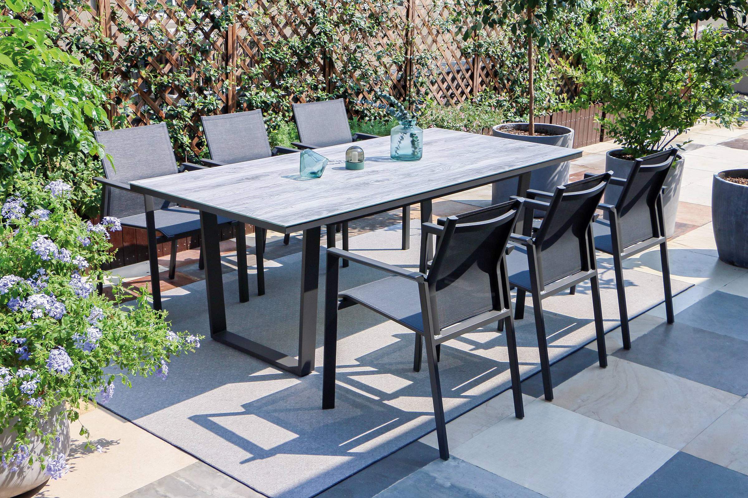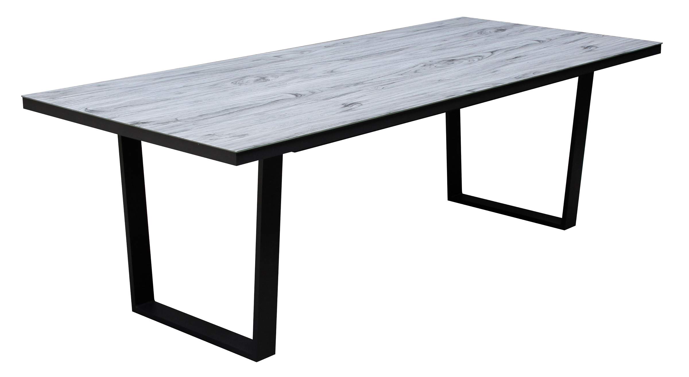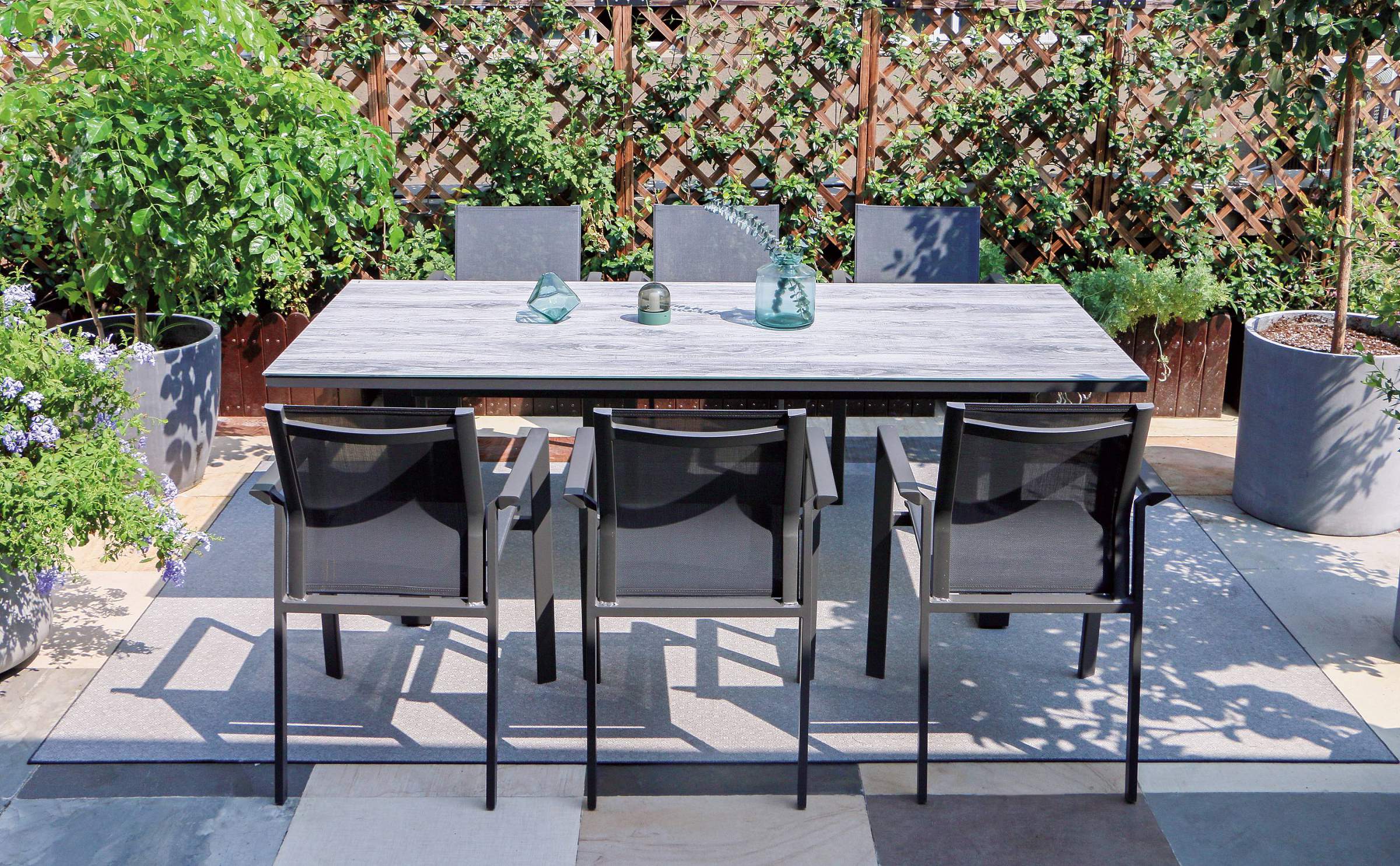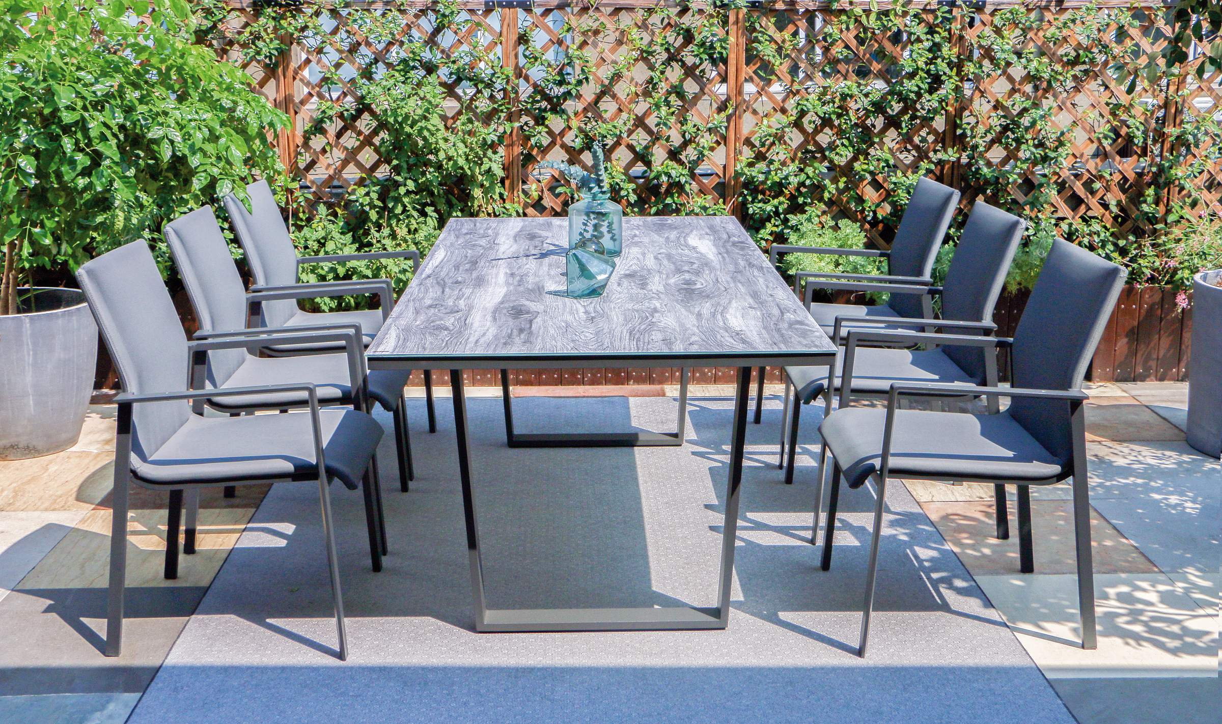 Meble ogrodowe aluminiowe - zestaw stołowy, z w którym główną rolę gra albuminowy stół BUFFALO z blatem ze szkła hartowanego z powłoką imitująca drewno poszarzone. Do kompletu dobrano krzesła NASHVILLE lub SANTA FE.