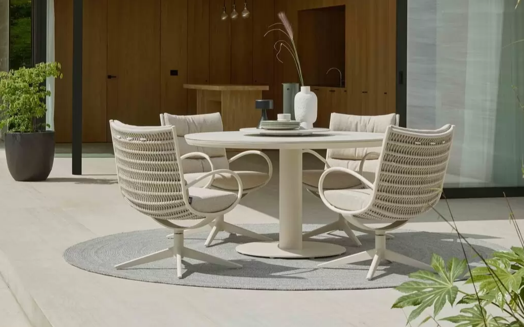 Całość konstrukcji opiera się na grubych profilach aluminiowych oraz nowoczesnej plecionce linowej, co zapewnia pełną cyrkulację powietrza i zapobiega przegrzewaniu się ciała w upalne dni. Ten okrągły stół ogrodowy wraz z fotelami został zaprojektowany do całorocznej ekspozycji zewnętrznej, nie wymagając zadaszenia ani specjalistycznej konserwacji sezonowej dzięki zastosowaniu technologii drenażowej BEE WETT®.