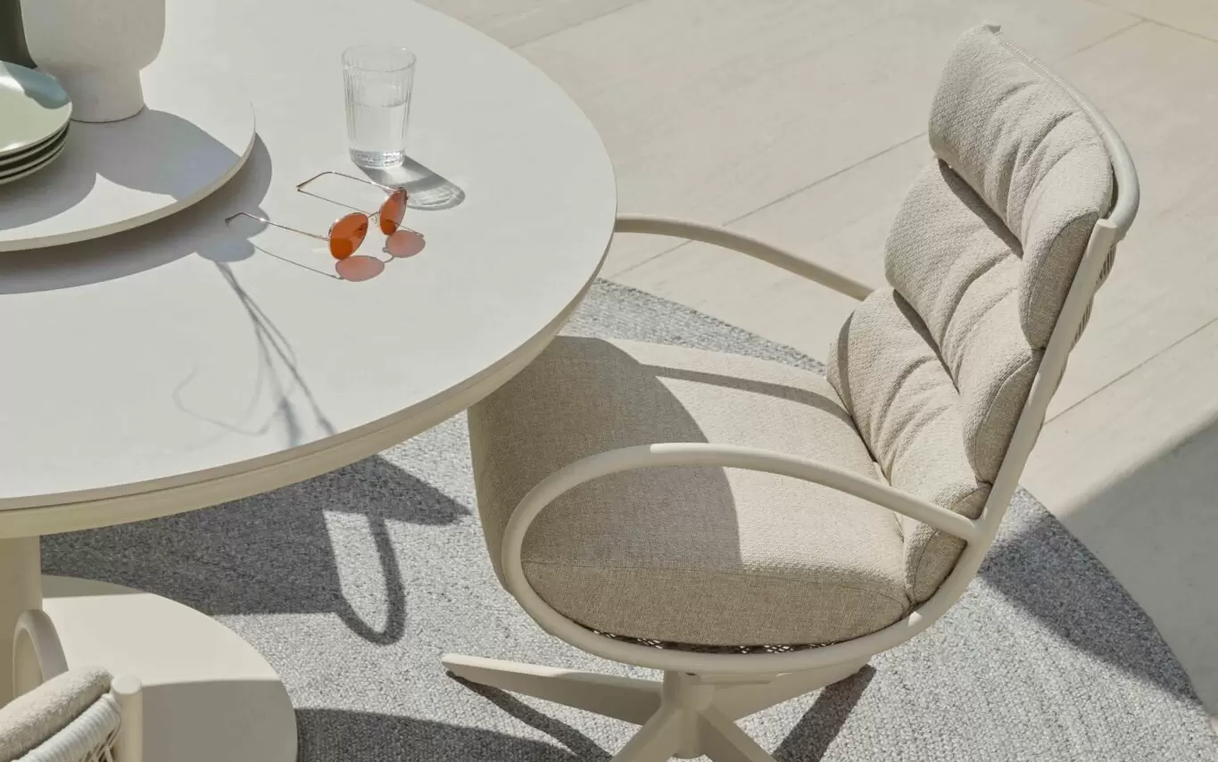 Ten komplet to przede wszystkim okrągły stół ogrodowy z pięknie wykończonym blatem ze spieku kamiennego o średnicy 140 cm. Centralna część blatu posiada zintegrowaną nakładkę obrotową, co drastycznie ułatwia wspólne biesiadowanie – każdy z gości ma swobodny dostęp do serwowanych dań bez konieczności ich podawania. Wykorzystanie spieku jako powierzchni roboczej gwarantuje, że stół jest całkowicie odporny na zarysowania sztućcami, wysoką temperaturę naczyń oraz plamy z wina czy tłuszczu.