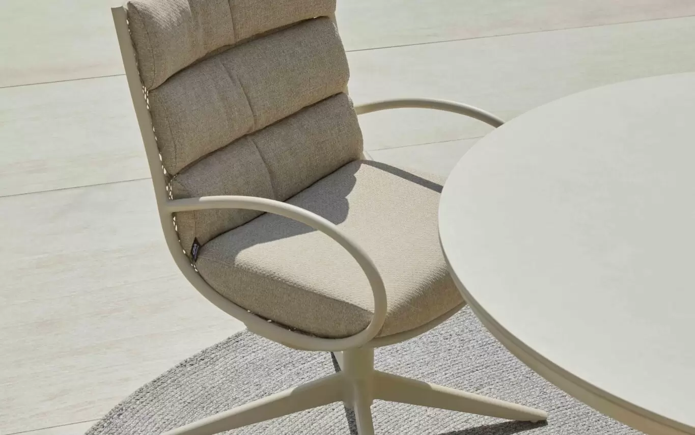 Uzupełnieniem zestawu są 4 luksusowe fotele obrotowe, które rozwiązują największy problem ciężkich mebli tarasowych – konieczność ich siłowego odsuwania od stołu. Łożyskowany mechanizm obrotowy pozwala na swobodne wstawanie i siadanie, co kategorycznie chroni nawierzchnię tarasu przed zarysowaniami i eliminuje uciążliwy hałas szurania. Wybierając luksusowe zestawy ogrodowe obiadowe z funkcją obrotu, inwestujesz w ergonomię, która pozwala na naturalną interakcję z otoczeniem bez konieczności fizycznego przestawiania całego krzesła.