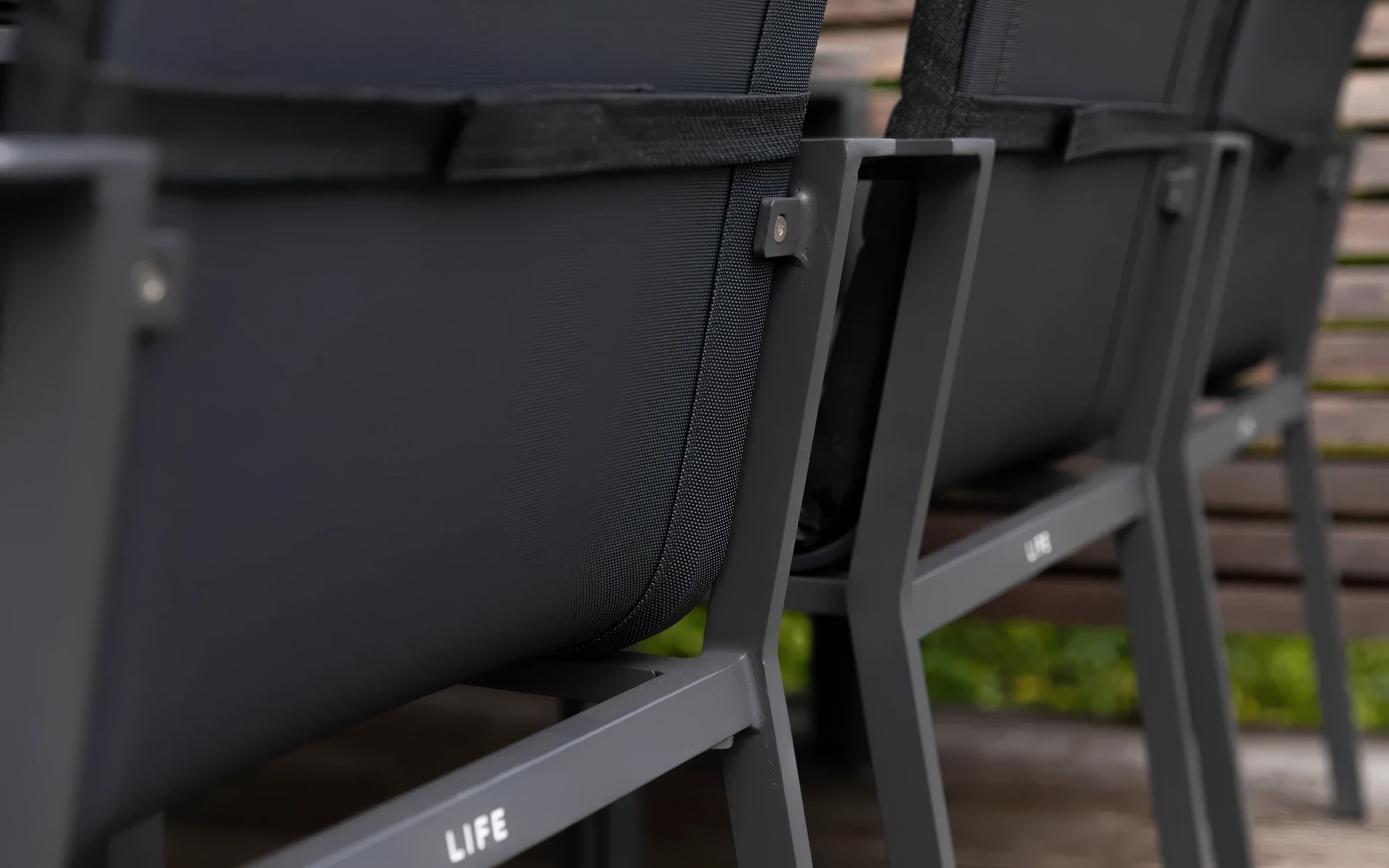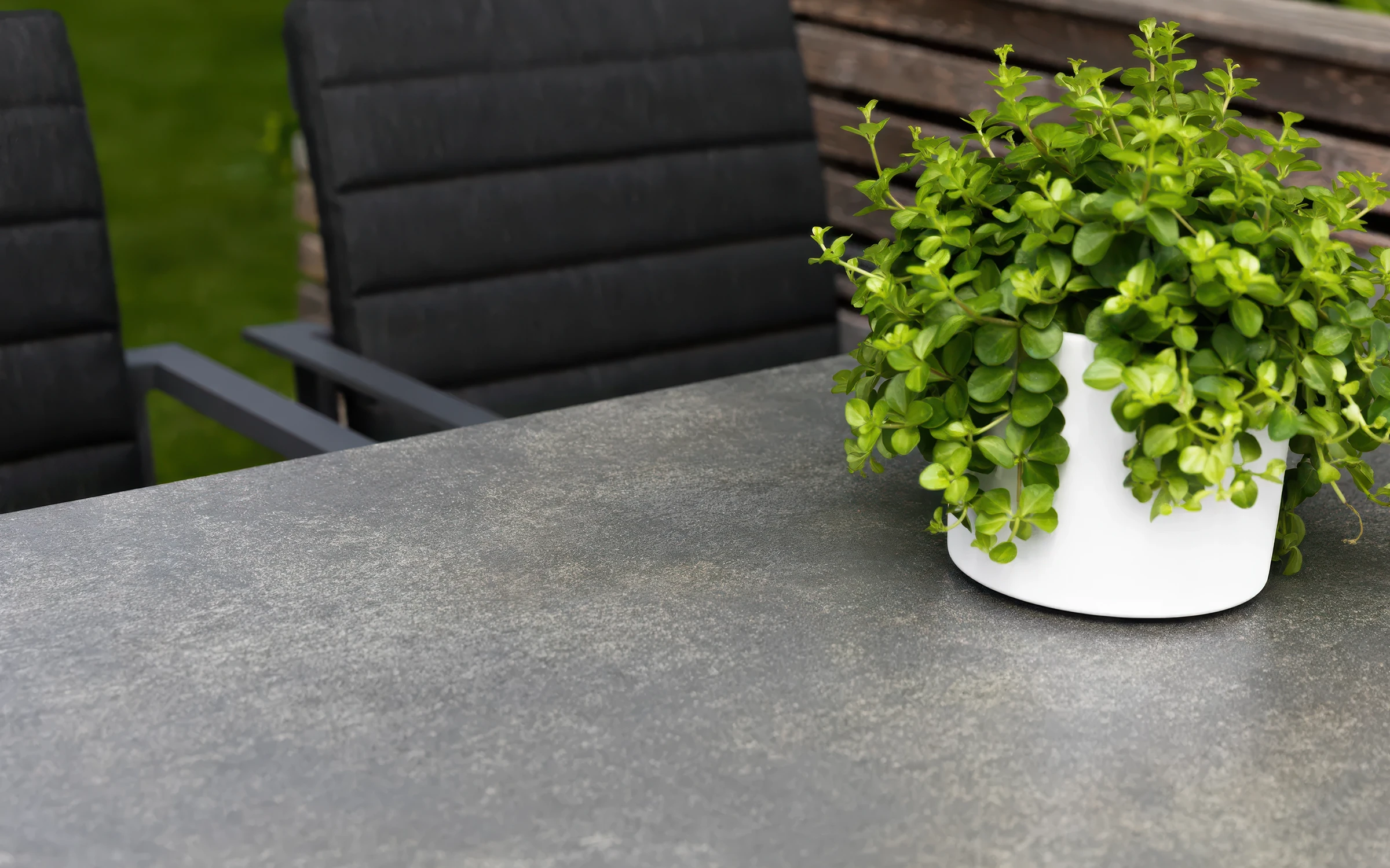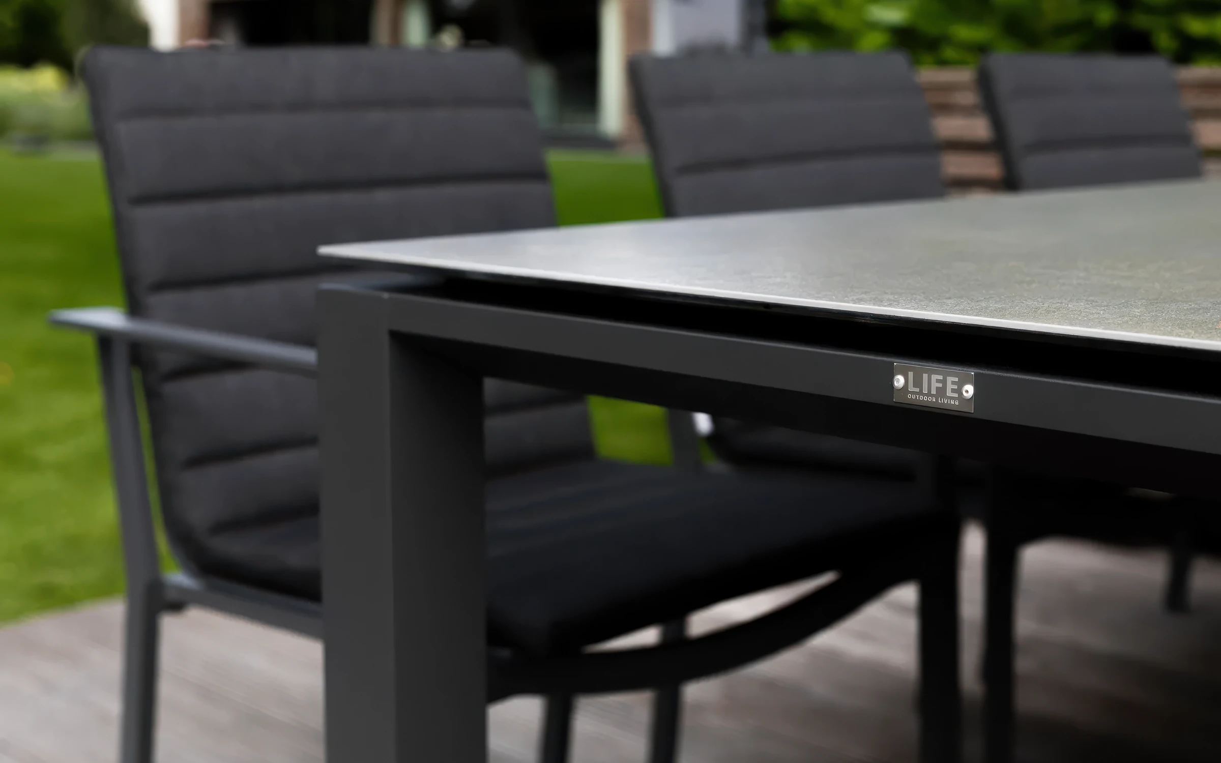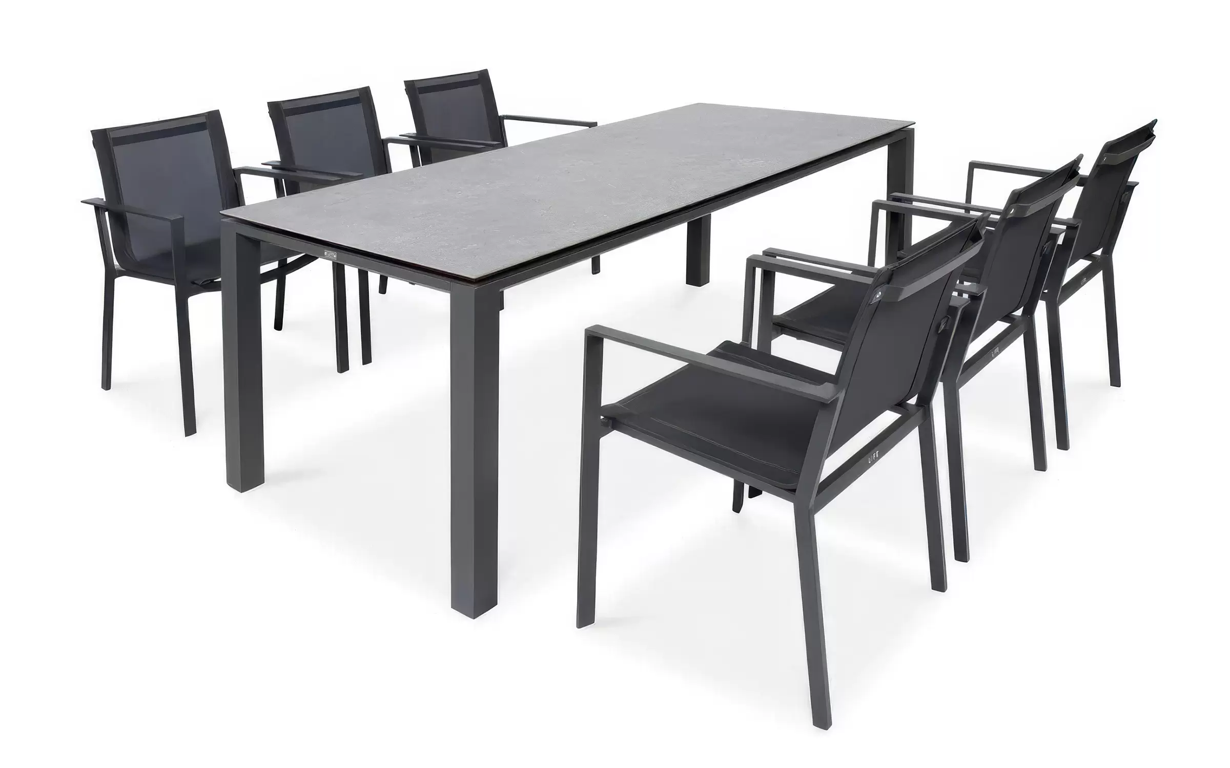Stół wyposażono w trwały blat ceramiczny, odporny na zarysowania, temperaturę i plamy. Aluminiowa konstrukcja mebli jest lekka, stabilna i odporna na warunki atmosferyczne. Krzesła posiadają siedziska i oparcia z tekstyliny – wodoodpornej, przewiewnej siateczki zapewniającej komfort użytkowania.