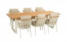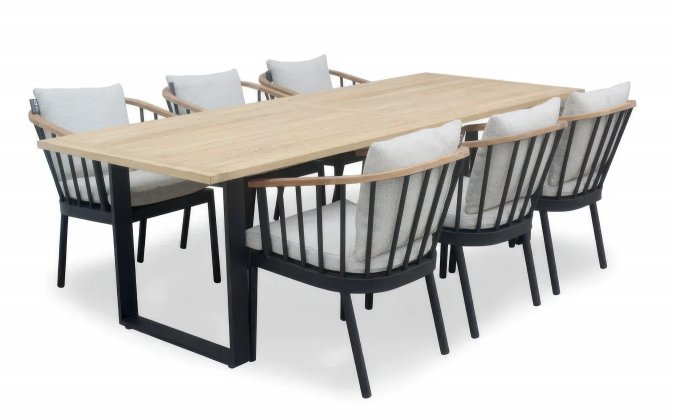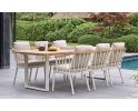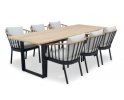 CONDOR to komplet stołowy zaprojektowany dla 6 osób, łączący lekką konstrukcję aluminiową z eleganckim blatem i podłokietnikami z certyfikowanego drewna tekowego. Prosta, nowoczesna sylwetka oraz wysokiej jakości tekstylia tworzą uniwersalny zestaw idealny na taras, do ogrodu lub na patio. Wersje kolorystyczne tkanin: jasnobeżowy (Oyster) lub antracyt (Graphite).