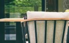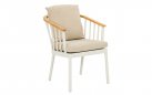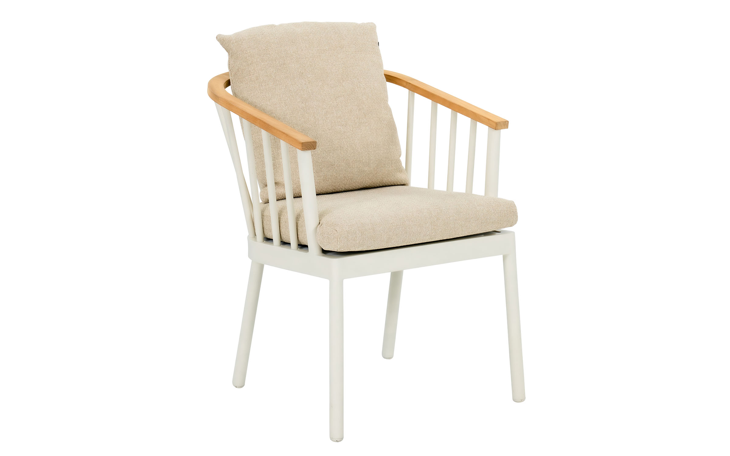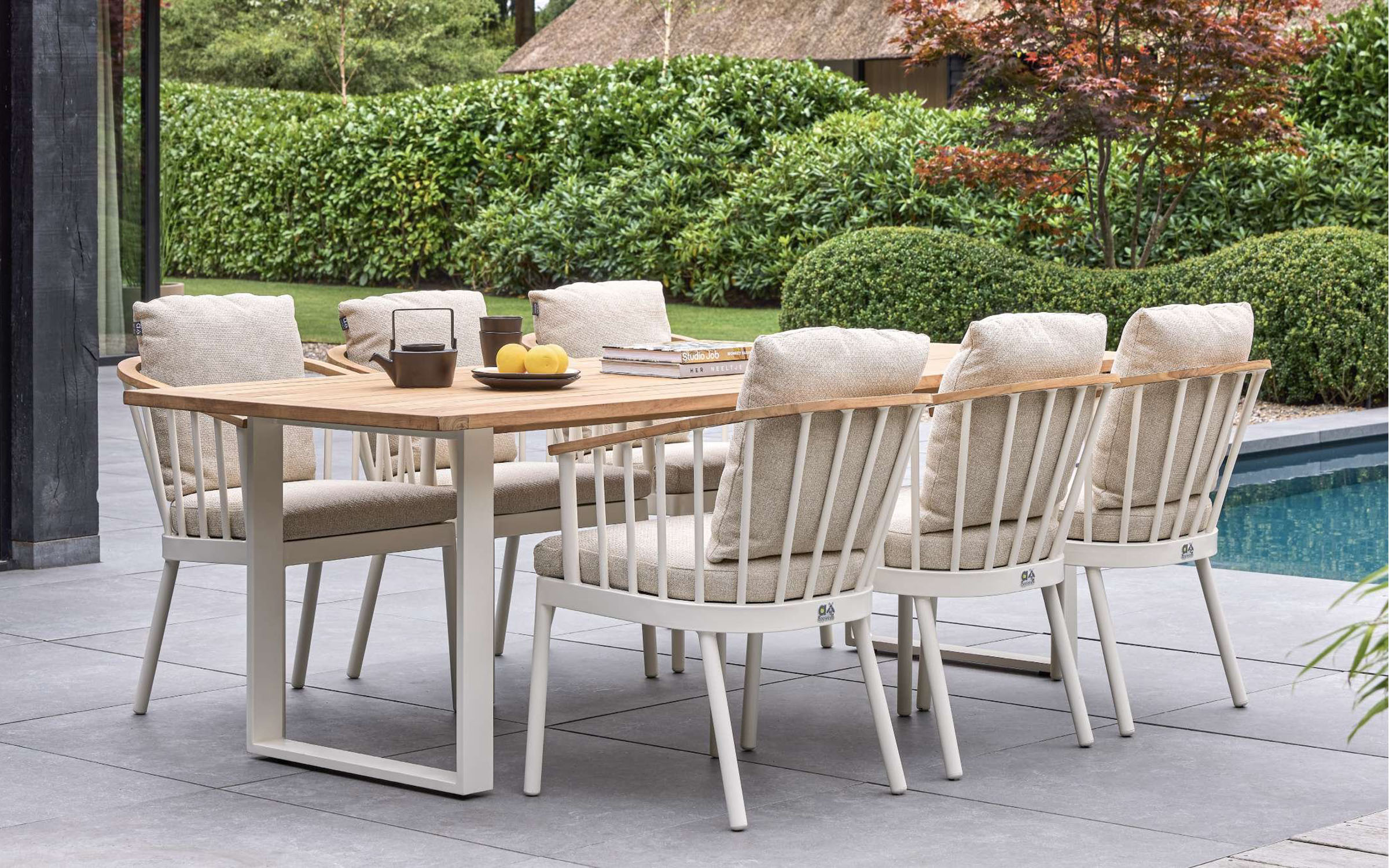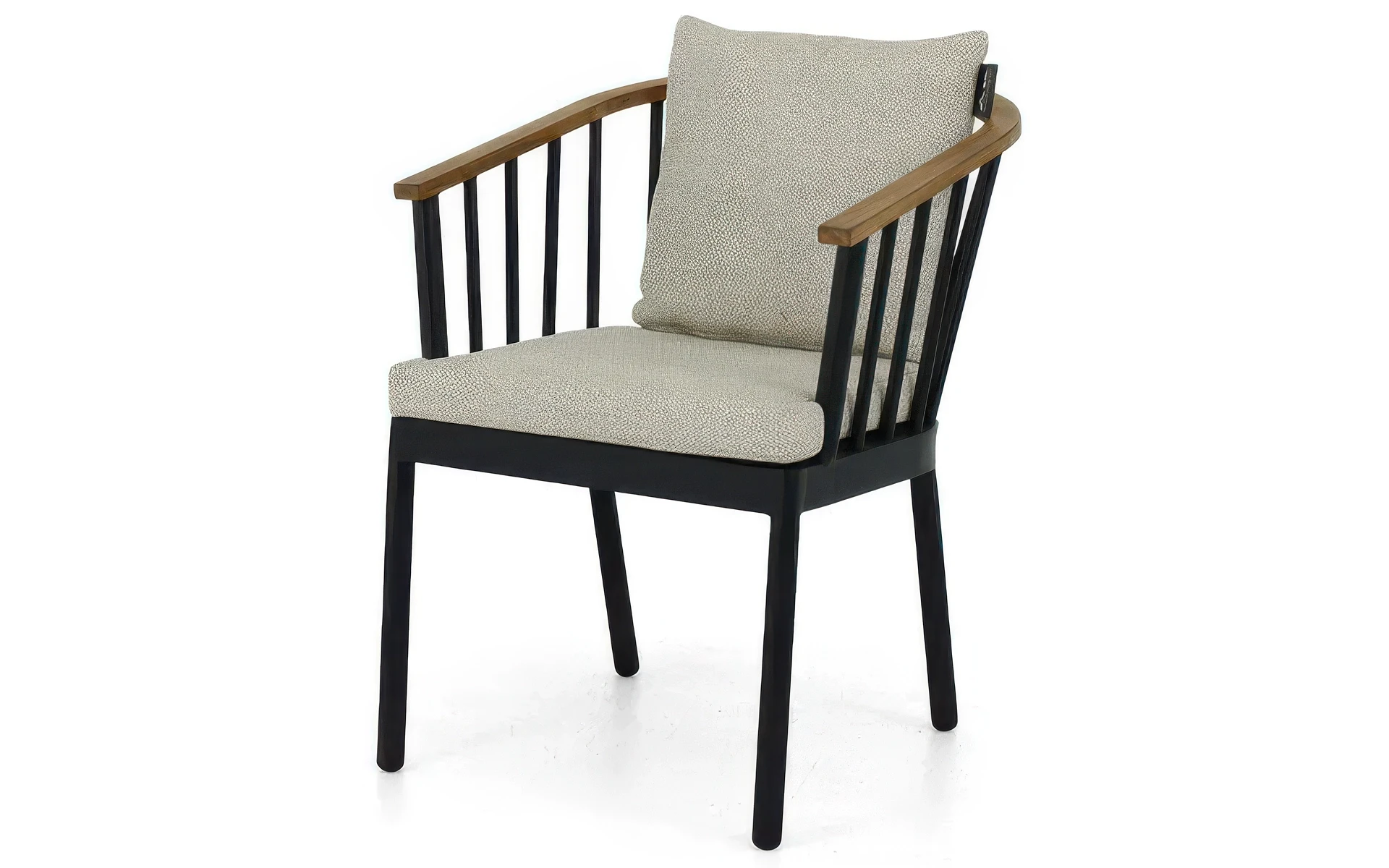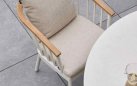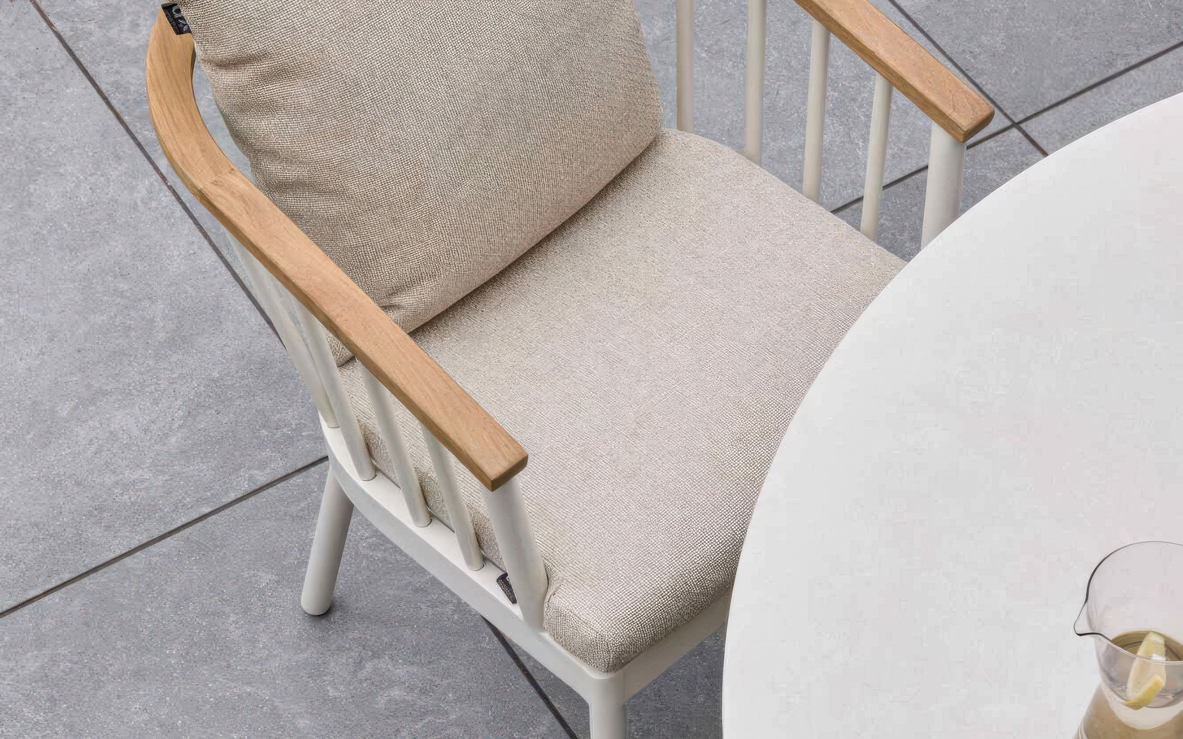 Rama: lekkie aluminium malowane proszkowo — odporność na korozję i minimalistyczny wygląd. Blat stołu i podłokietniki: certyfikowane drewno teakowe (SVLK) o naturalnej fakturze, odporne na zmienne warunki atmosferyczne. Poduszki: system BEE WETT® z poszewkami wykonanymi z tkaniny Olefin (w wersji jasnobeżowej) lub wysokiej jakości tkaniny outdoor o podobnych parametrach (w wersji antracytowej). Poszewki są zdejmowane i zapinane na zamek.