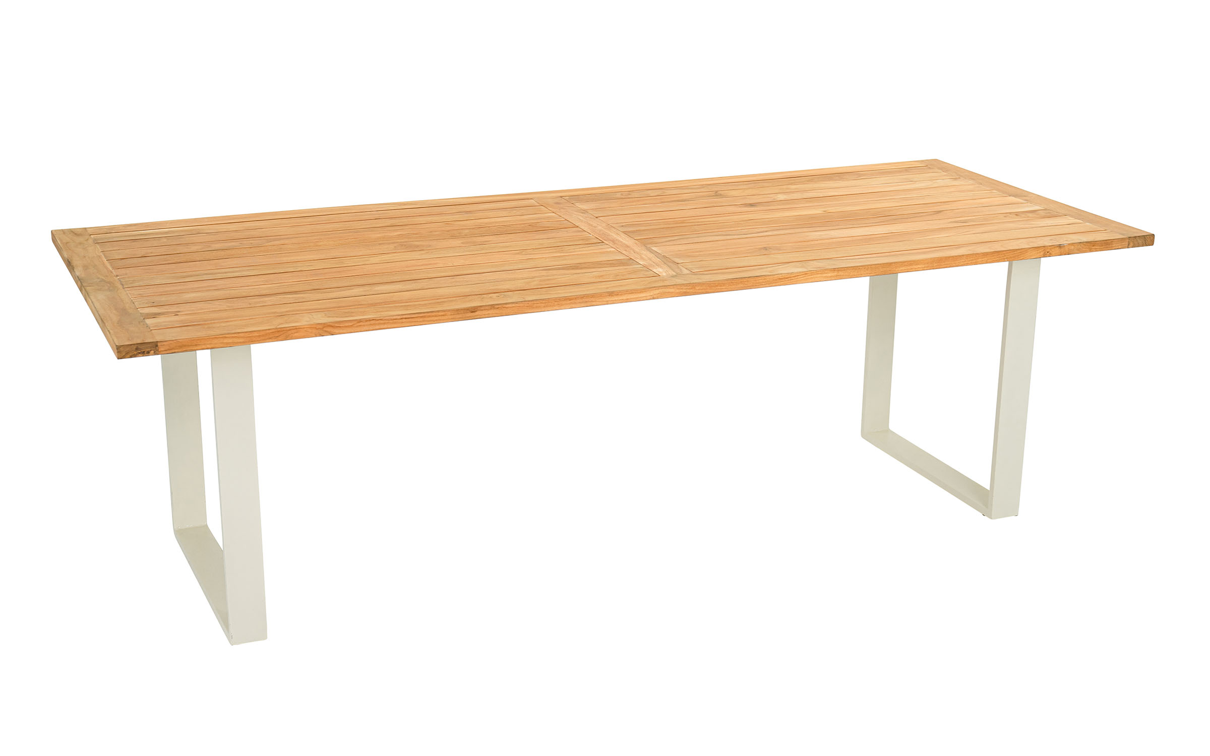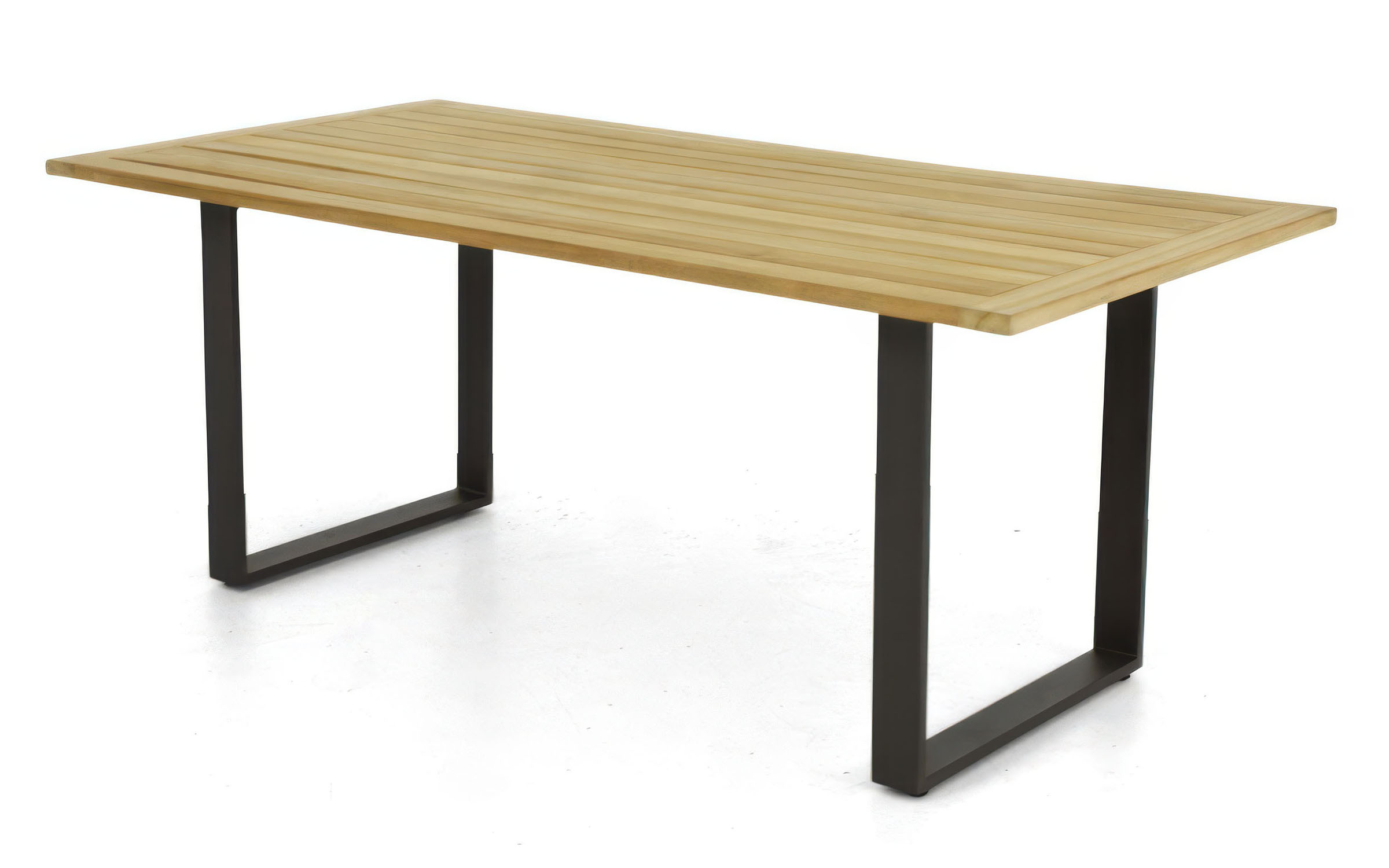 Blat stołu wykonano z litego drewna tekowego — naturalny surowiec o wysokiej odporności na wilgoć i UV. Teak zawiera naturalne olejki, które zwiększają jego trwałość; dla utrzymania koloru i powierzchni zalecane jest okresowe olejowanie zgodnie z instrukcją pielęgnacji.