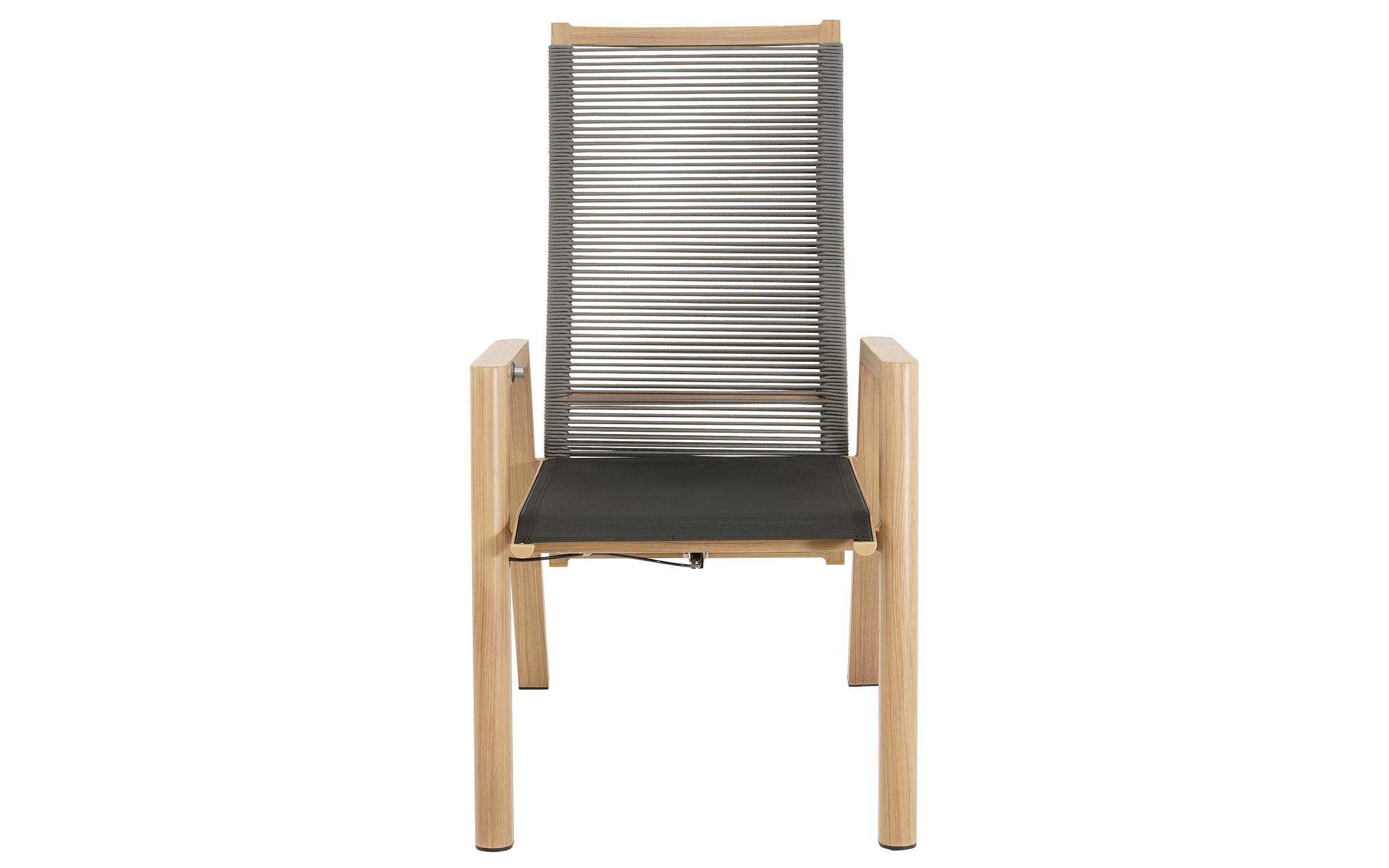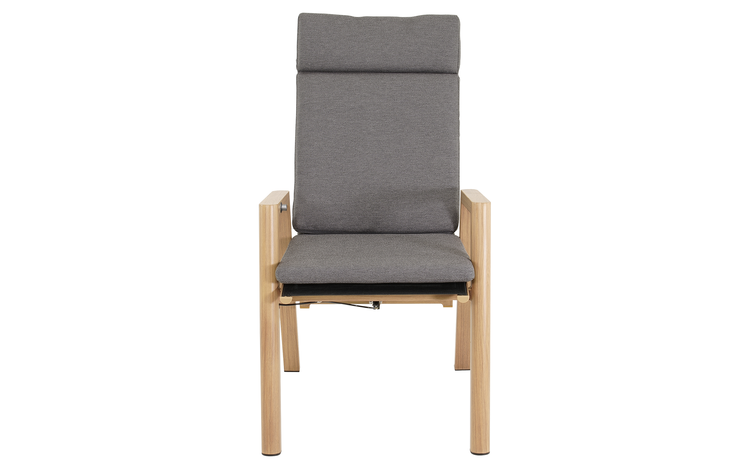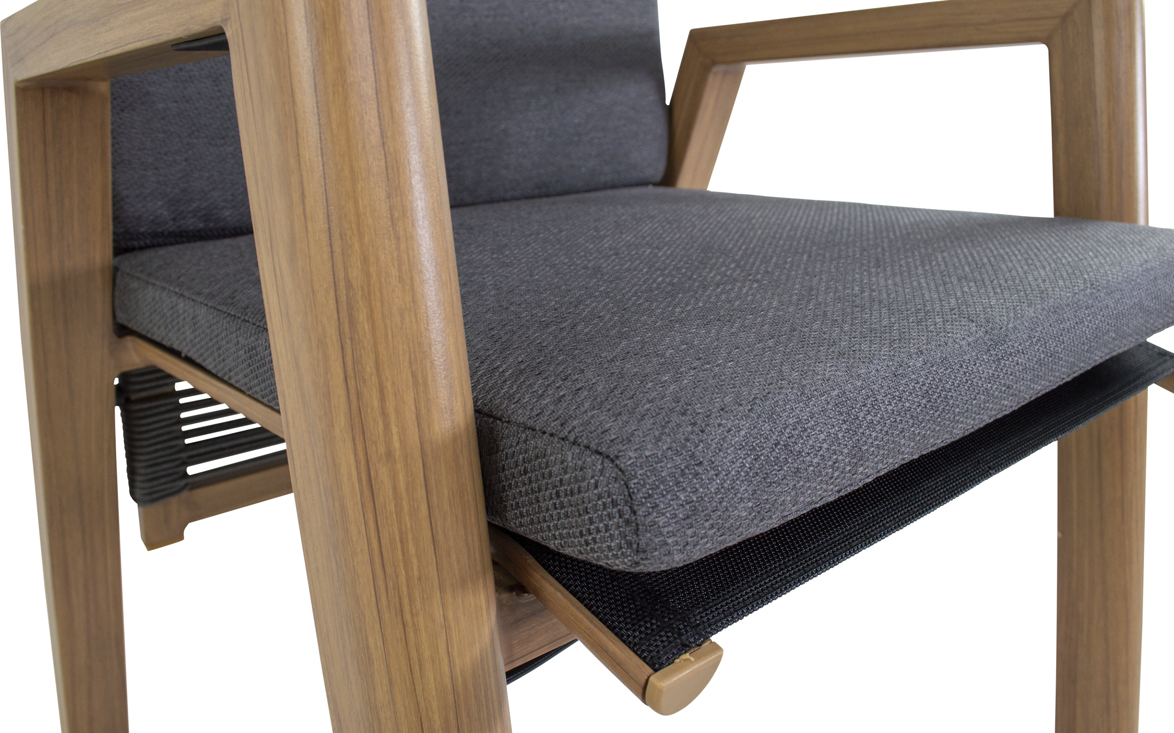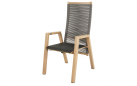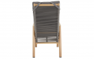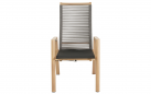 Do zestawu dołączone są 4 krzesła ACARI z wysokim oparciem i aluminiową ramą w kolorze antracytowym z podłokietnikami w wykończeniu woodlook. Siedzisko i oparcie wykonane są z trwałej tekstyliny, a dodatkowy komfort zapewniają poduszki z materiału olefin 270 g/m² w jasnoszarym kolorze, z przeszyciami i grubością 40 mm. Krzesła posiadają regulowane oparcie obsługiwane mechanizmem gazowym, co pozwala na indywidualne dopasowanie pozycji siedzenia. Maksymalne obciążenie każdego krzesła wynosi 120 kg.