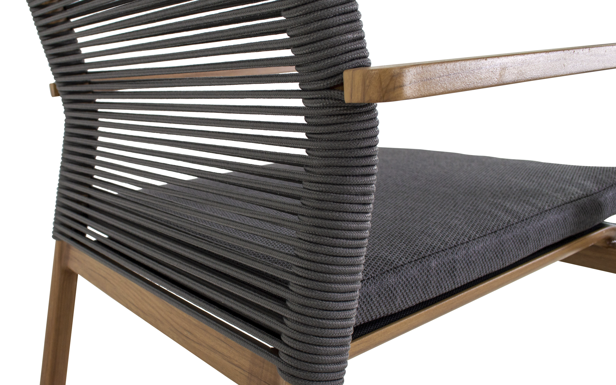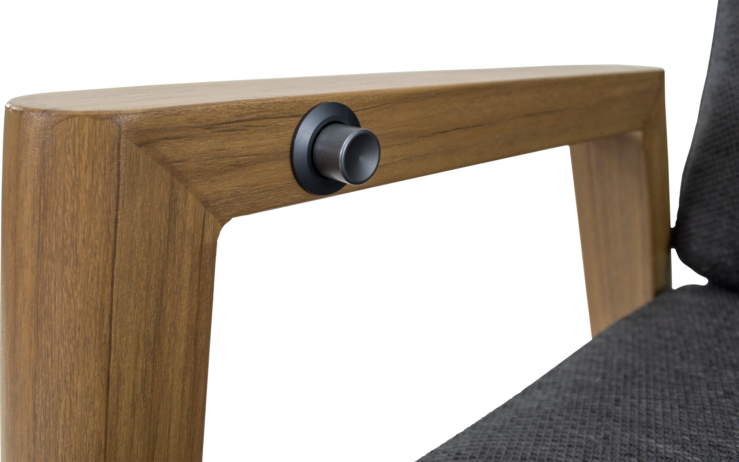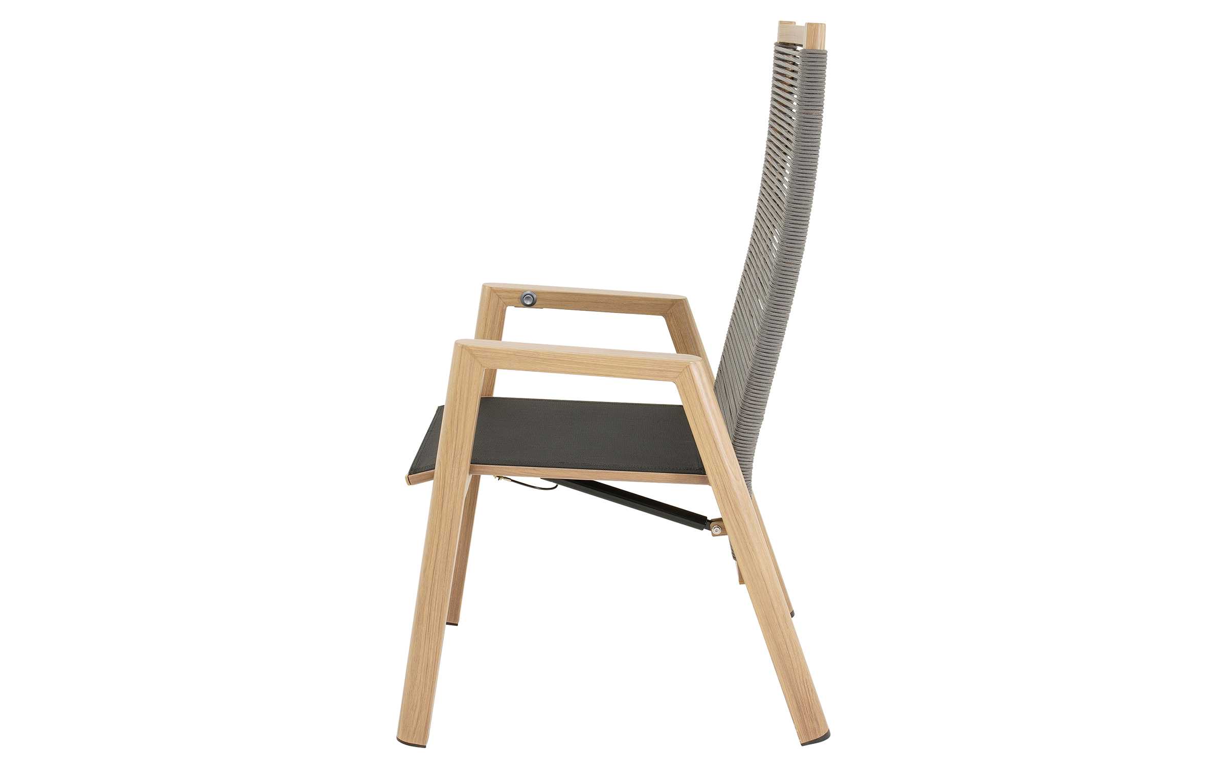 Do zestawu dołączone są 4 krzesła ACARI z wysokim oparciem i aluminiową ramą w kolorze antracytowym z podłokietnikami w wykończeniu woodlook. Siedzisko i oparcie wykonane są z trwałej tekstyliny, a dodatkowy komfort zapewniają poduszki z materiału olefin 270 g/m² w jasnoszarym kolorze, z przeszyciami i grubością 40 mm. Krzesła posiadają regulowane oparcie obsługiwane mechanizmem gazowym, co pozwala na indywidualne dopasowanie pozycji siedzenia. Maksymalne obciążenie każdego krzesła wynosi 120 kg.