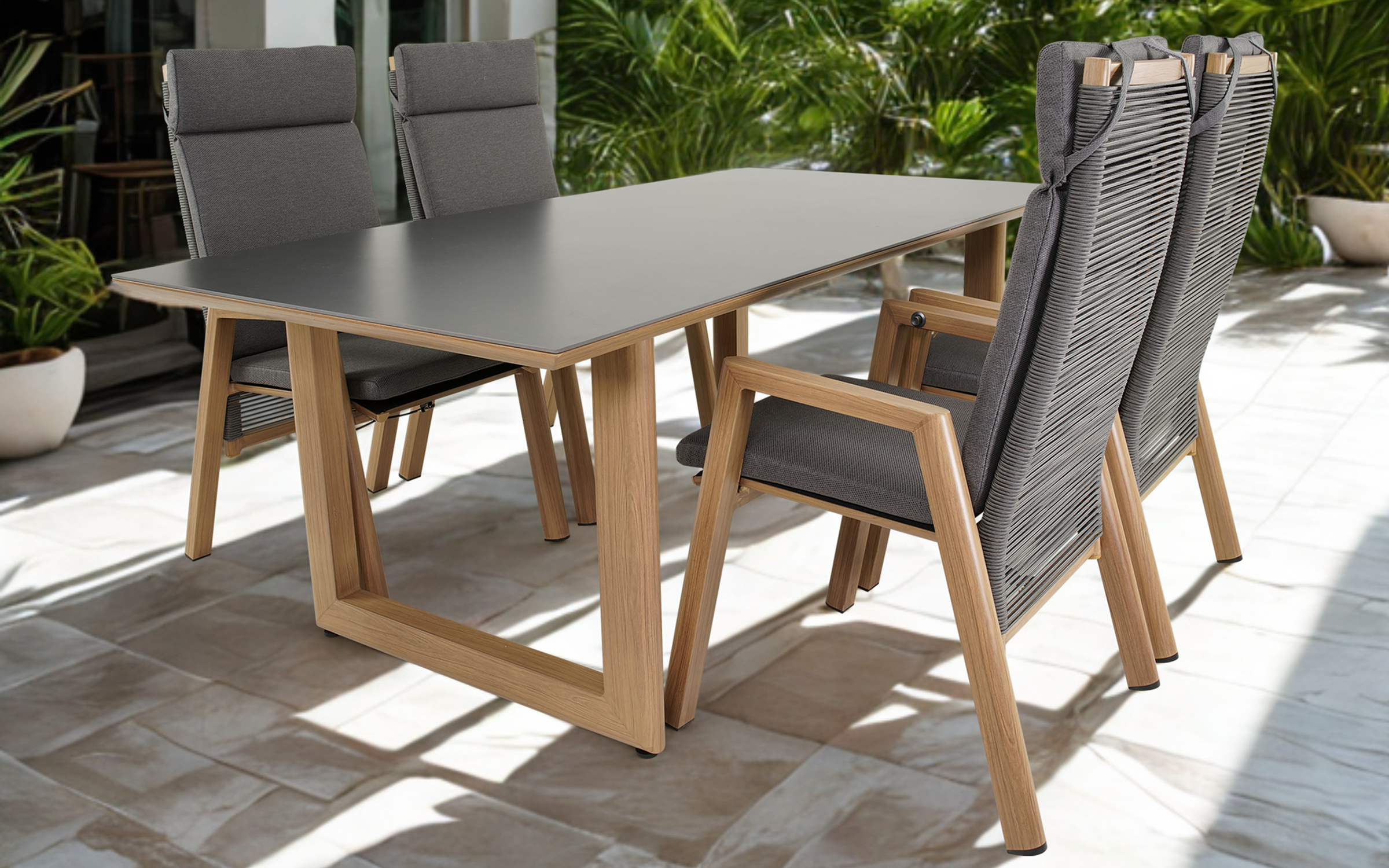- 1× stół ogrodowy ESPINAR 200×90 (blat kamień spiekany, rama aluminium woodlook)