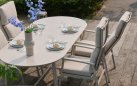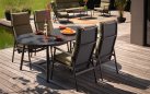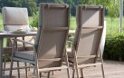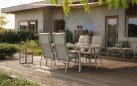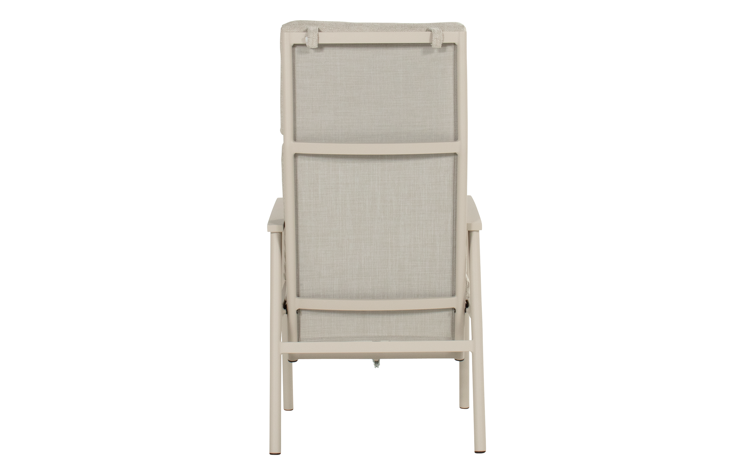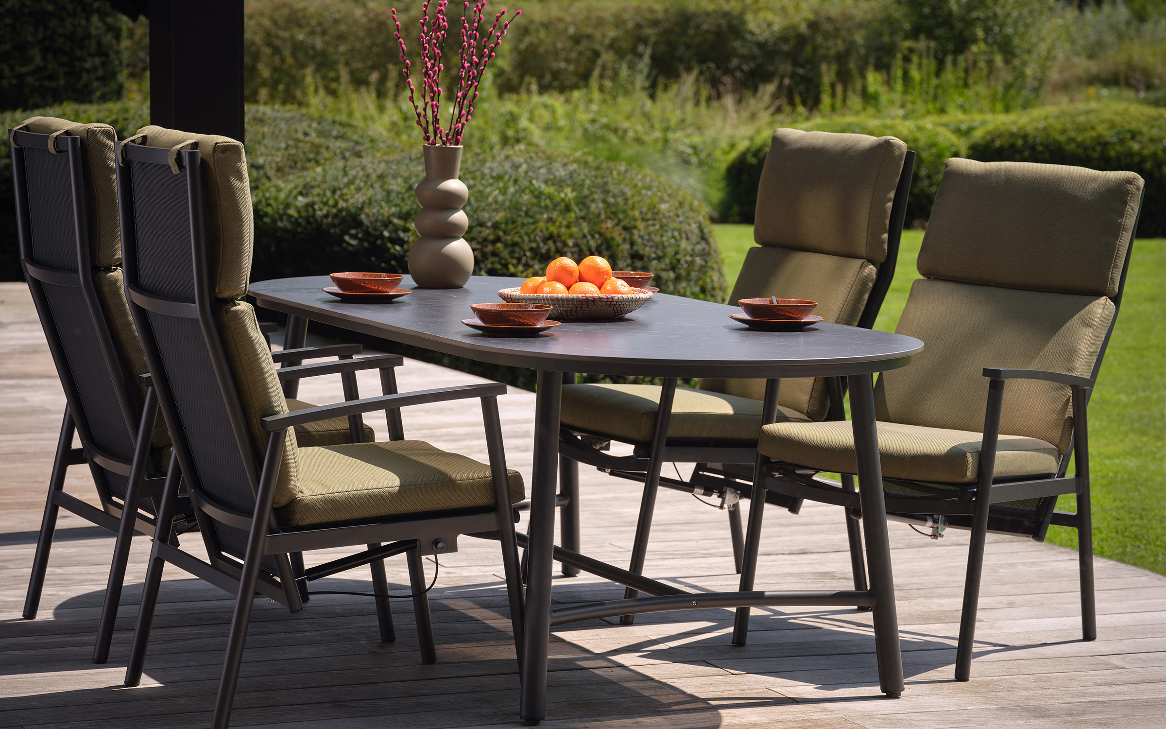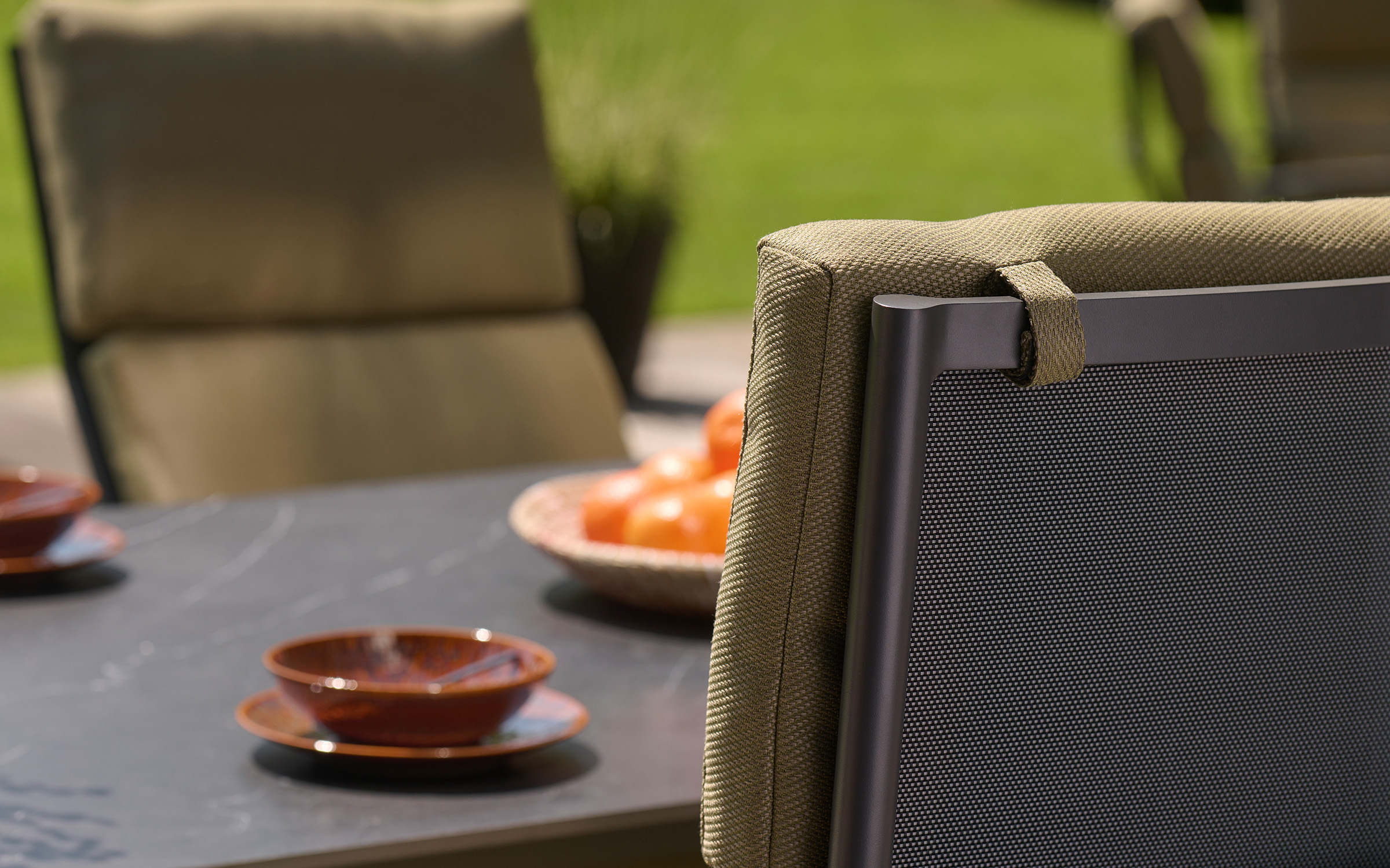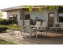 Stół wykonany z aluminium i ceramiki, odporny na warunki atmosferyczne. Fotele z aluminiową ramą, tekstylnym oparciem i poduszkami outdoor. Regulowane oparcia zapewniają wygodę i możliwość dopasowania pozycji. Całość łatwa w pielęgnacji i trwała.