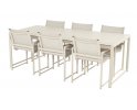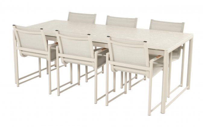 Zestaw jadalniany Fontaine marki Hartman to elegancki komplet do spożywania posiłków na świeżym powietrzu. Konstrukcje krzeseł i stołu wykonano z aluminium, a elementy siedzisk wykorzystują tkaniny outdoorowe, co zapewnia trwałość i komfort użytkowania. Całość dostępna w kolorze jasnobeżowym. blat stołu z ceramiki z imitacją powierzchni kamiennej.
