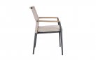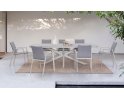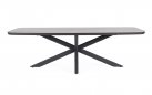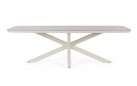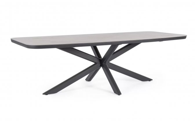 Duży stół do ogrodowej jadalni z kamiennym spiekanym blatem. Ładnie zaokrąglone kanty stołu.