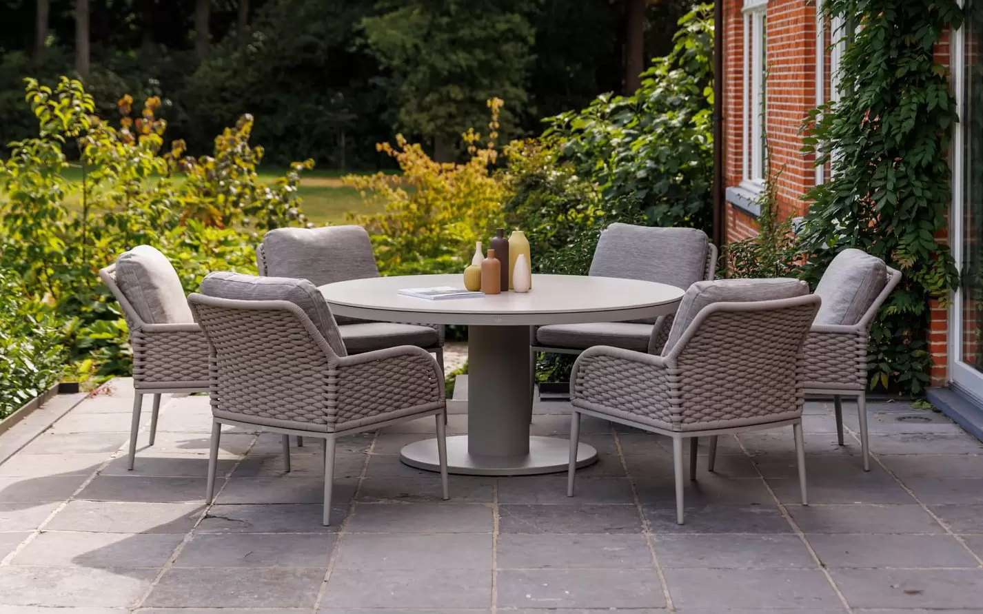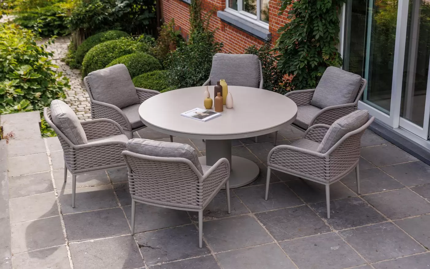 W komplecie znajduje się sześć ergonomicznych krzeseł, które łączą funkcję wypoczynkową z wysoką trwałością. Siedziska wyposażono w miękkie poduszki z technicznej tkaniny Soltex, wykazującej wysoką barierowość wobec promieniowania UV i opadów. Unikalnym detalem jest dekoracyjny splot liny na oparciach, który podkreśla designerski charakter zestawu, zapewniając jednocześnie optymalną cyrkulację powietrza podczas użytkowania w upalne dni.