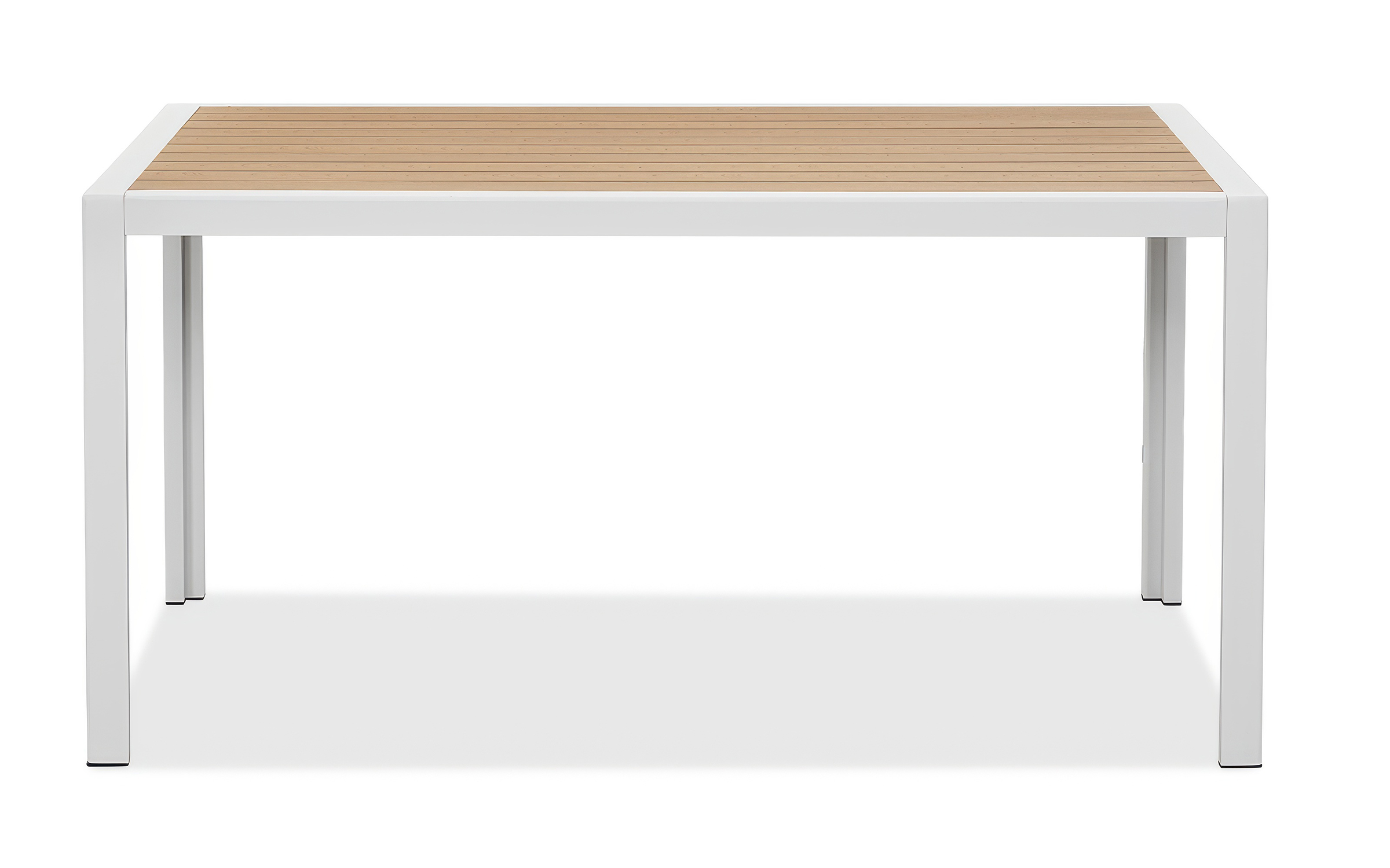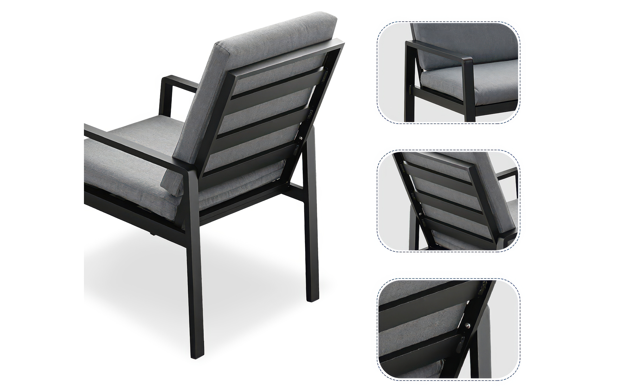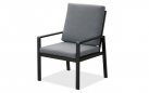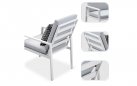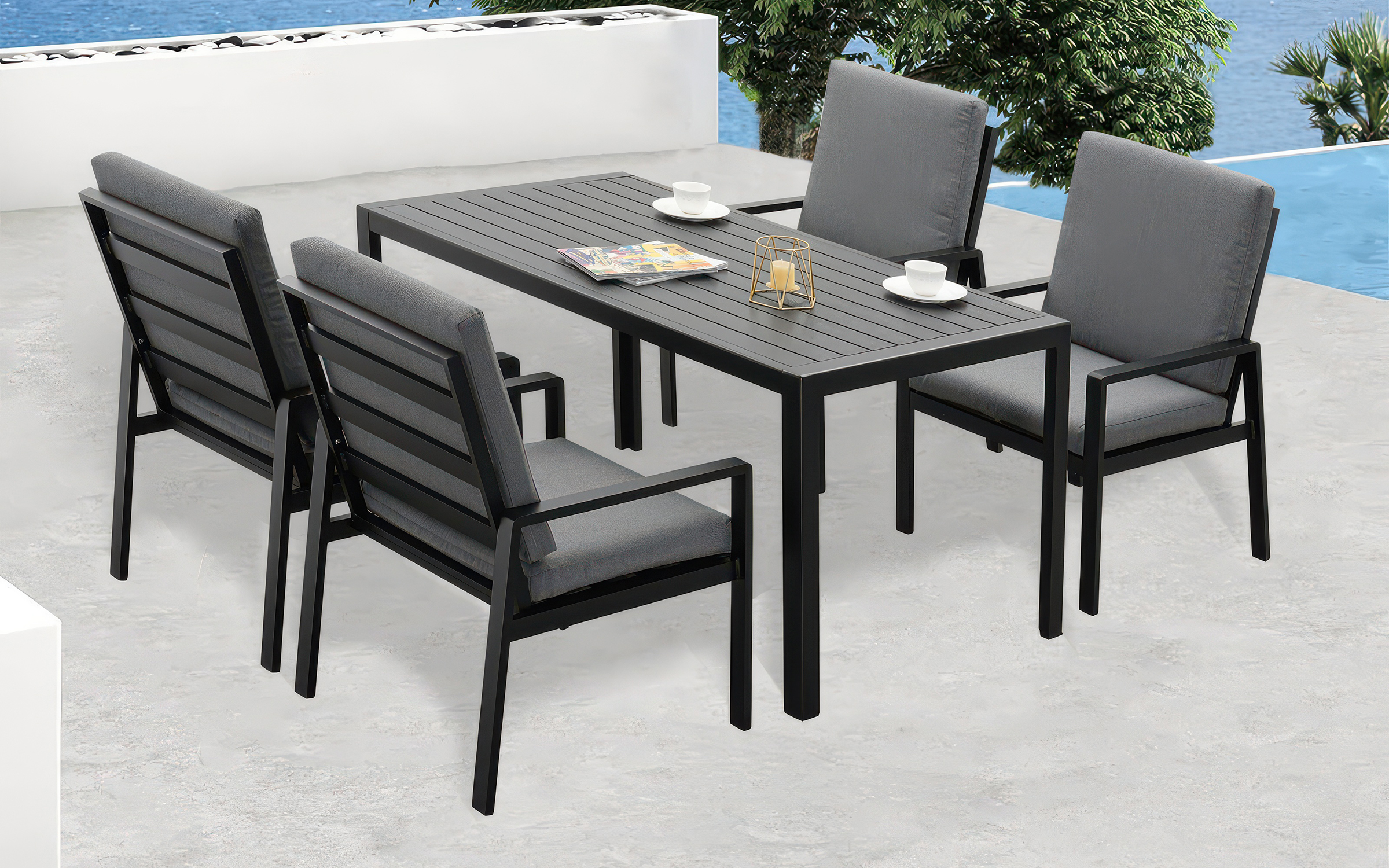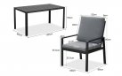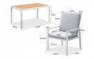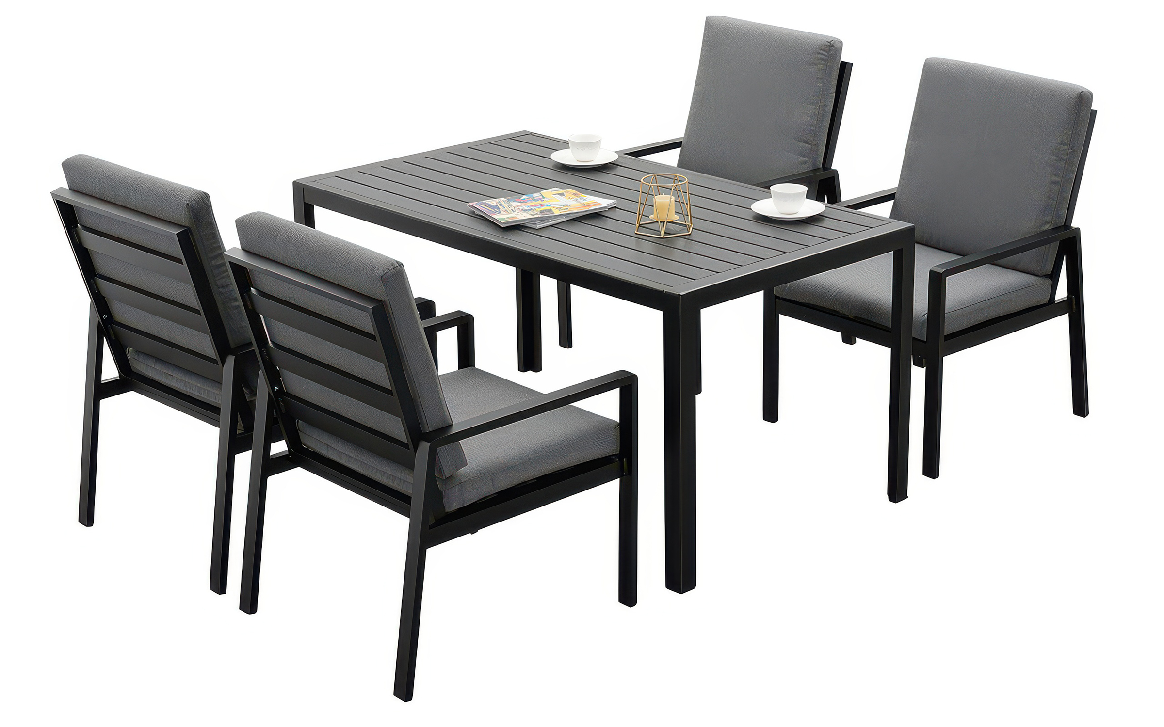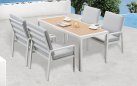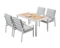 Meble stołowe na taras dla 4 osób wykonany z aluminium. Stół z blatem z deseczek kompozytowych. Na fotelach wodoodporne poduszki ze zdejmowanymi poszewkami.