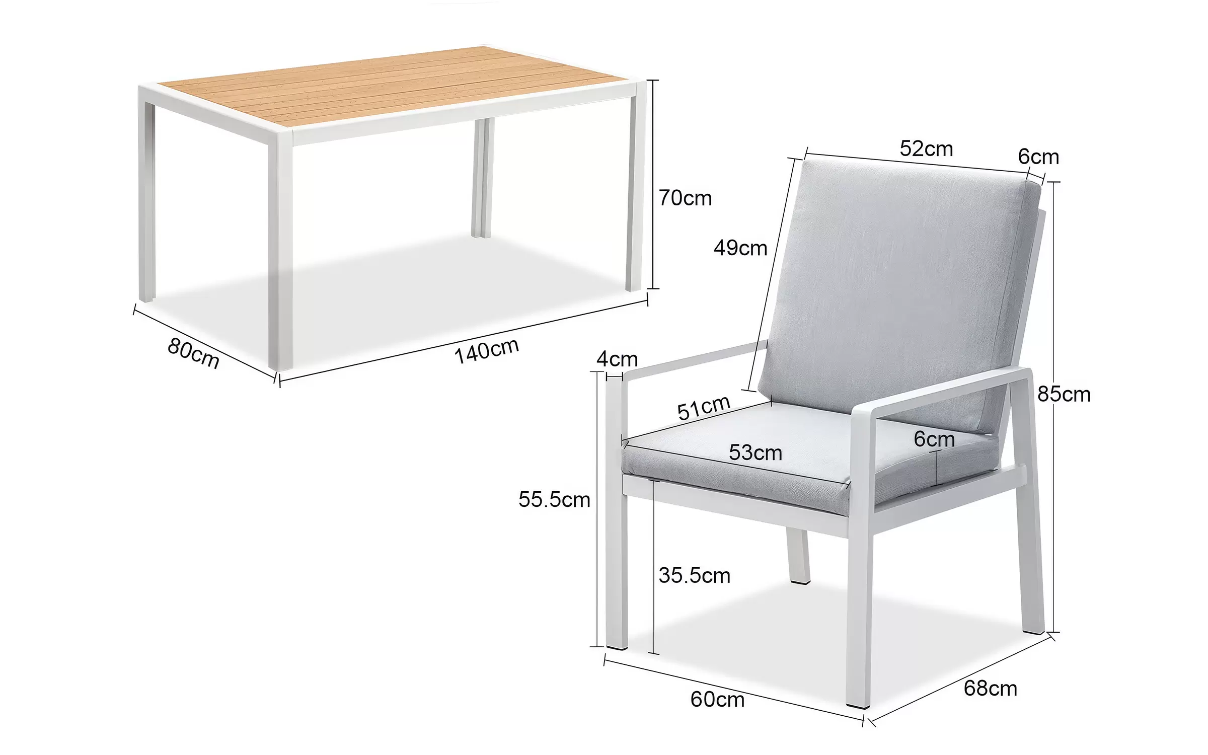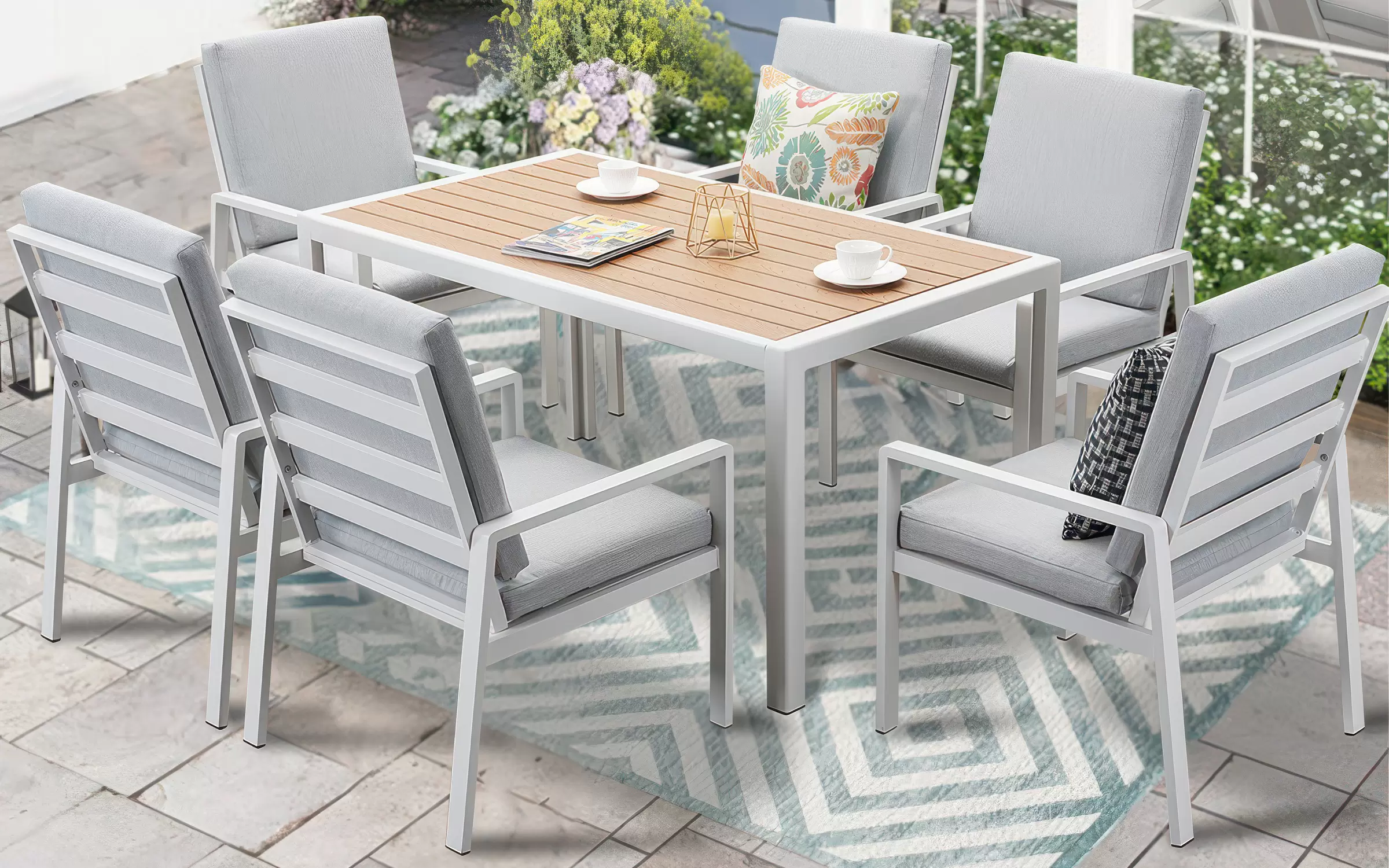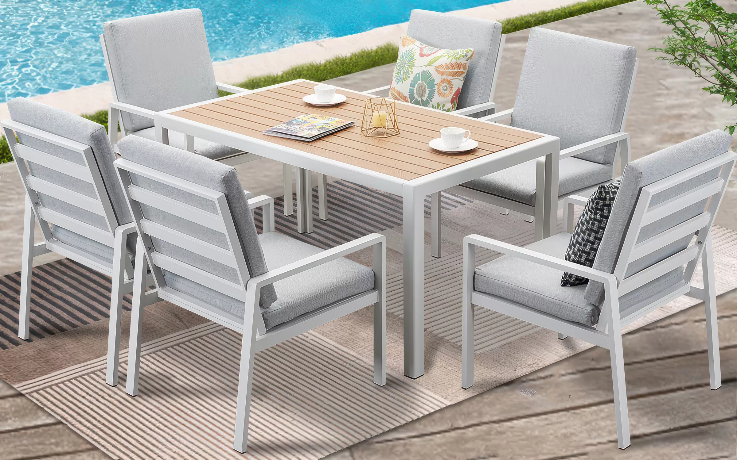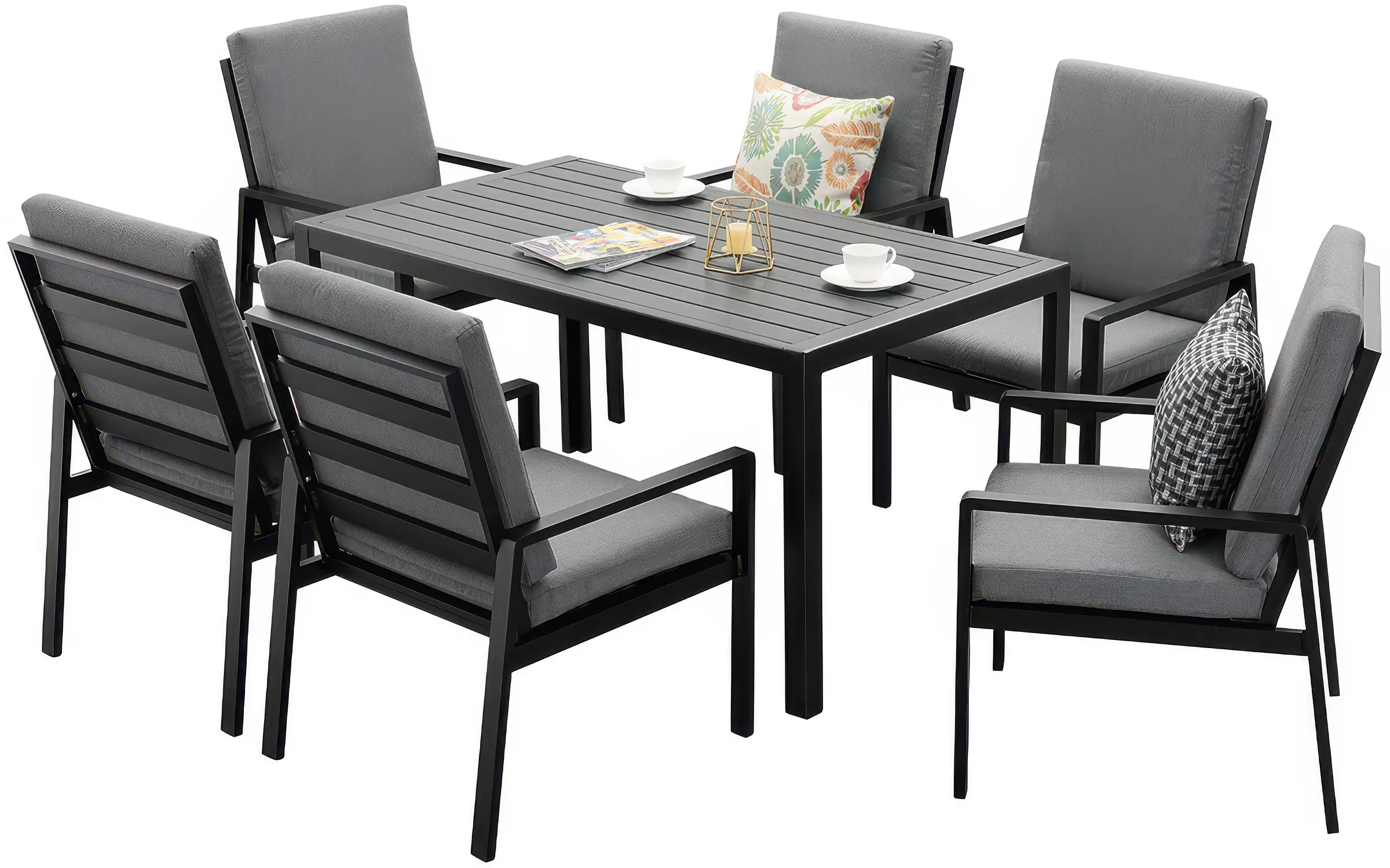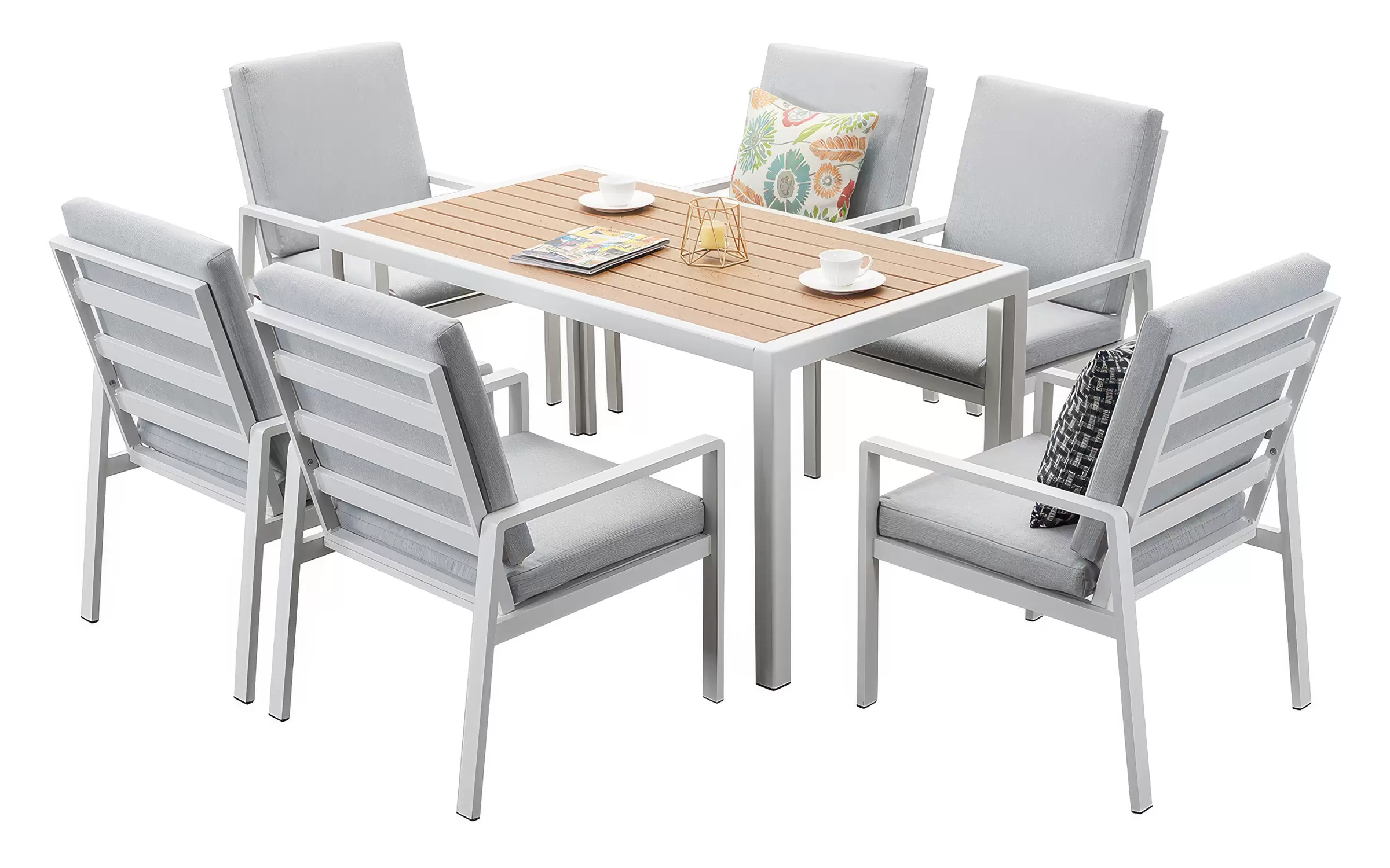 Meble stołowe na taras dla 6 osób wykonany z aluminium. Stół z blatem z deseczek kompozytowych. Na fotelach wodoodporne poduszki ze zdejmowanymi poszewkami.