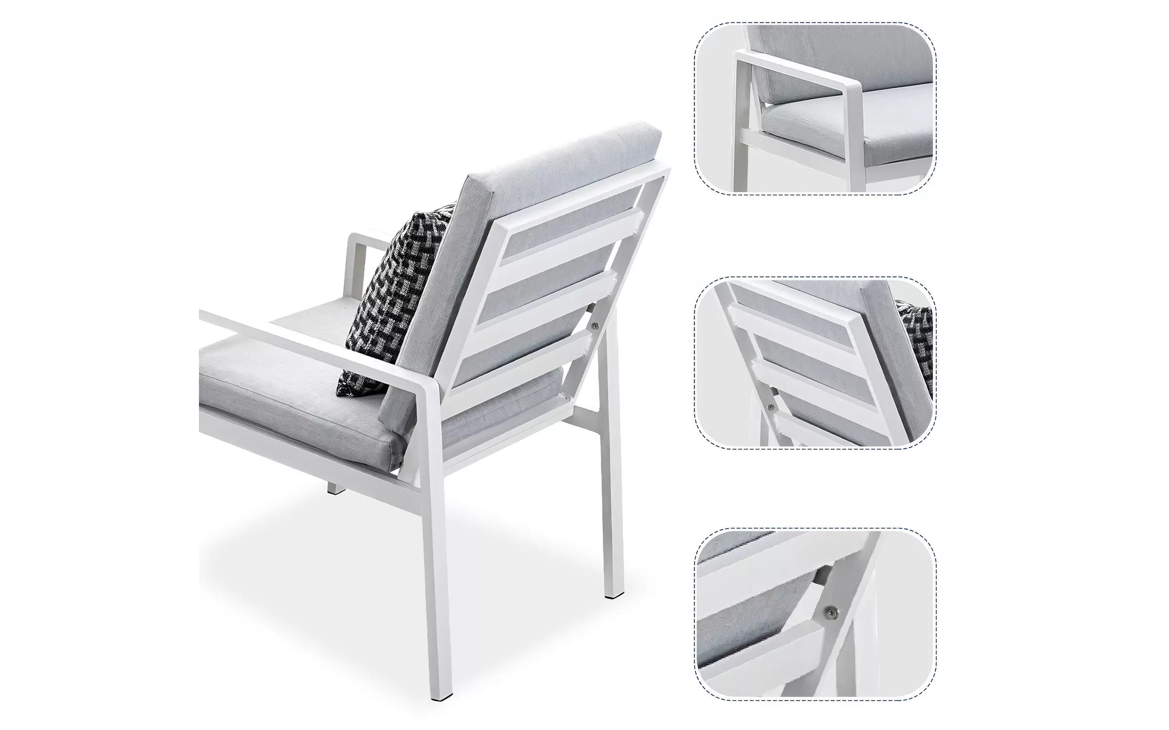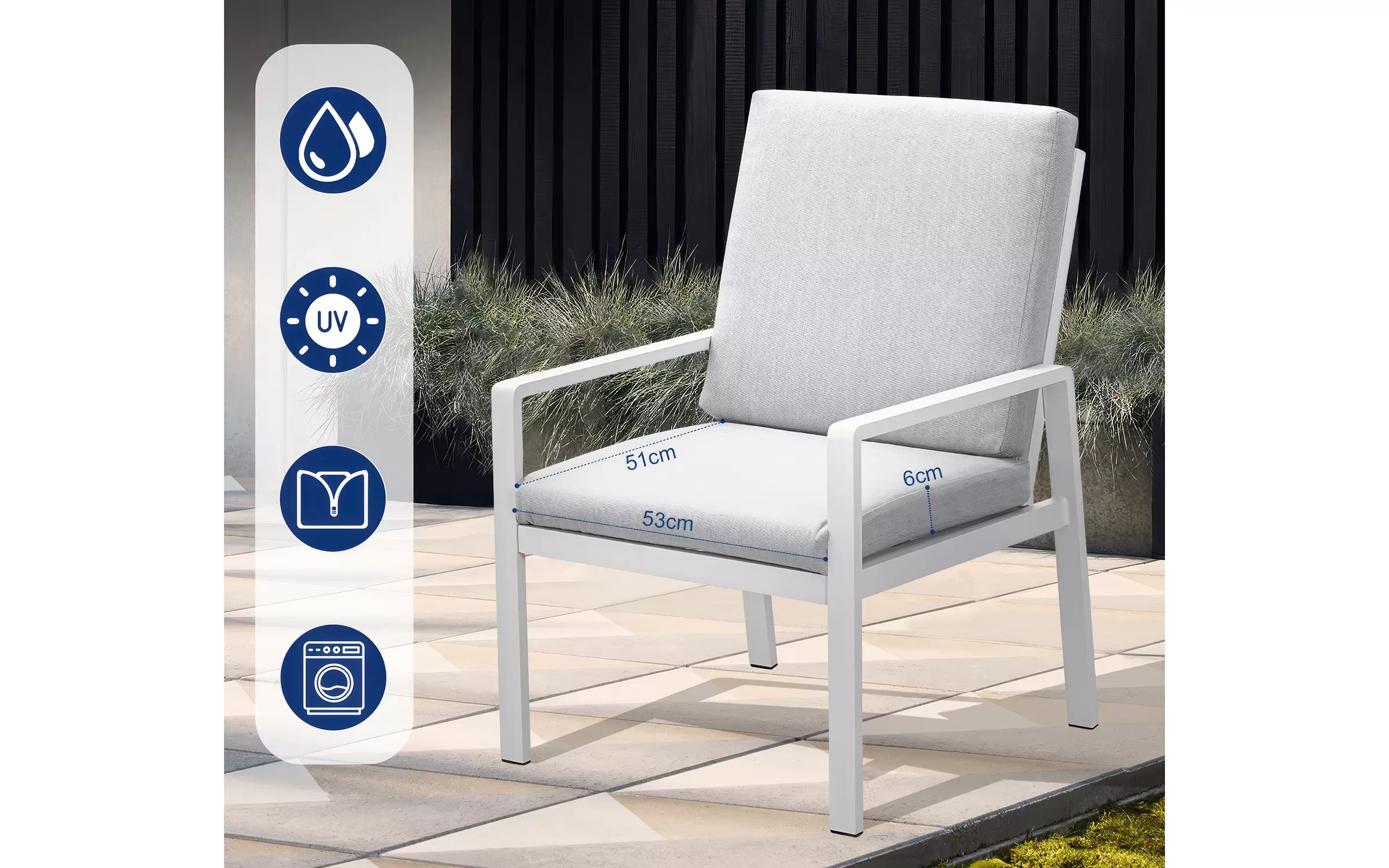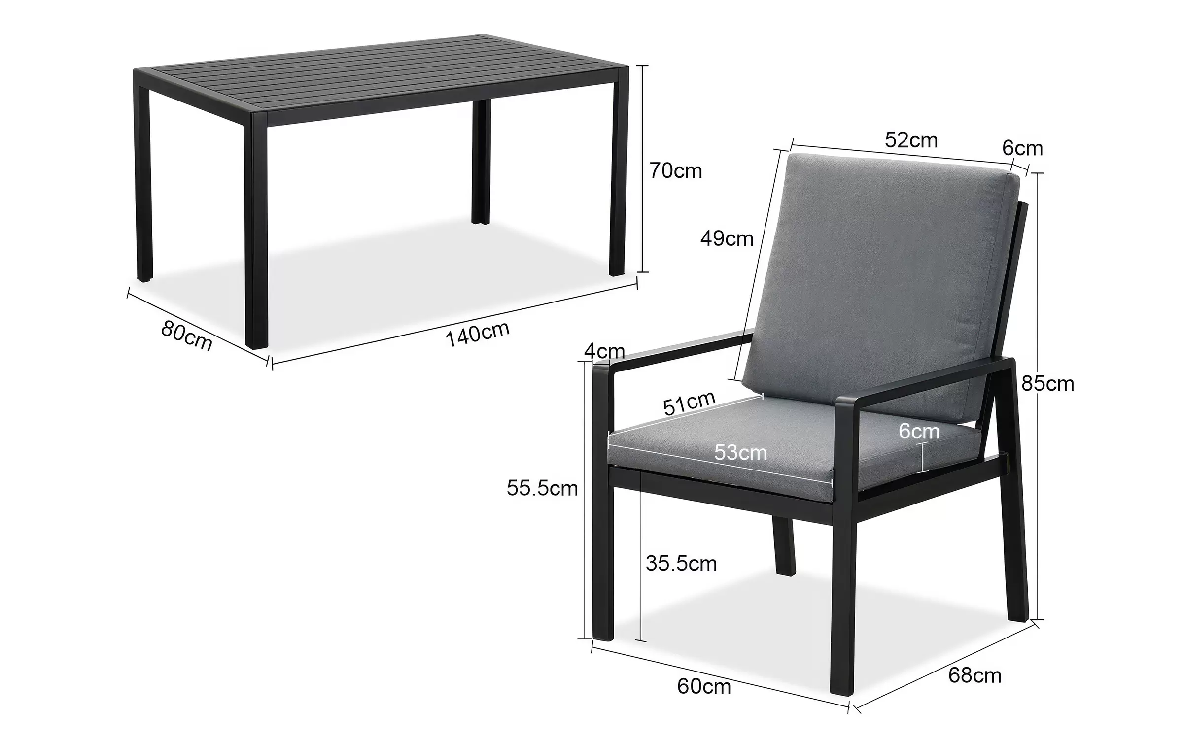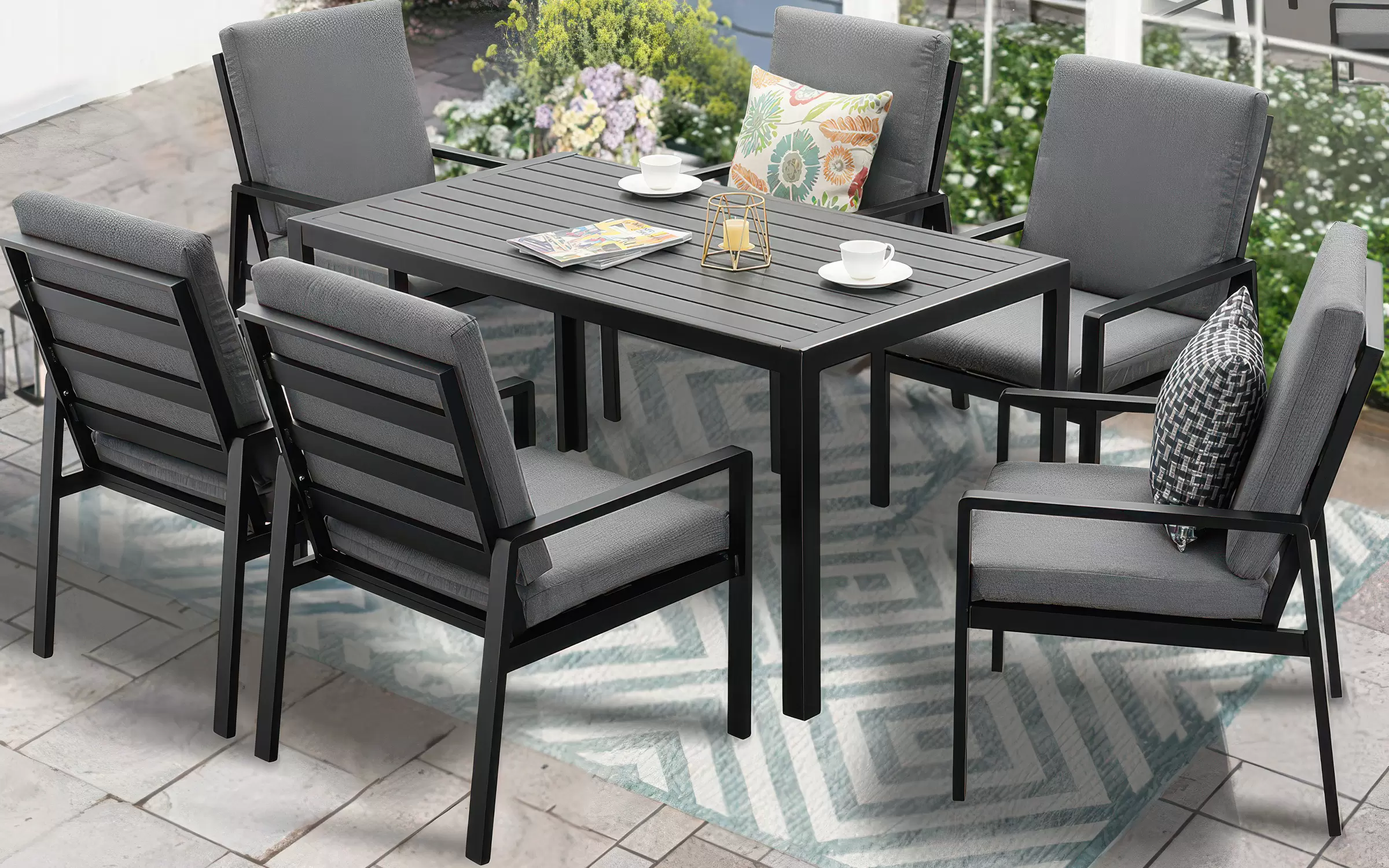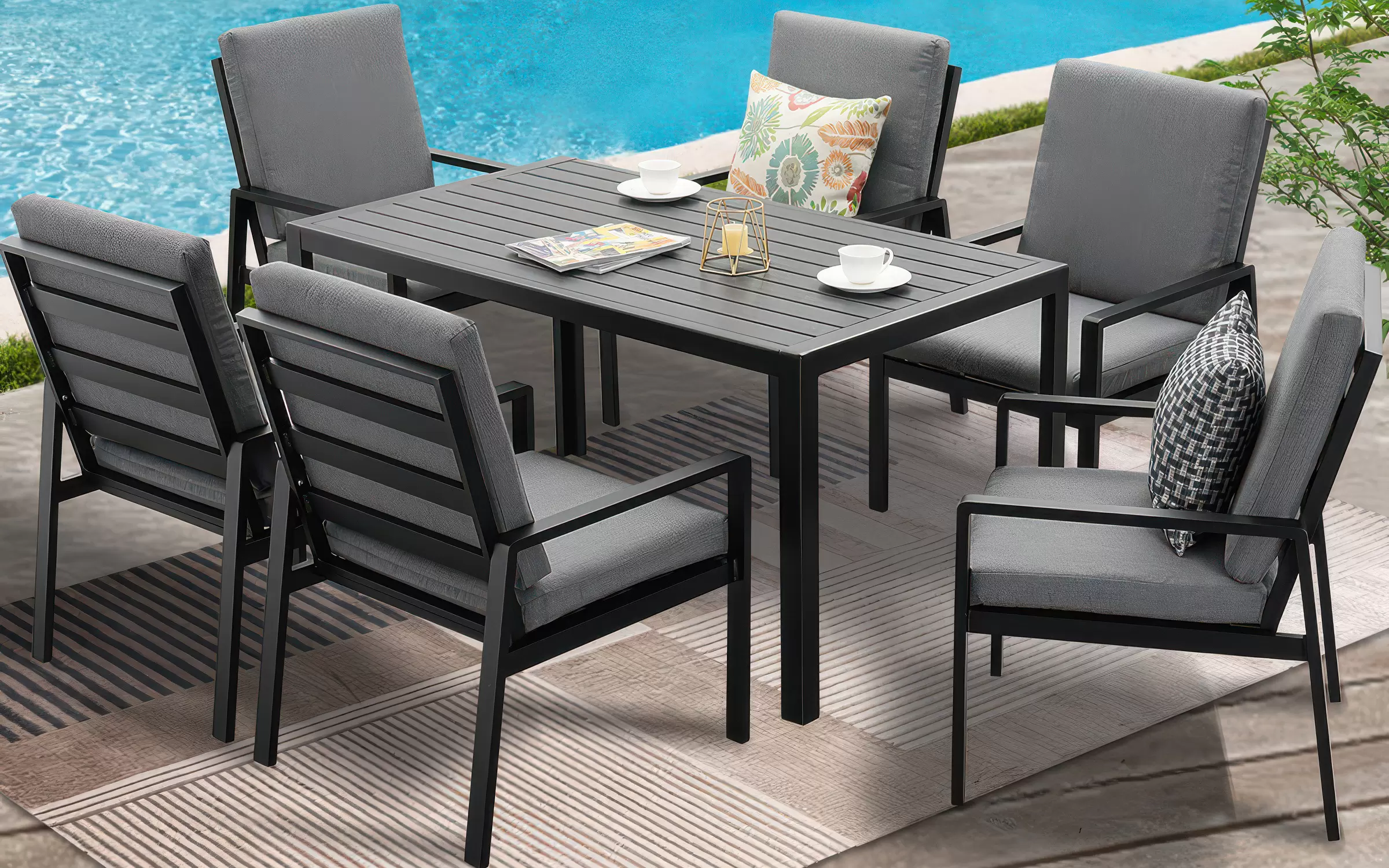 Meble stołowe na taras dla 6 osób wykonany z aluminium. Stół z blatem z deseczek kompozytowych. Na fotelach wodoodporne poduszki ze zdejmowanymi poszewkami.