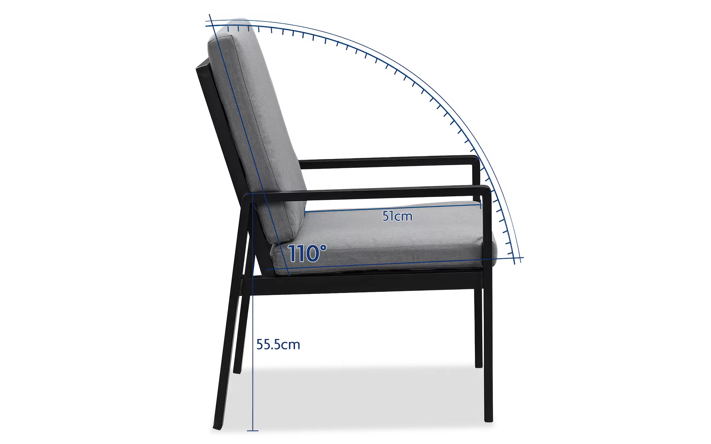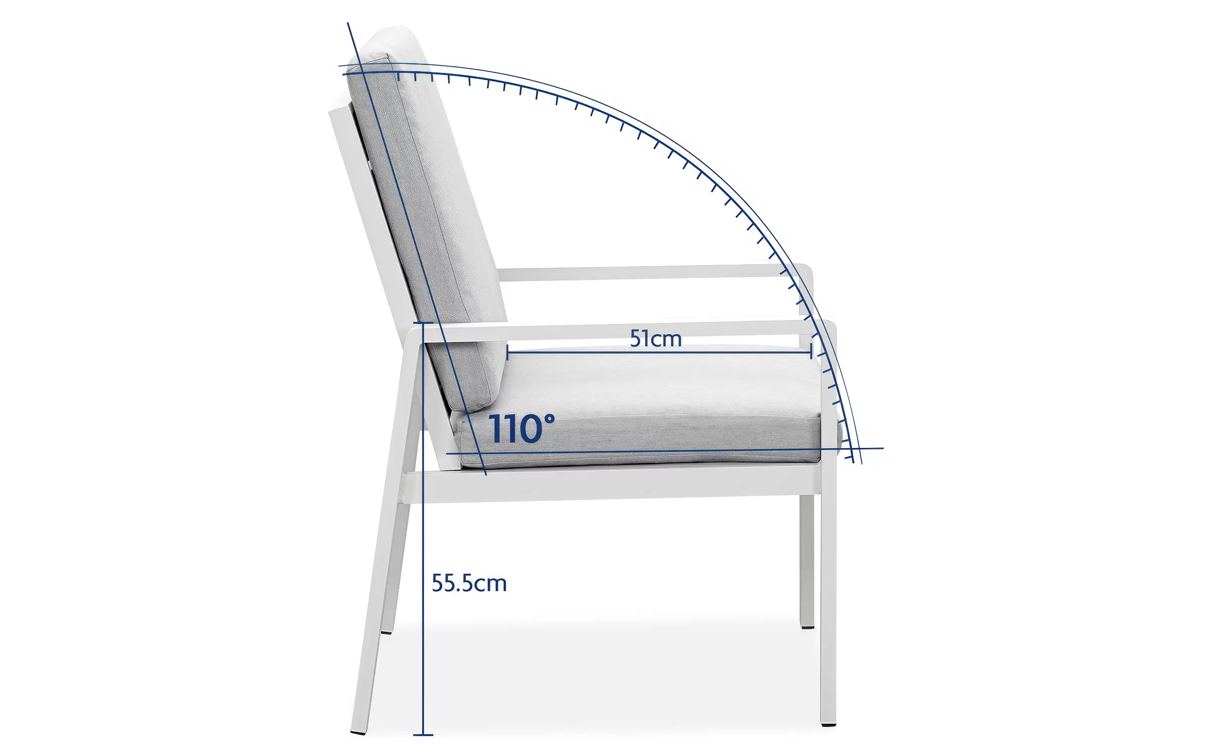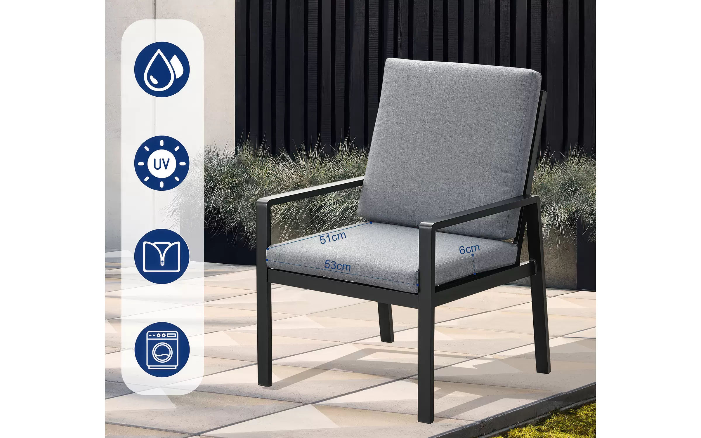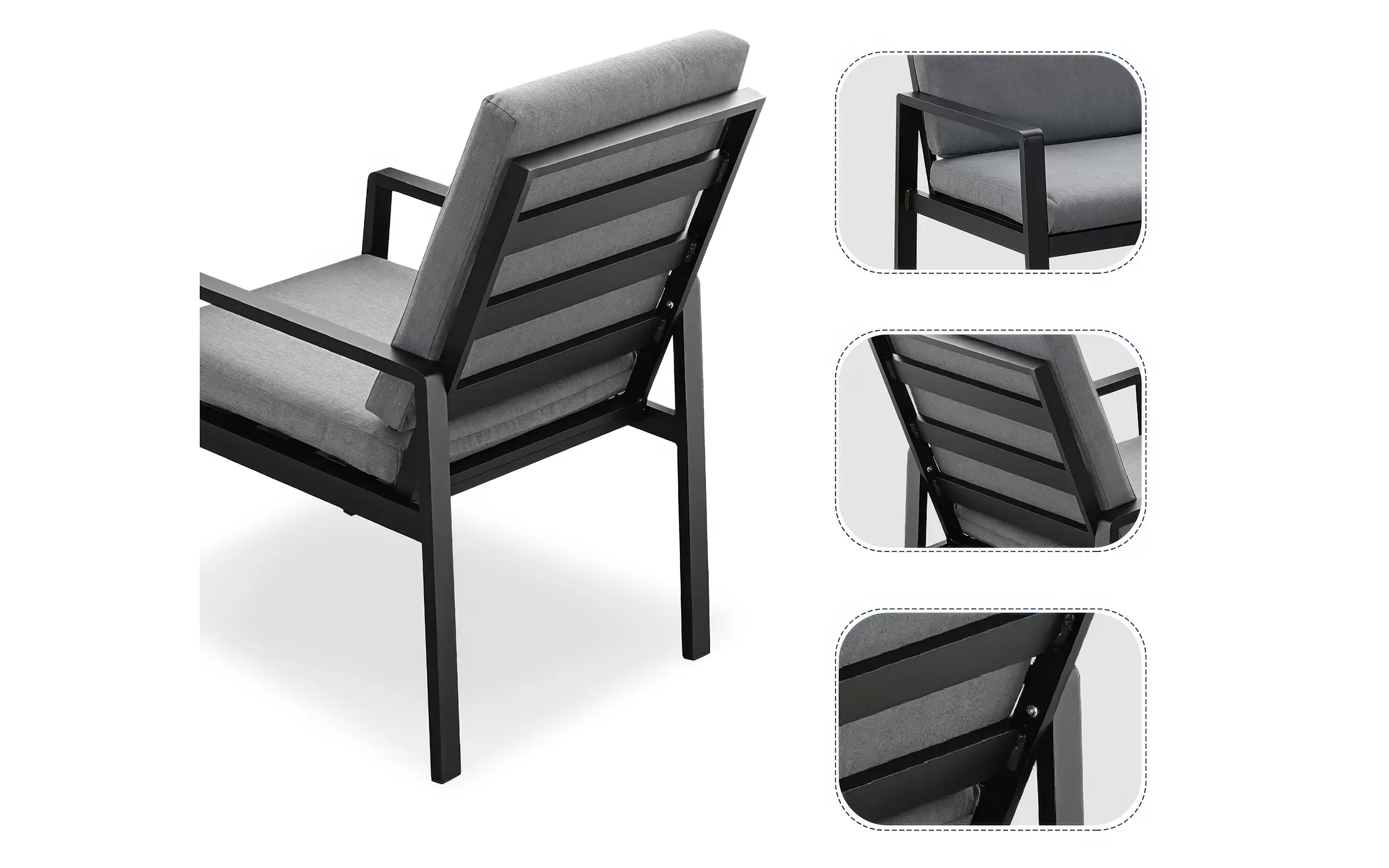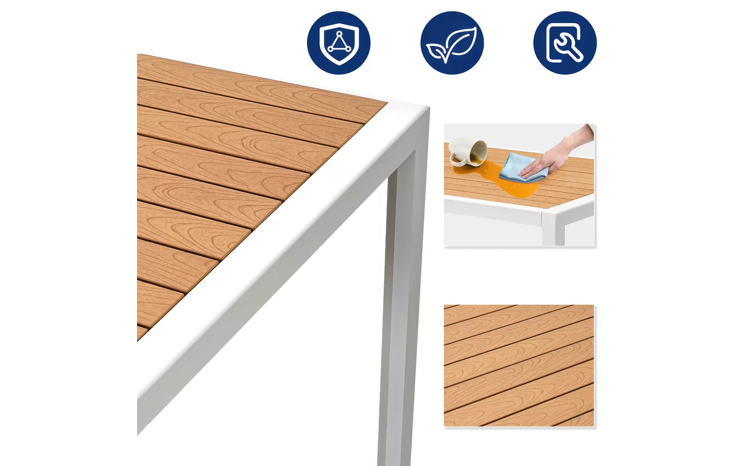 Meble stołowe na taras dla 6 osób wykonany z aluminium. Stół z blatem z deseczek kompozytowych. Na fotelach wodoodporne poduszki ze zdejmowanymi poszewkami.