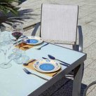 Stół na taras obiadowy z aluminiowymi nogami i blatem z mlecznego szkła hartowanego.