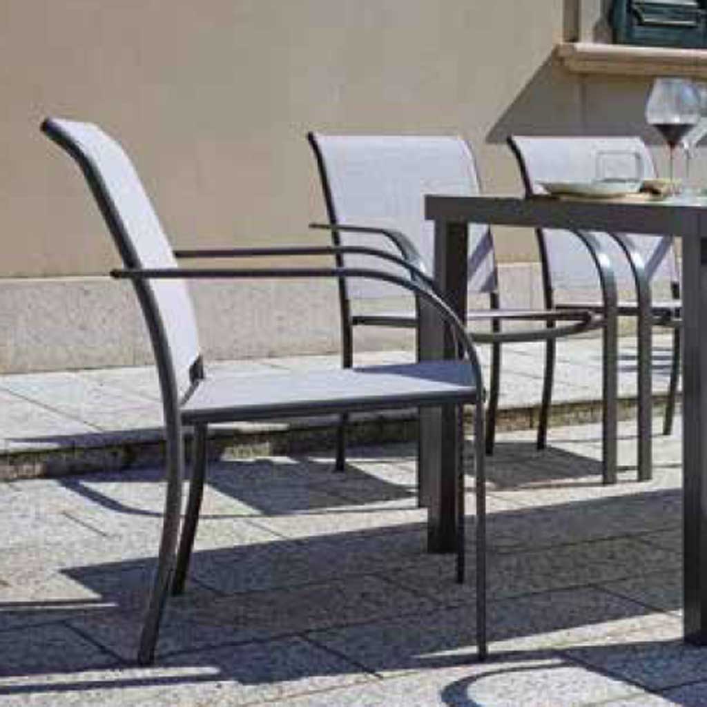 Do kompletu dobrano 6 ciemnoszarych aluminiowych foteli z jasnoszarą tekstyliną.