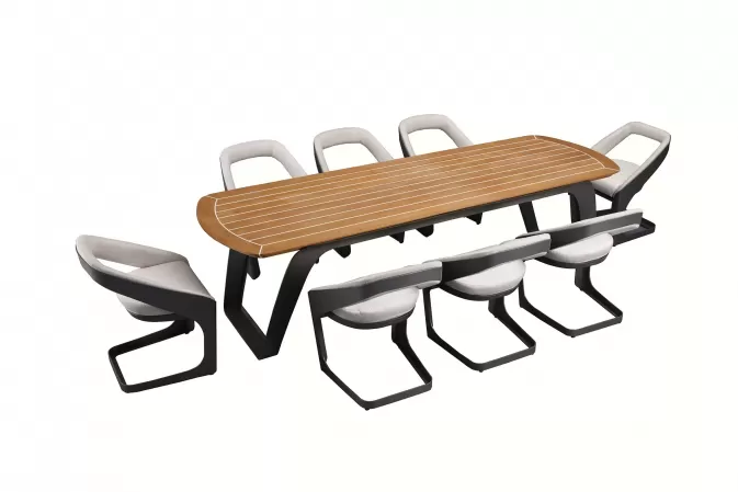 Nowoczesny modułowy komplet stołowy na taras firmy HIGOLD zaprojektowany przez znane studio projektowe Pininfarina. Konstrukcja opiera się na profilowanej konstrukcji aluminiowej malowanej proszkowo, blacie stołu z teaku i wygodnych wodoodpornych poduszek z obiciami z miłego w dotyku wodoodpornego materiału Sunbrella. Fotele z wygodnymi poduszkami z materiału Sunbrella.
