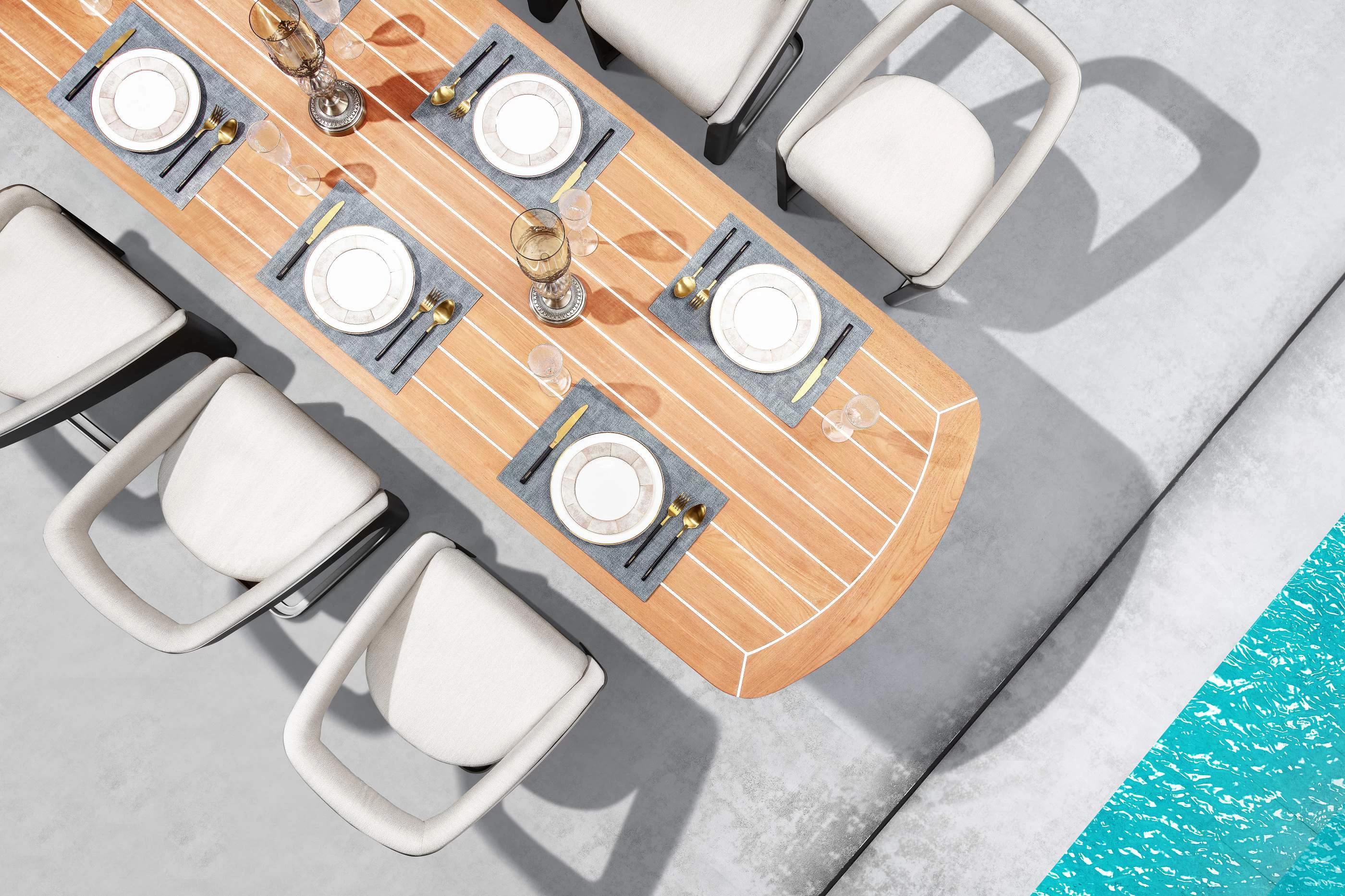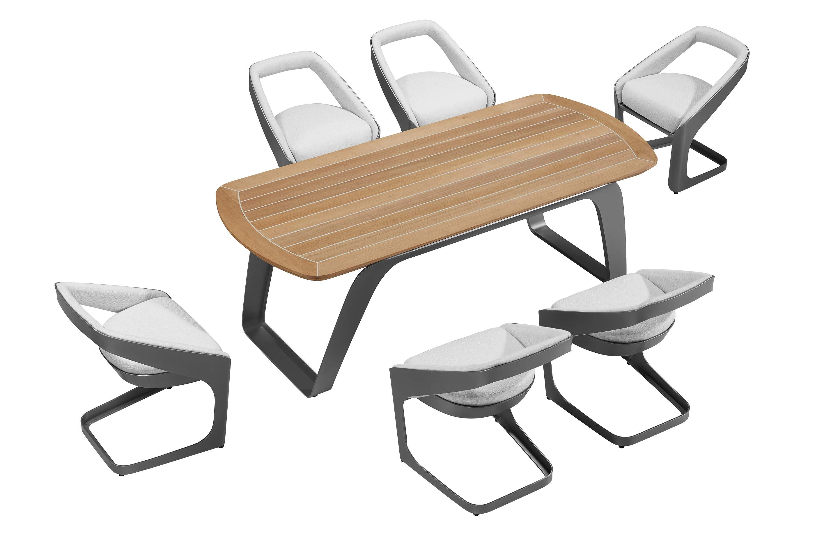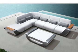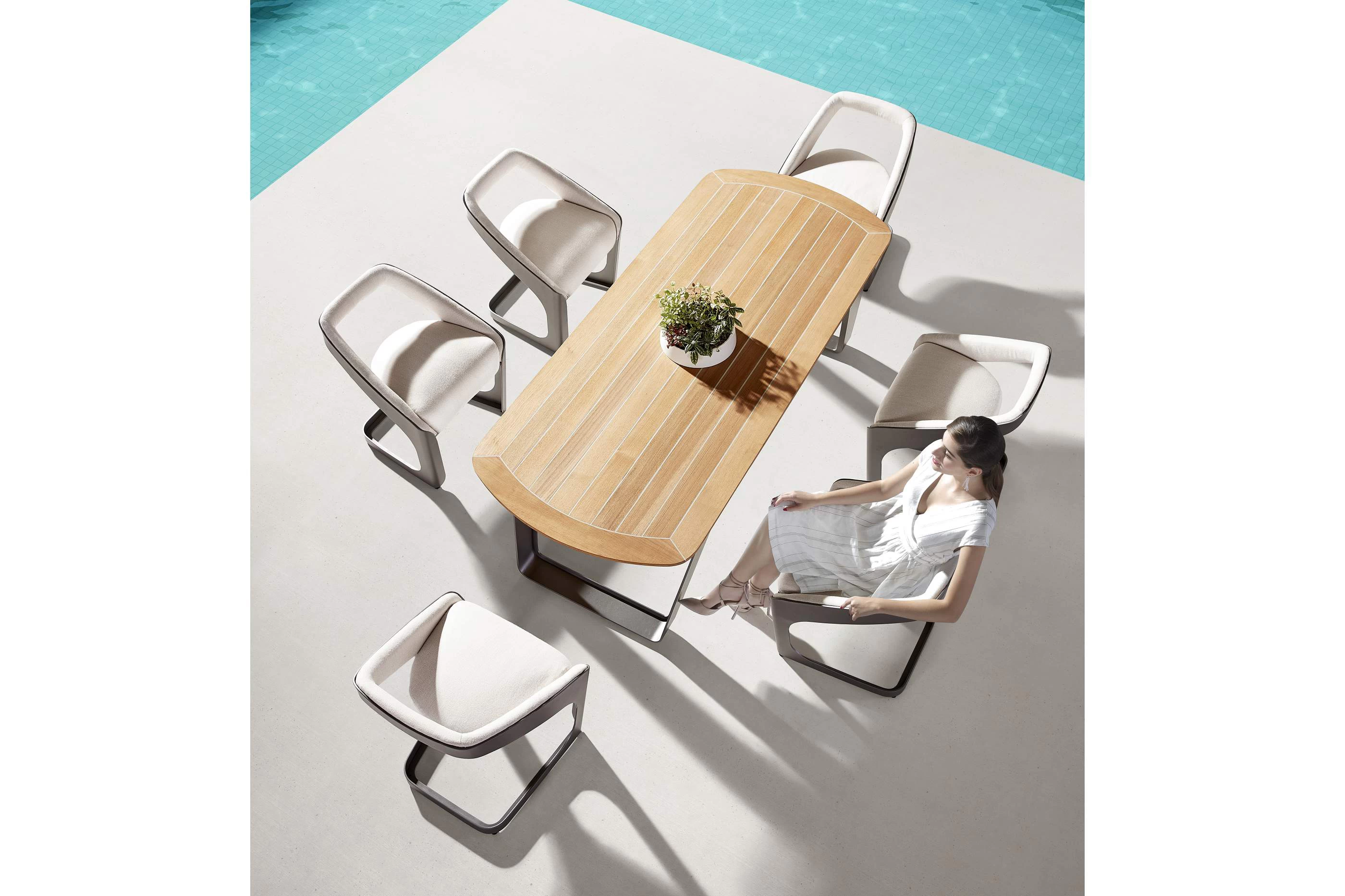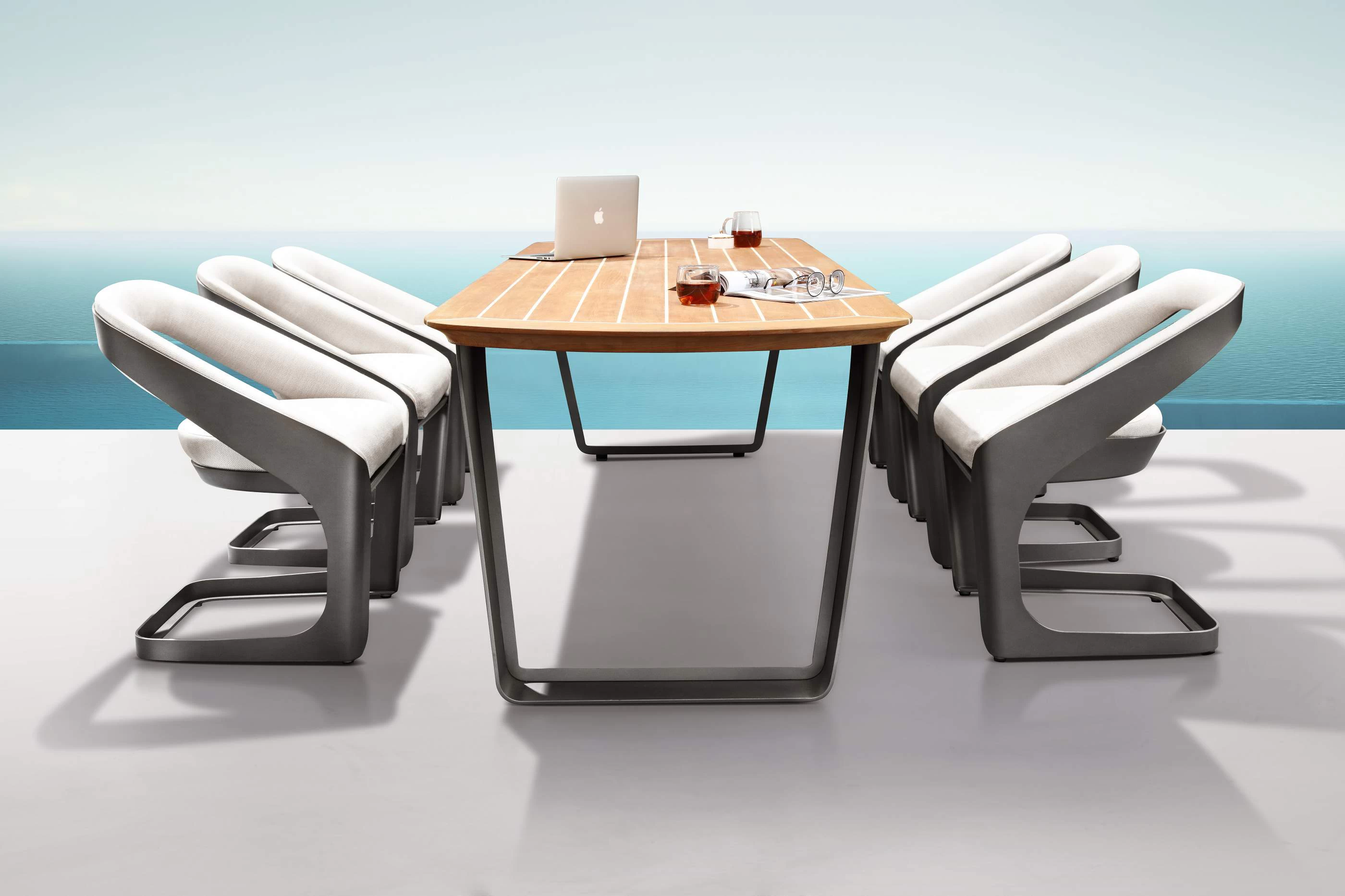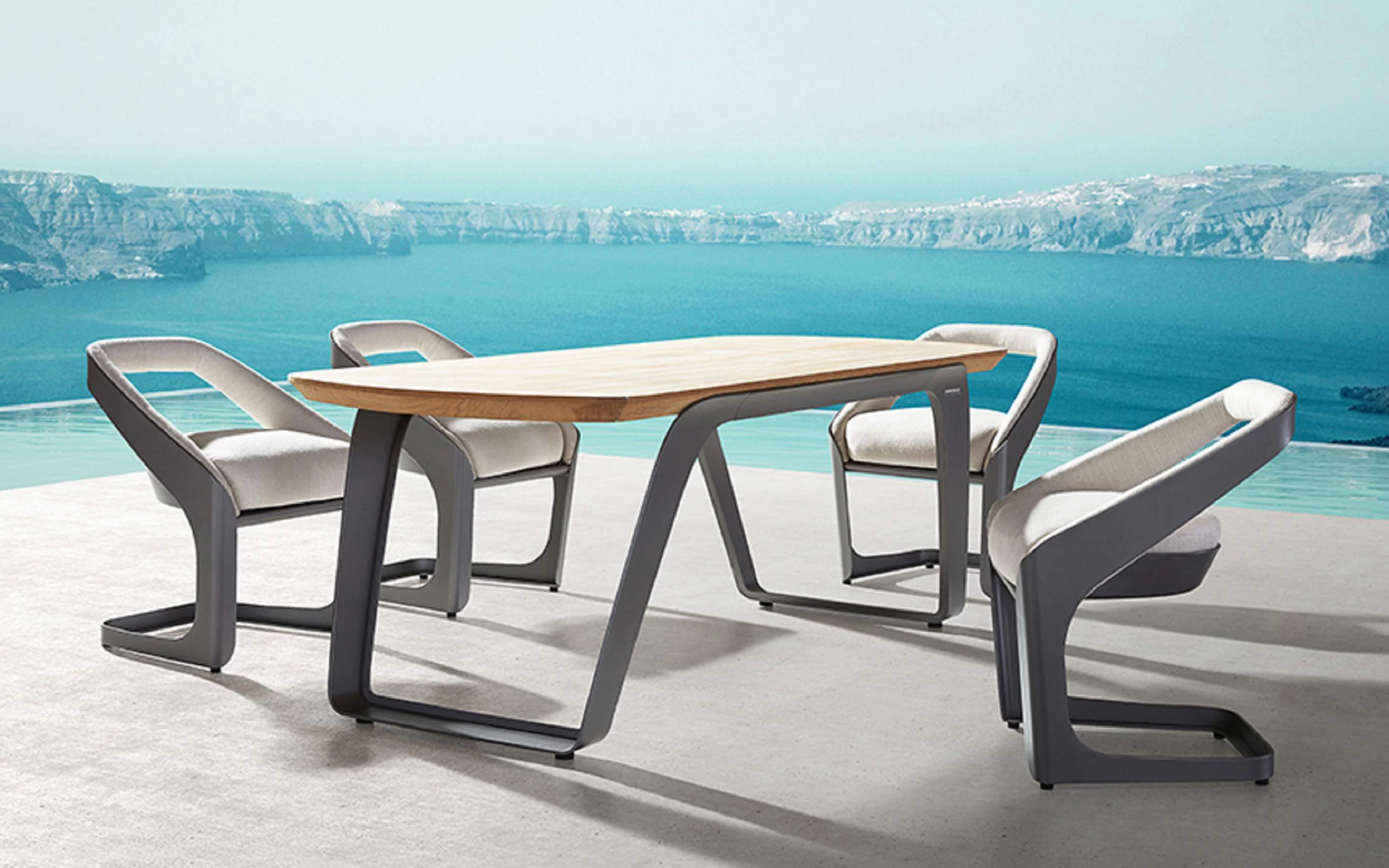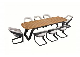 Nowoczesny modułowy komplet stołowy na taras firmy HIGOLD zaprojektowany przez znane studio projektowe Pininfarina. Konstrukcja opiera się na profilowanej konstrukcji aluminiowej malowanej proszkowo, blacie stołu z teaku i wygodnych wodoodpornych poduszek z obiciami z miłego w dotyku wodoodpornego materiału Sunbrella. Fotele z wygodnymi poduszkami z materiału Sunbrella.