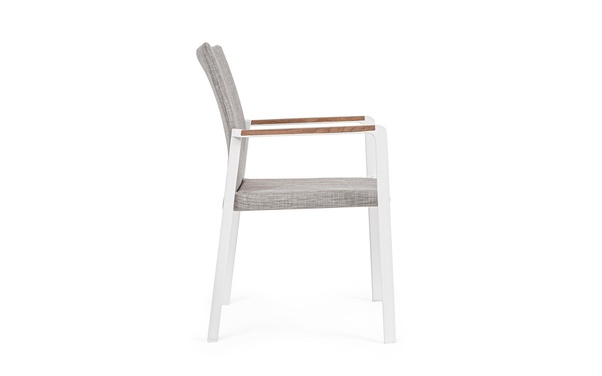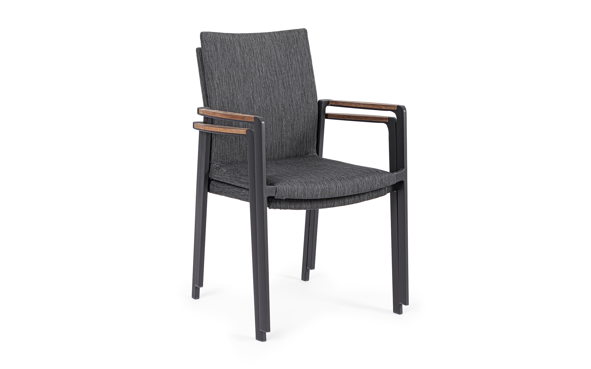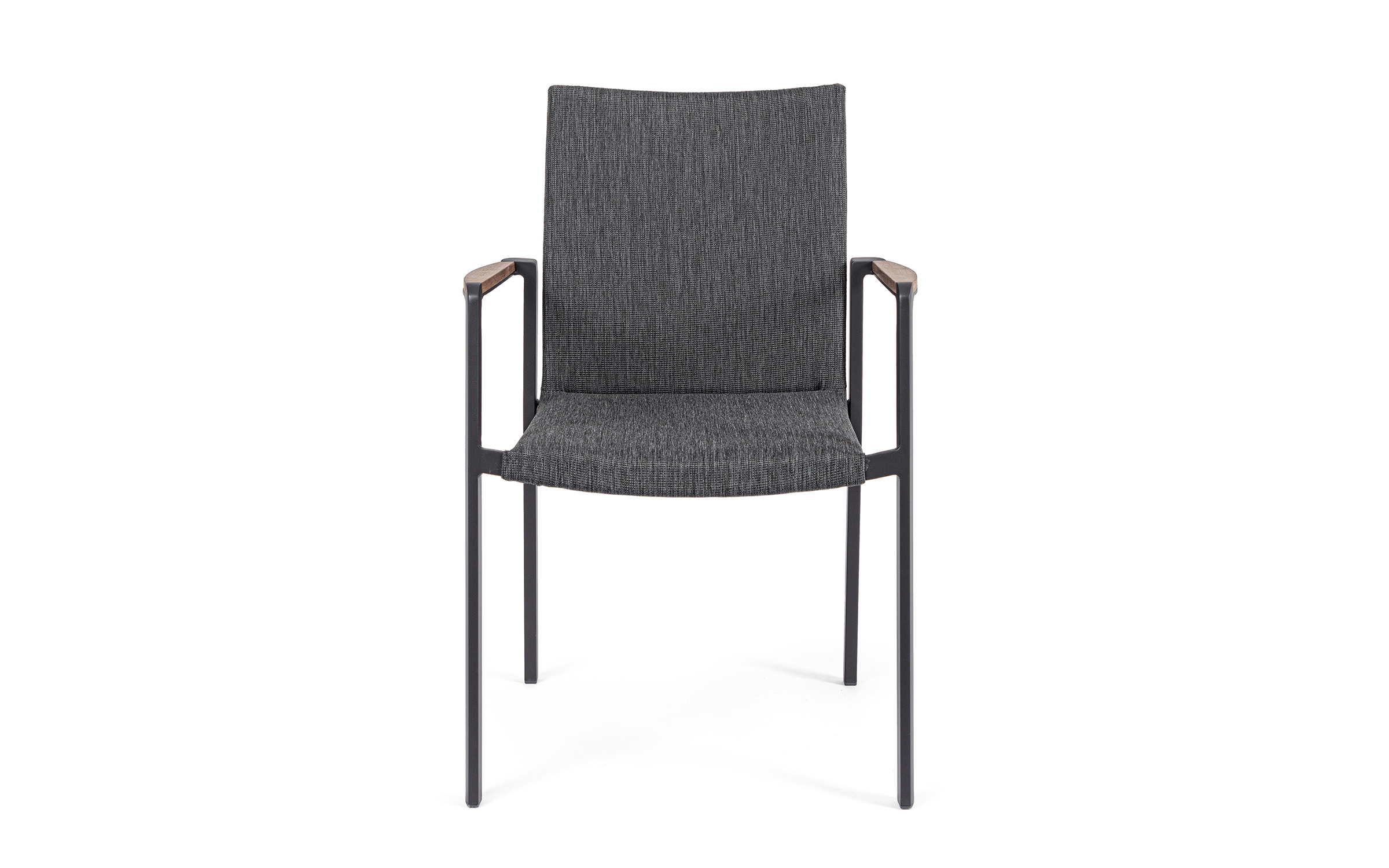 Krzesło posiada w podłokietnikach wstawki z drewna teak.