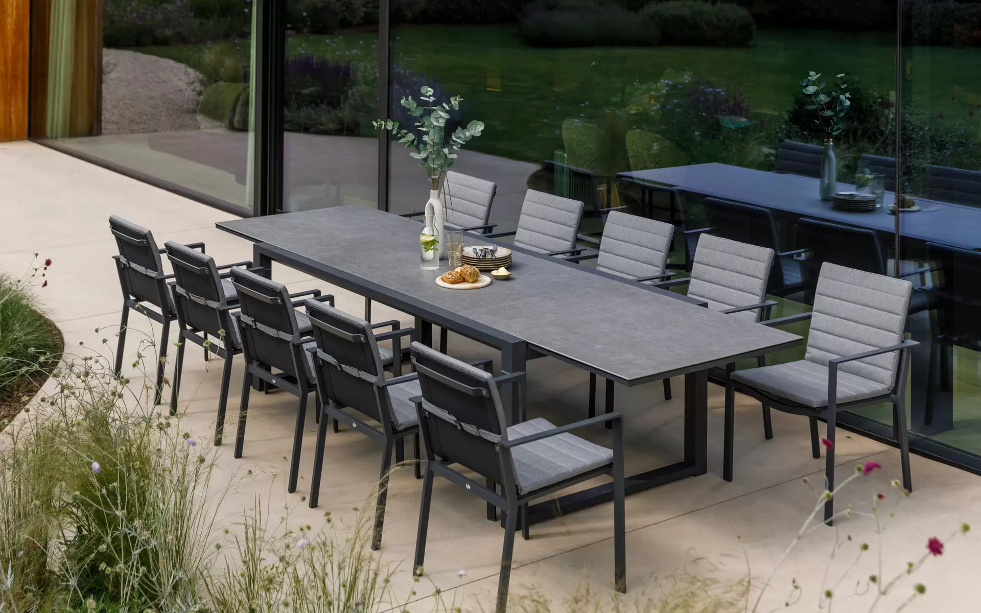 PRIMAVERA Zestaw obiadowy ogrodowy dla 8-12 os. antracyt z rozkładanym stołem ceramicznym