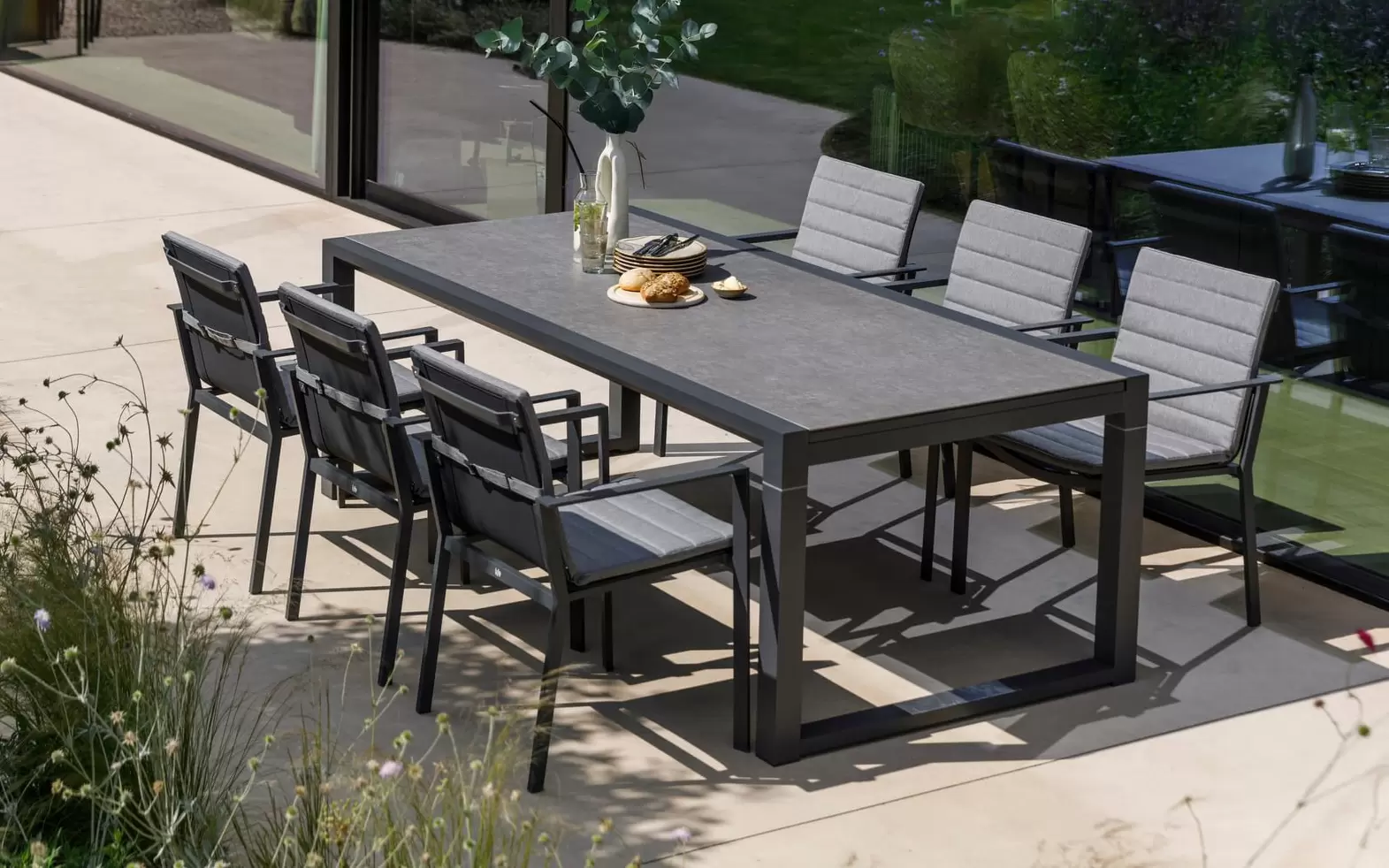 PRIMAVERA Antracyt to dynamiczny system jadalniany zaprojektowany dla użytkowników, którzy cenią elastyczność konfiguracji i nowoczesną, architektoniczną estetykę. Zestaw stanowi idealne rozwiązanie dla właścicieli dużych tarasów, oferując przestrzeń, która potrafi błyskawicznie dostosować się do liczby gości, zachowując przy tym luksusowy i spójny wygląd "contemporary dining".