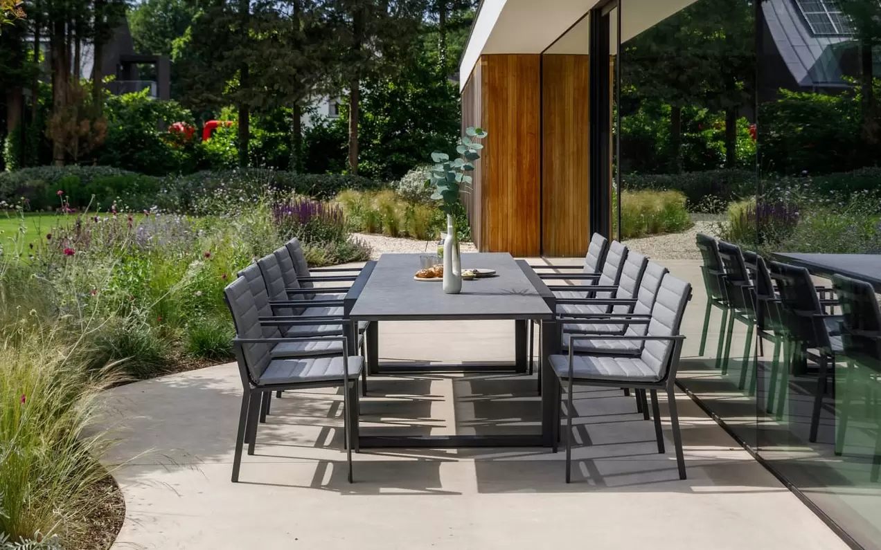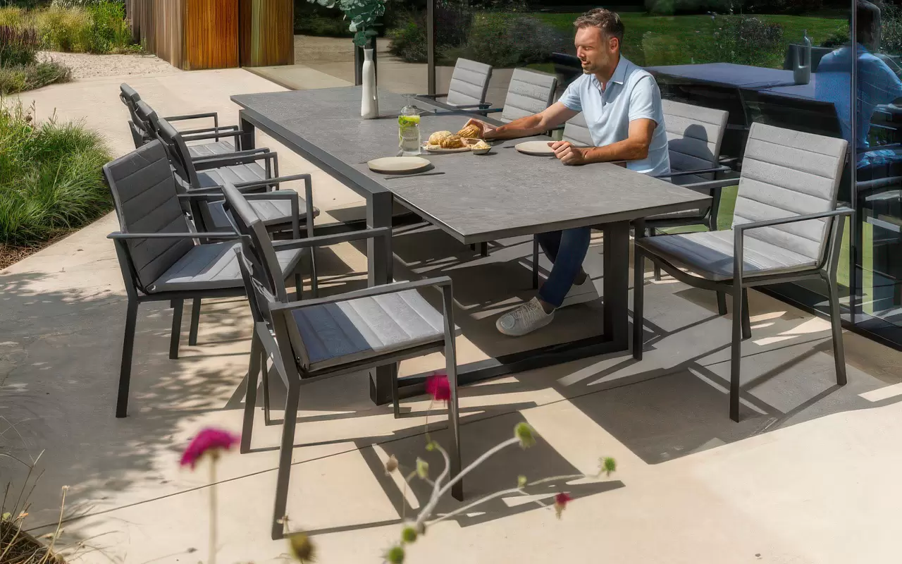 Kluczowym elementem zestawu jest rozkładany stół z blatem ceramicznym, który redefiniuje pojęcie funkcjonalności. W wersji bazowej stół ma długość 220 cm (idealny dla 6–8 osób), jednak zintegrowany mechanizm pozwala na jego przedłużenie do imponujących 340 cm. Dzięki temu zestaw staje się pełnowymiarową strefą bankietową zdolną pomieścić nawet 12 osób. Ceramiczna powierzchnia blatu jest nieporowata i ekstremalnie twarda, co czyni ją całkowicie niewrażliwą na "szok termiczny", zarysowania oraz intensywne użytkowanie podczas garden party.