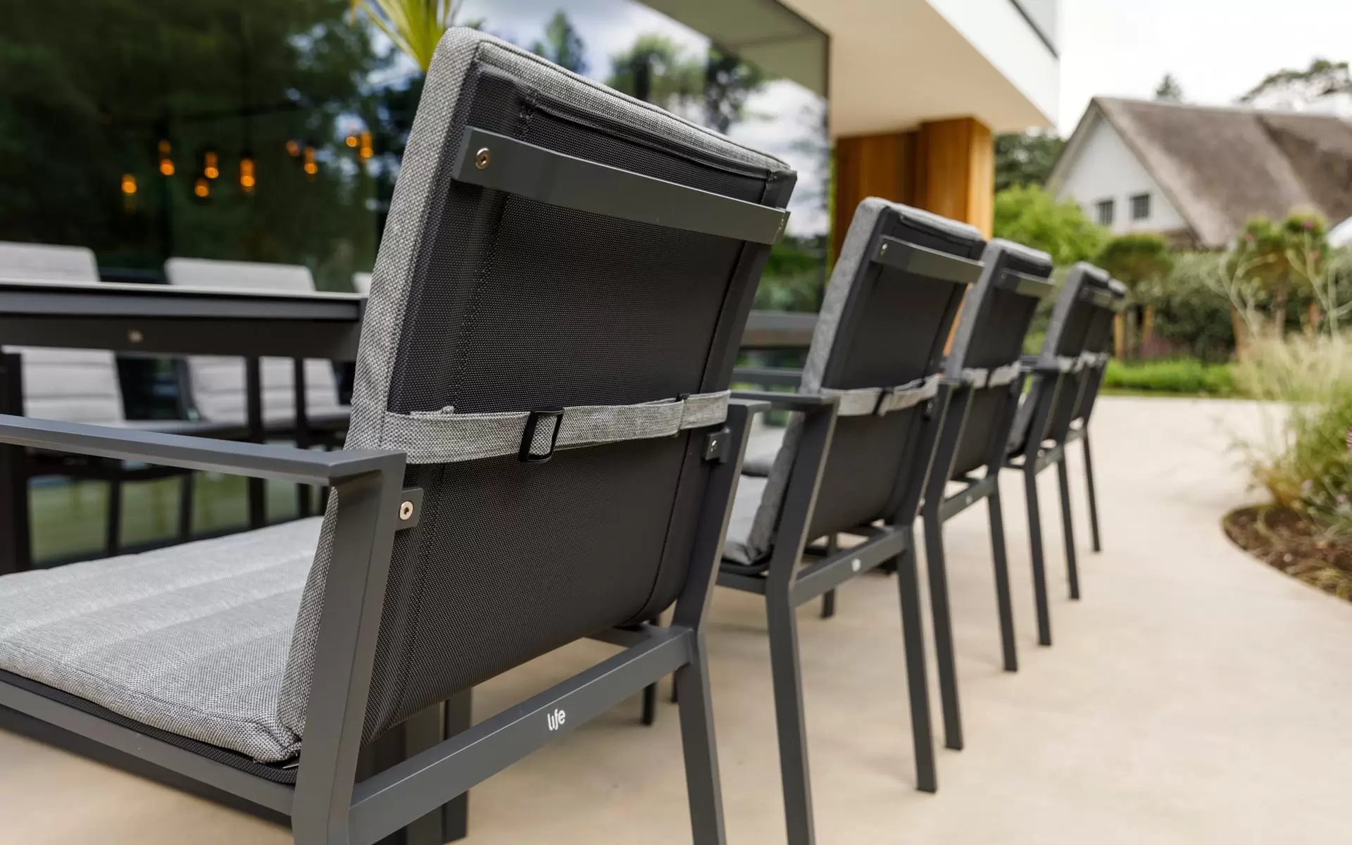 Minimalistyczne krzesła o lekkiej, aluminiowej konstrukcji zapewniają ergonomiczną wygodę i nowoczesny profil wizualny. Aby wejść na wyższy poziom komfortu, zestaw można doposażyć w dedykowane poduszki z tkaniny Soltex. Ten techniczny materiał hybrydowy cechuje się wysoką barierowością wobec wilgoci oraz promieniowania UV, co sprawia, że poduszki są "całorocznym" uzupełnieniem luksusowej jadalni na świeżym powietrzu.