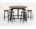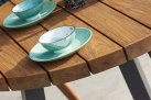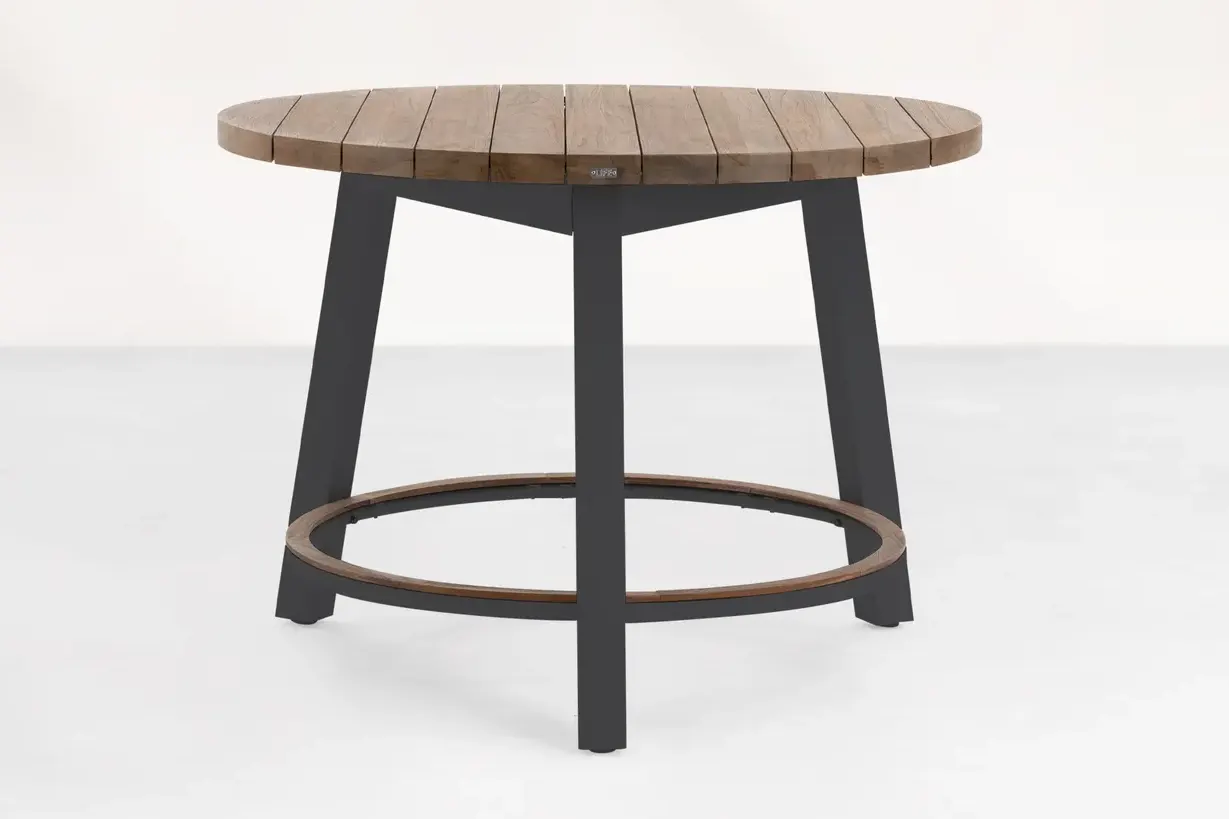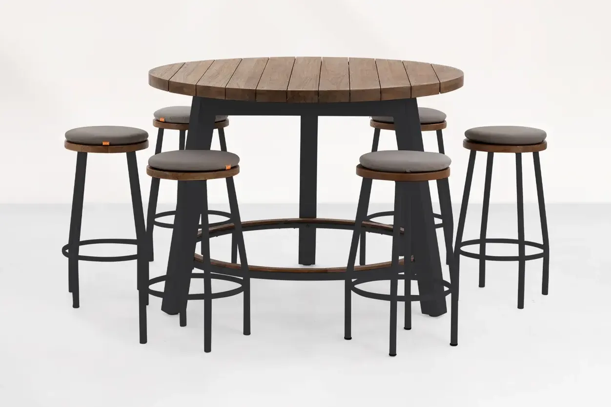 Stół barowy okrągły o średnicy 130 cm posadowiony na aluminiowych nogach z blatem z grubych teakowych desek. Stół pomieści fotele nawet dla 8 osób.