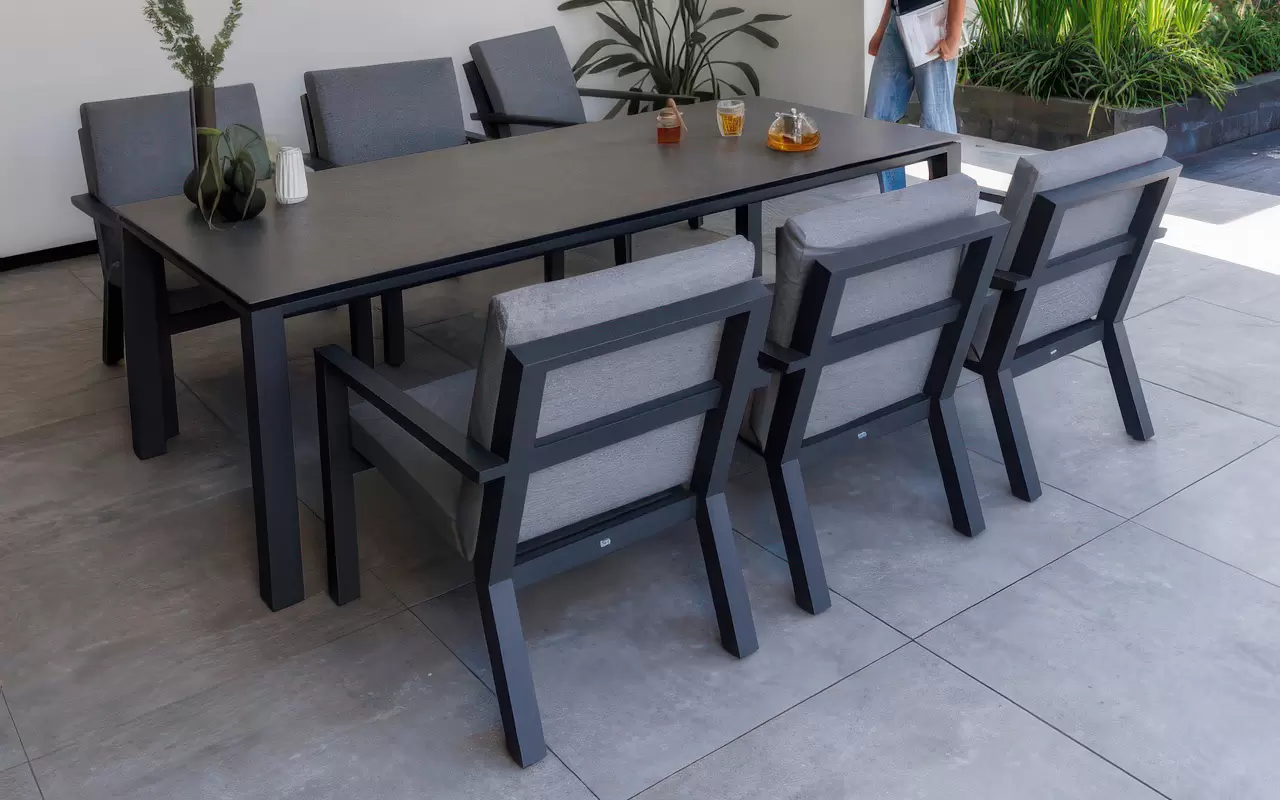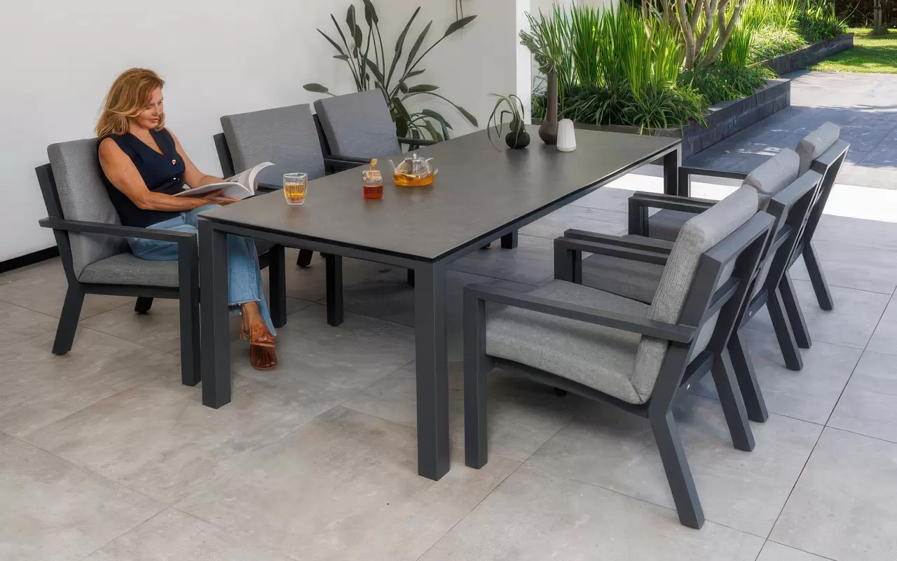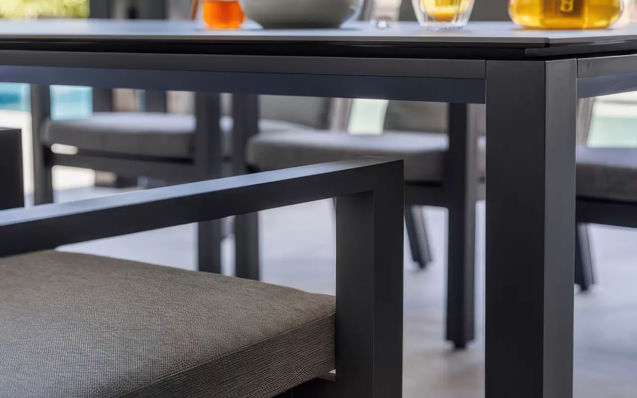 Sercem układu jest stół z blatem ceramicznym, osadzony na stabilnej, antracytowej ramie z aluminium. Powierzchnia ceramiczna charakteryzuje się nieporowatą strukturą, co czyni ją całkowicie niewrażliwą na plamy, zarysowania mechaniczne oraz "szok termiczny". Zestaw dopełnia sześć ergonomicznych krzeseł, które wyposażono w poduszki w odcieniu "Mist Grey". Zastosowana tkanina Soltex łączy miękkość materiałów tekstylnych z pełną ochroną przed wilgocią i promieniowaniem UV.