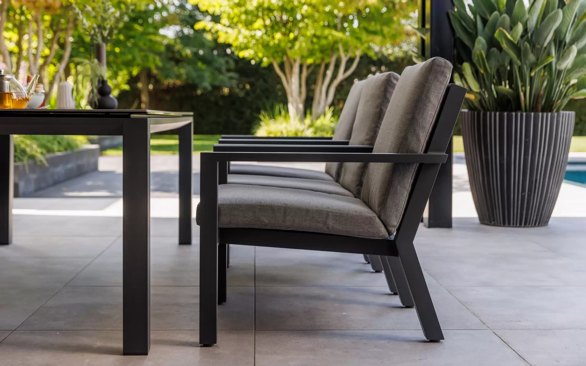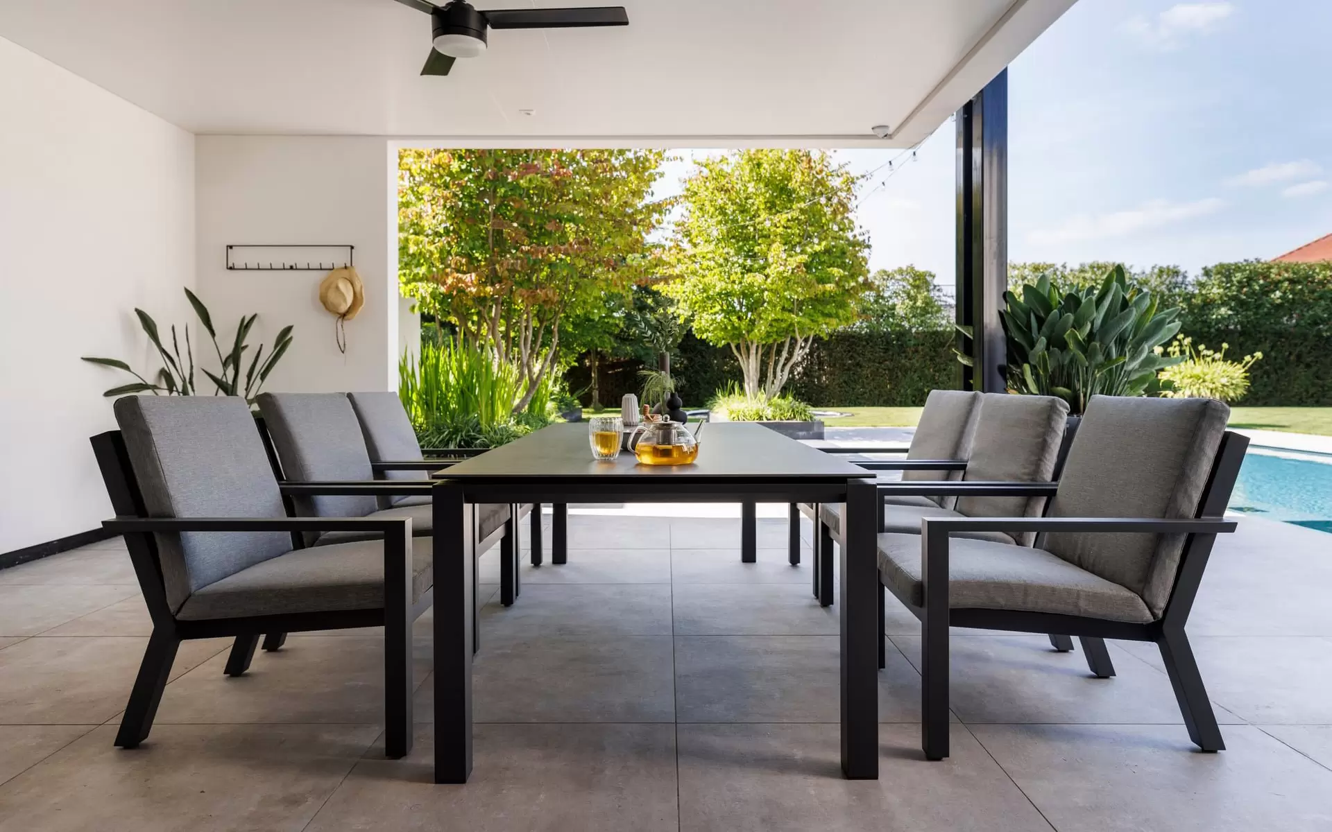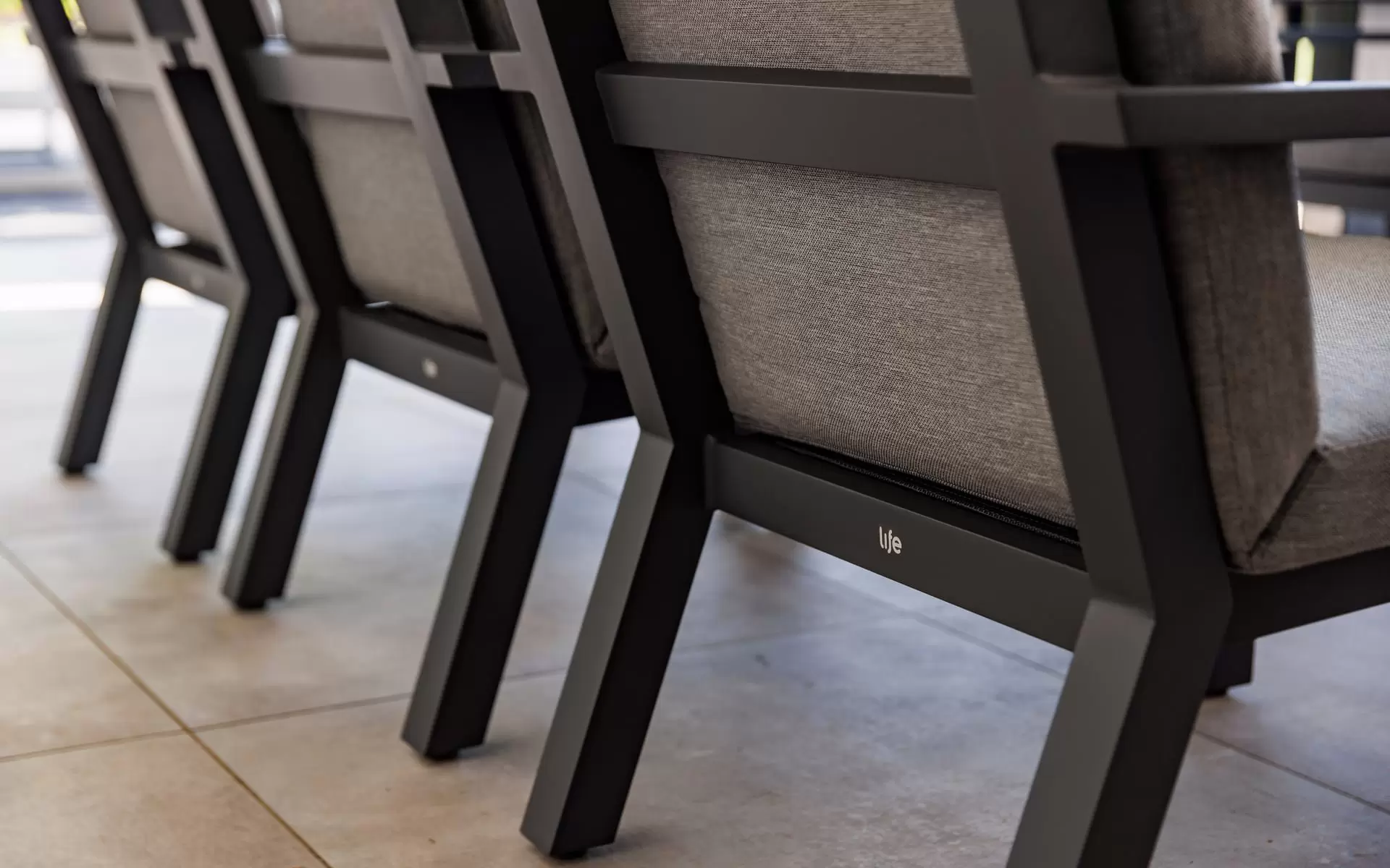 Sercem układu jest stół z blatem ceramicznym, osadzony na stabilnej, antracytowej ramie z aluminium. Powierzchnia ceramiczna charakteryzuje się nieporowatą strukturą, co czyni ją całkowicie niewrażliwą na plamy, zarysowania mechaniczne oraz "szok termiczny". Zestaw dopełnia sześć ergonomicznych krzeseł, które wyposażono w poduszki w odcieniu "Mist Grey". Zastosowana tkanina Soltex łączy miękkość materiałów tekstylnych z pełną ochroną przed wilgocią i promieniowaniem UV.