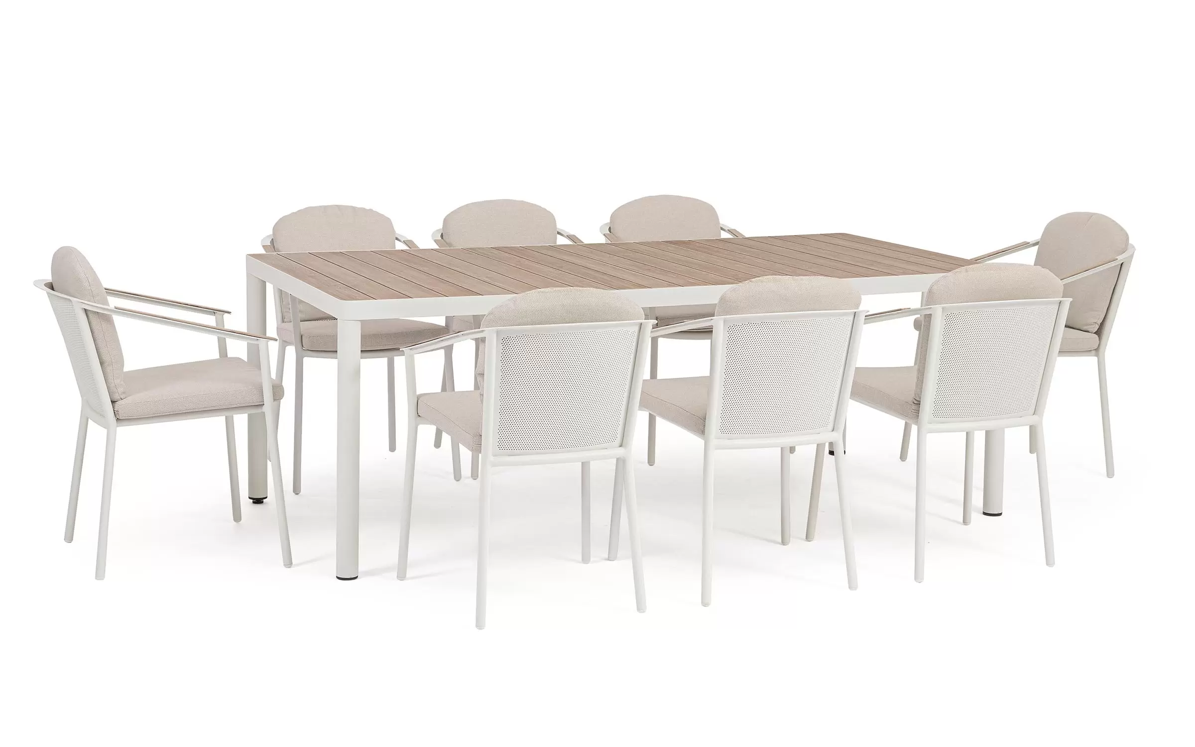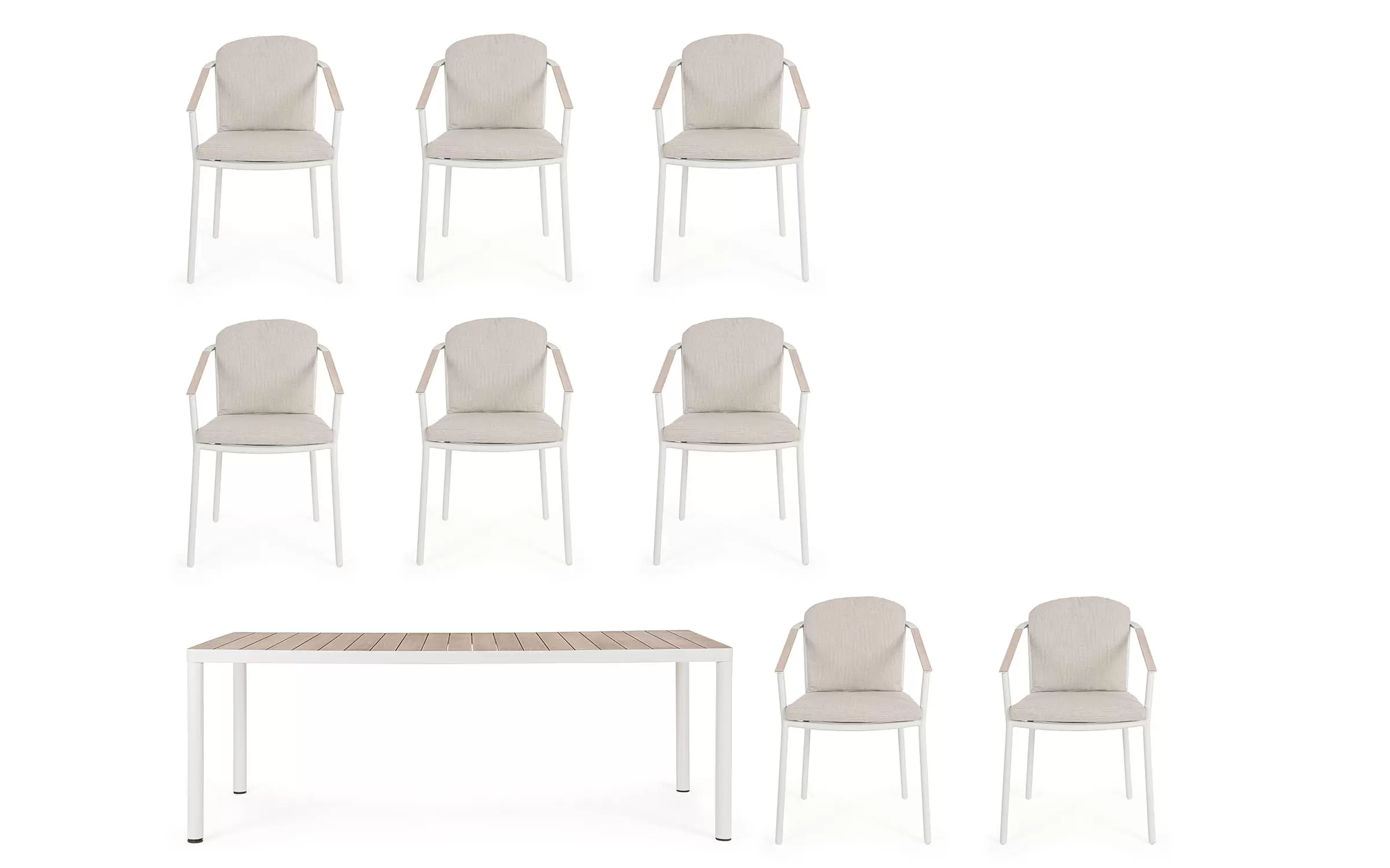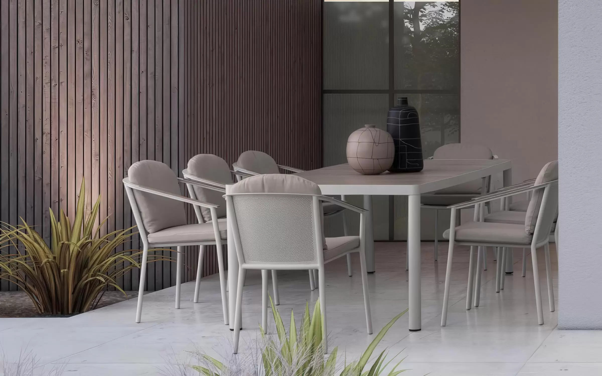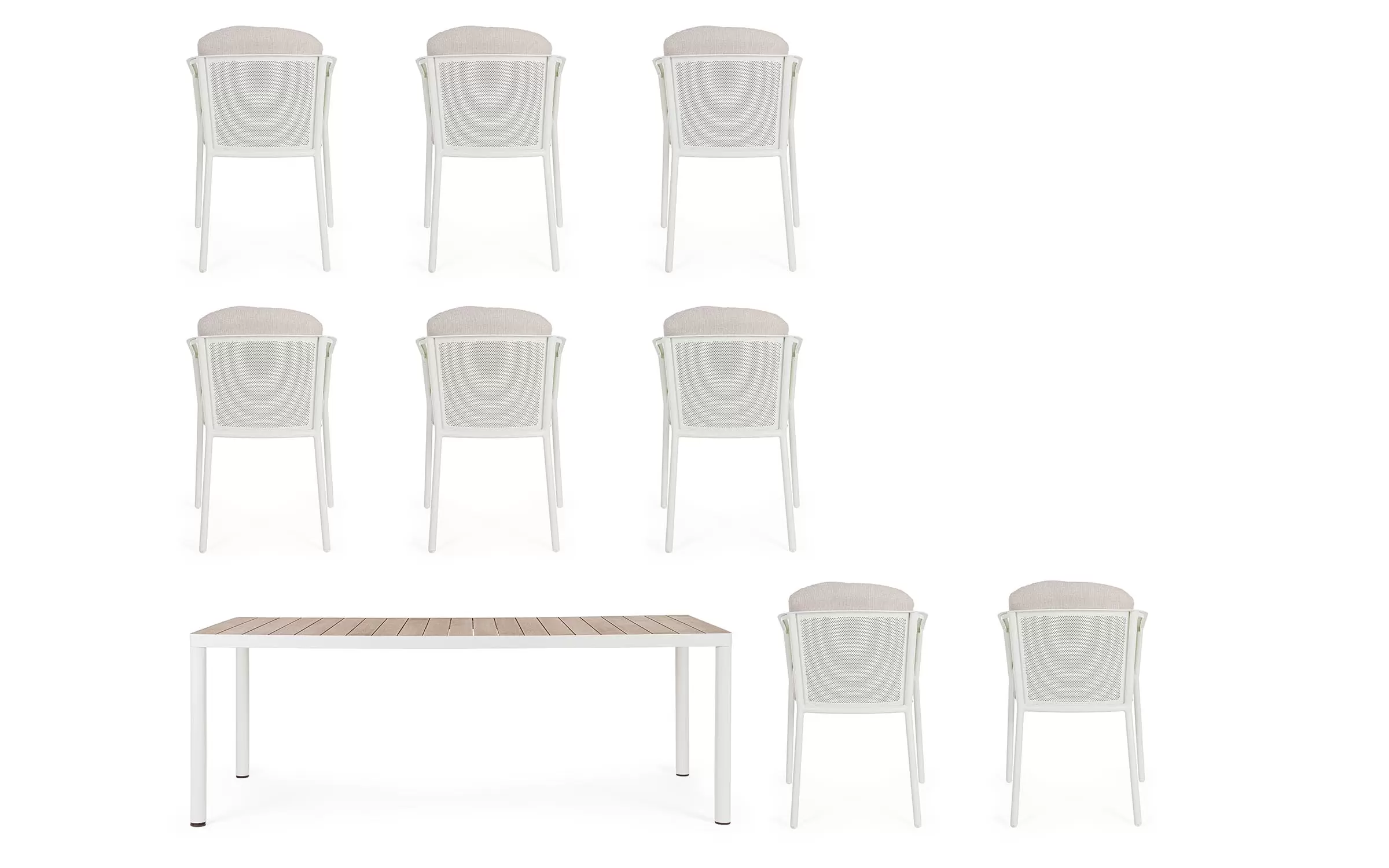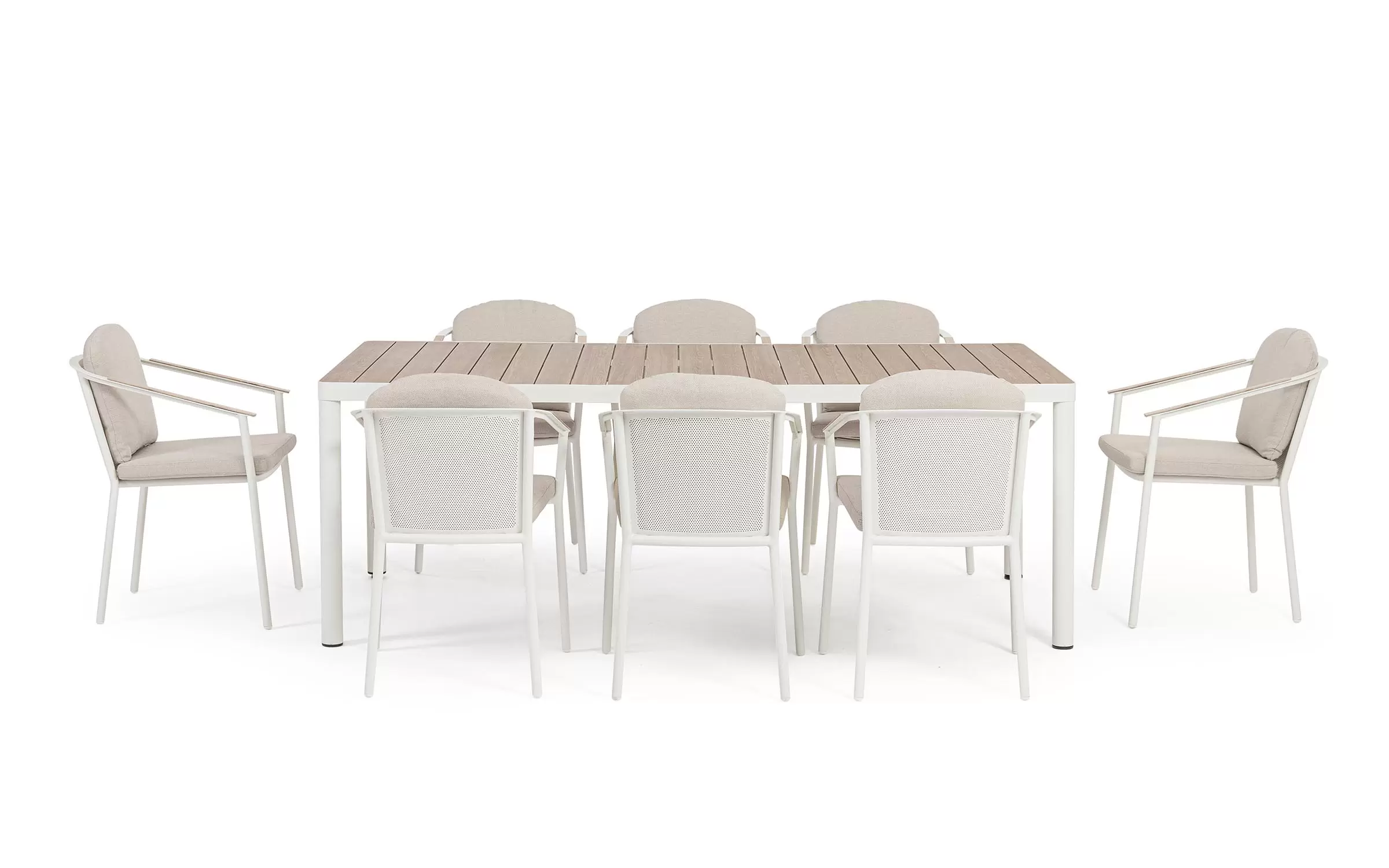 Aluminiowy zestaw stołowy dla 8 osób. Krzesła można układać w stos ułatwiając ich przechowywanie.