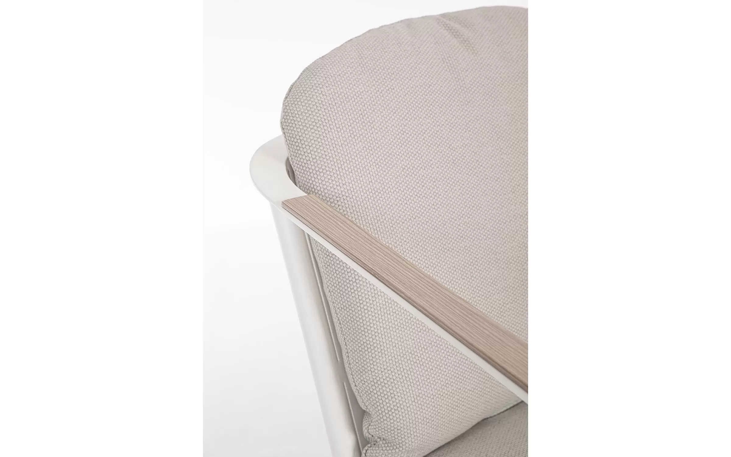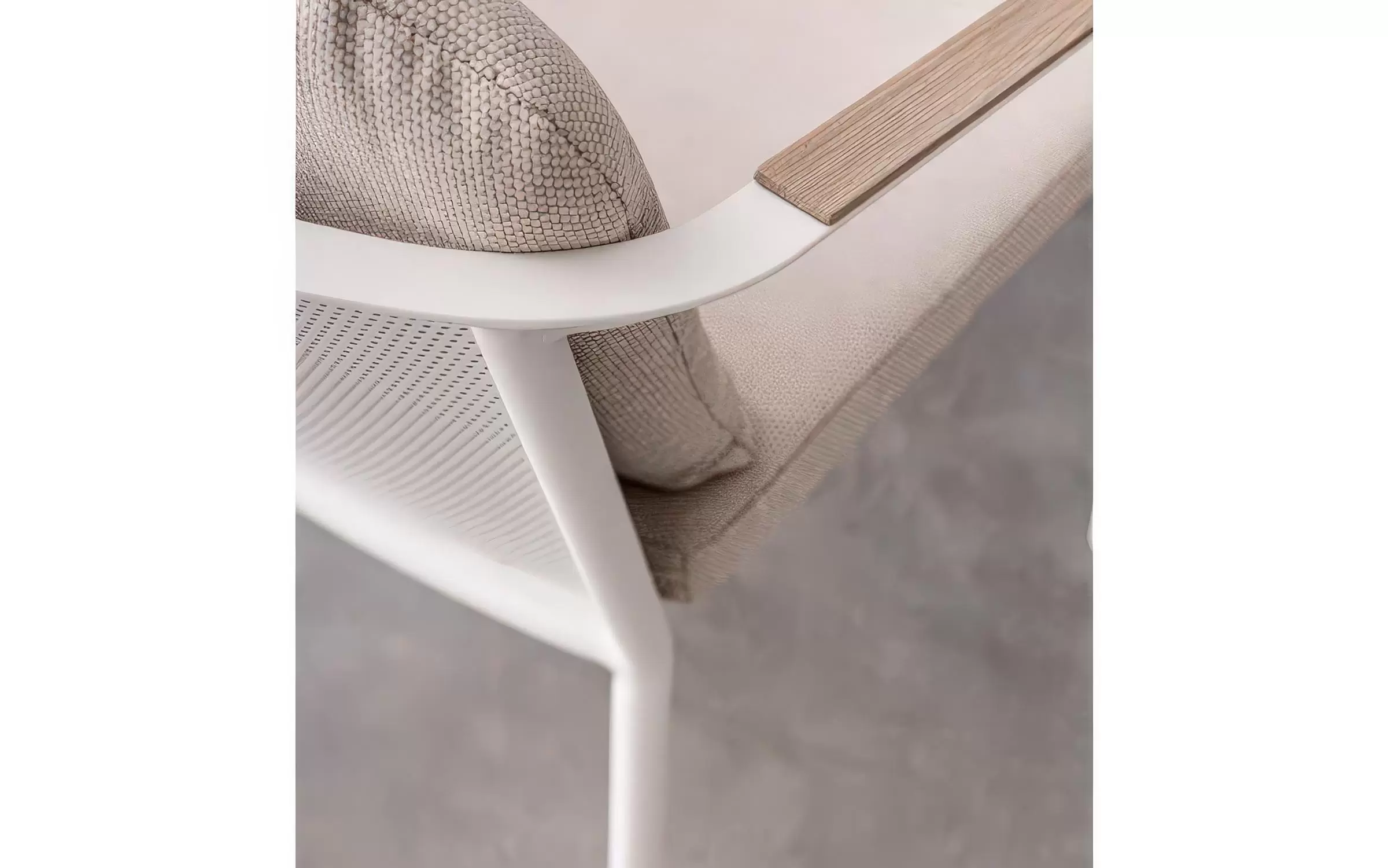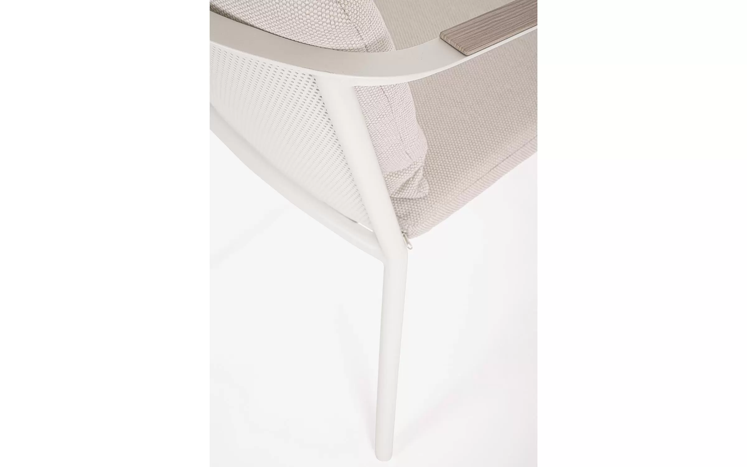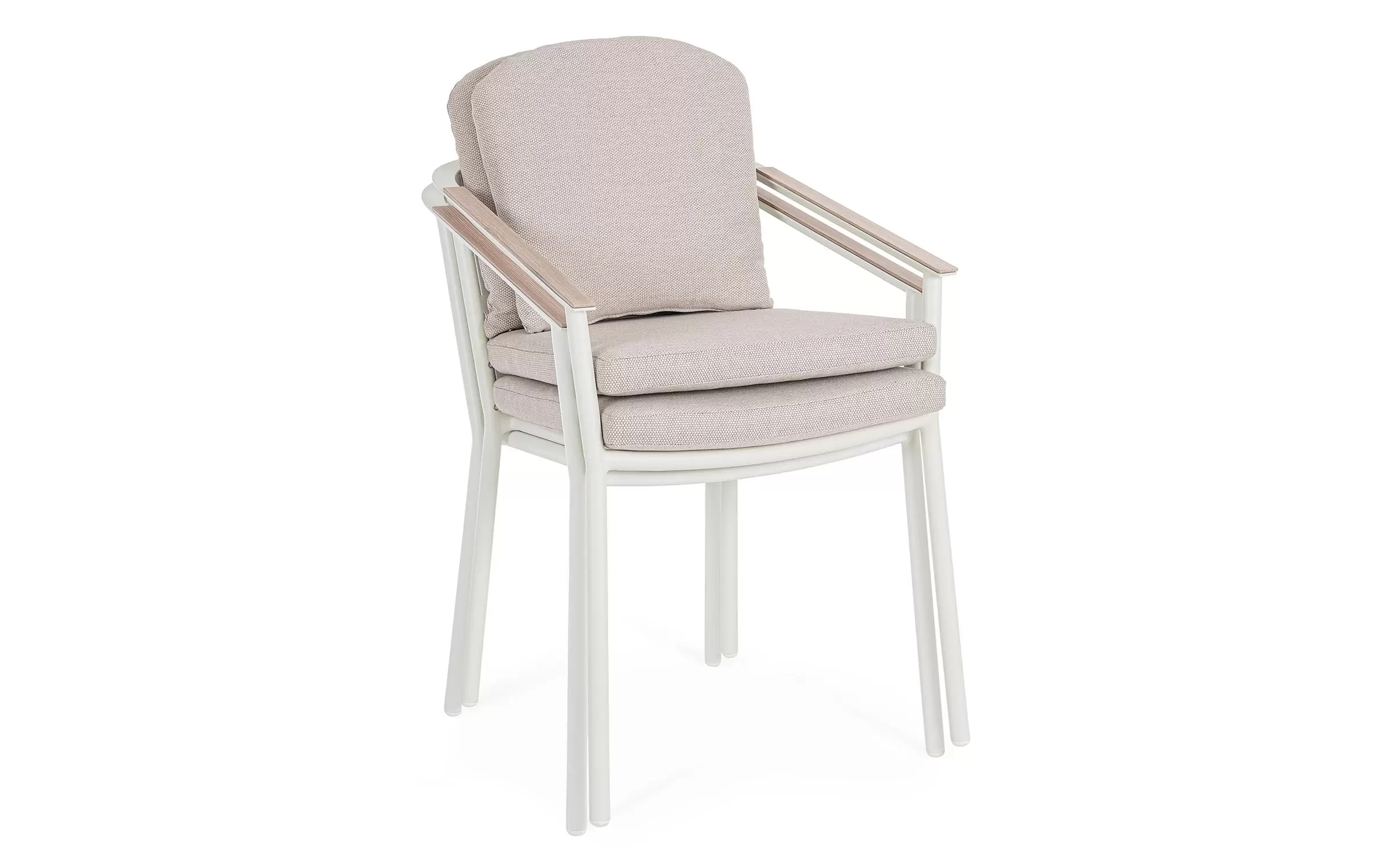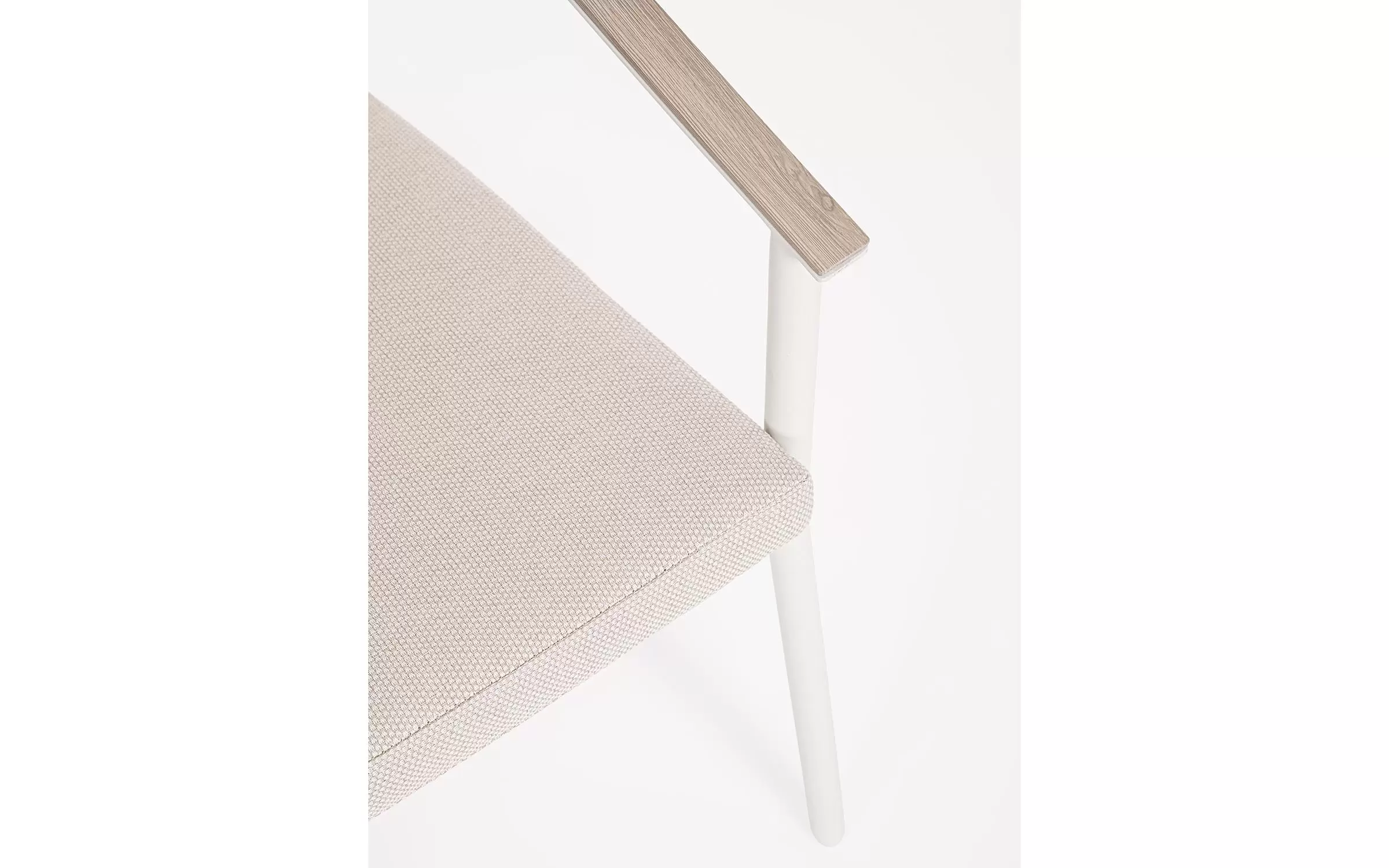 Krzesła z podłokietnikami z beżowymi poduszkami z materiału Olefin.