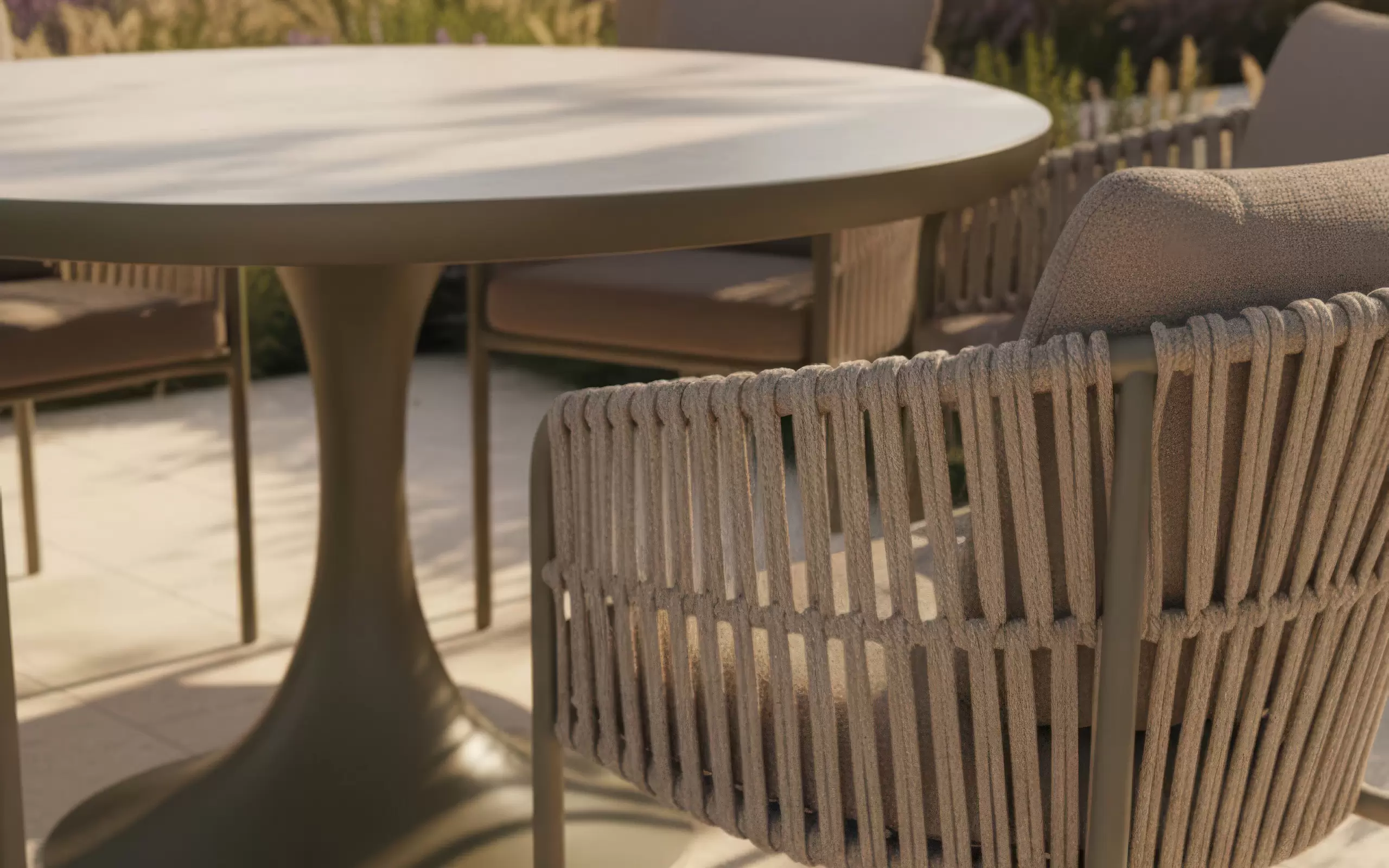 VALENCIA Taupe to wielkoformatowy zestaw jadalniany, który wprowadza do ogrodu atmosferę nowoczesnego, europejskiego designu. Centralnym punktem kompozycji jest okrągły stół o średnicy 150 cm, który dzięki swojej formie sprzyja swobodnej komunikacji i budowaniu relacji podczas wspólnych posiłków. Jasny, ceramiczny blat w odcieniu "oyster" nadaje całości wizualnej szlachetności, tworząc prestiżową przestrzeń "outdoor dining", która z powodzeniem mogłaby stać się sercem luksusowego wnętrza.