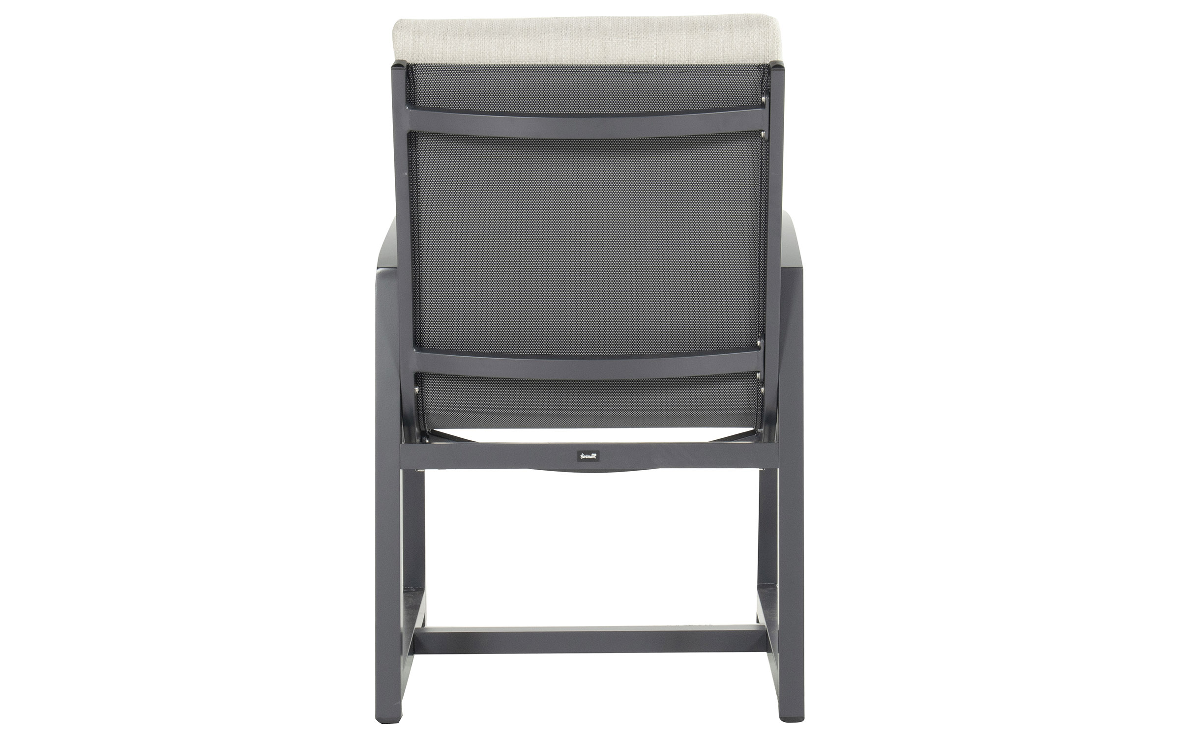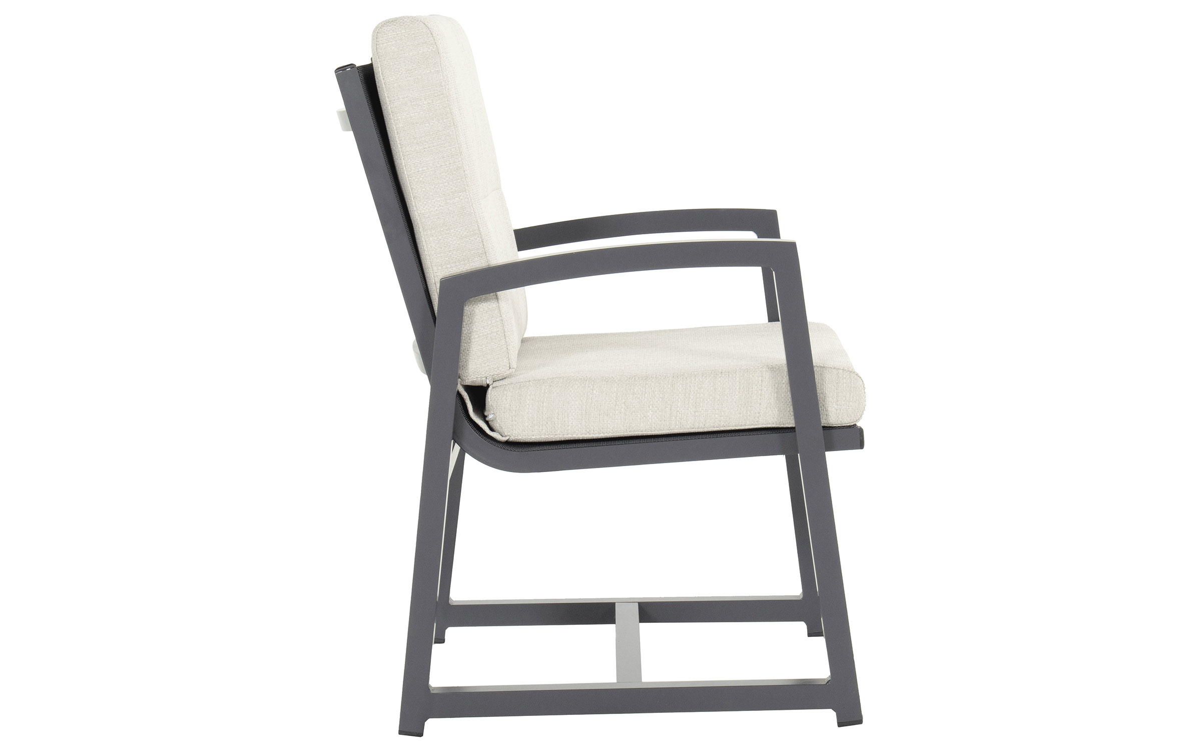 Krzesło ogrodowe GIO posiada aluminiową konstrukcję, która zapewnia trwałość i odporność na warunki atmosferyczne. Profilowane oparcie i ergonomiczne podłokietniki wspierają wygodę podczas dłuższego siedzenia. Siedzisko i oparcie wykończone są tekstyliną – materiałem odpornym na wilgoć i UV, niewymagającym skomplikowanej konserwacji poza okresowym czyszczeniem.