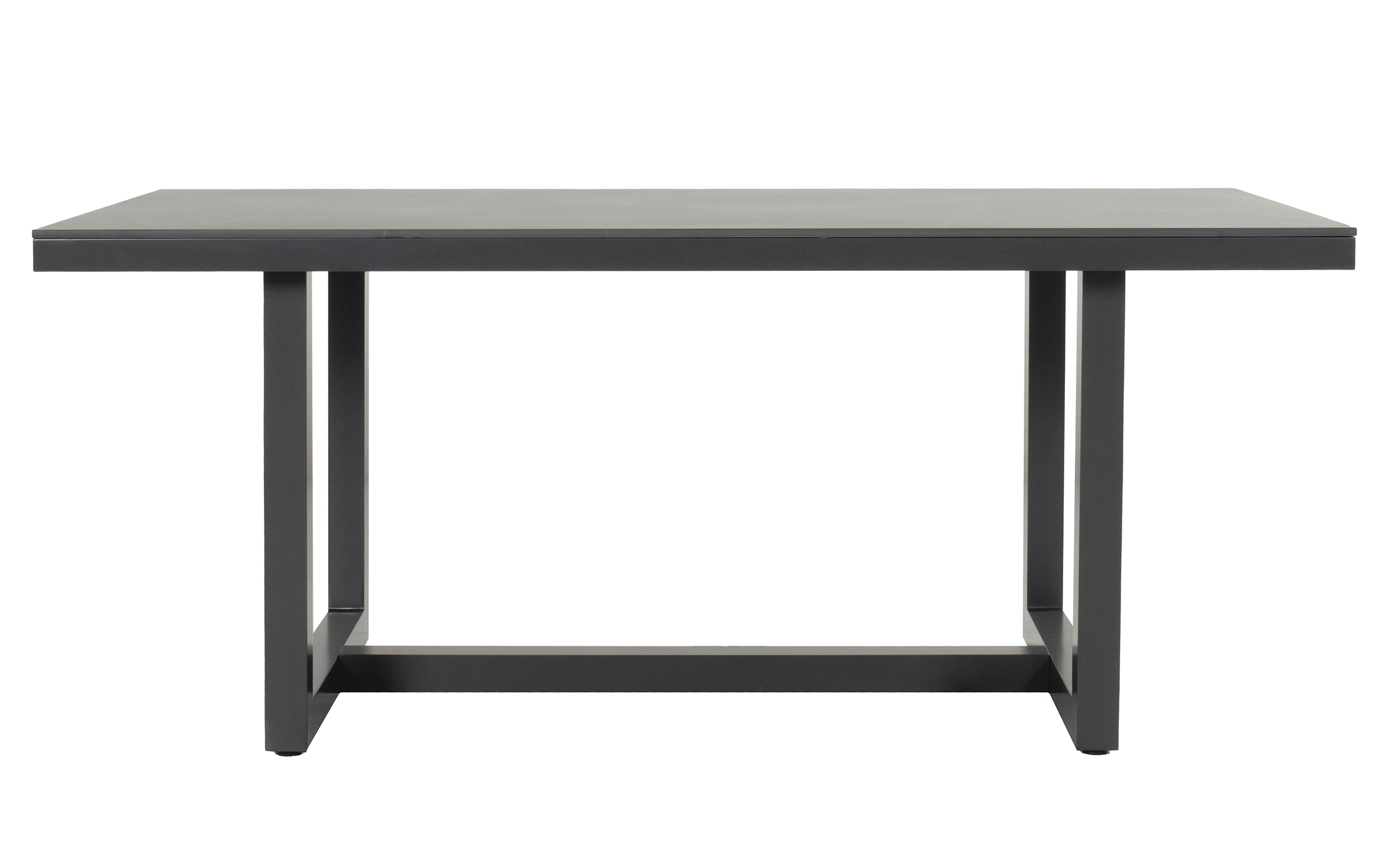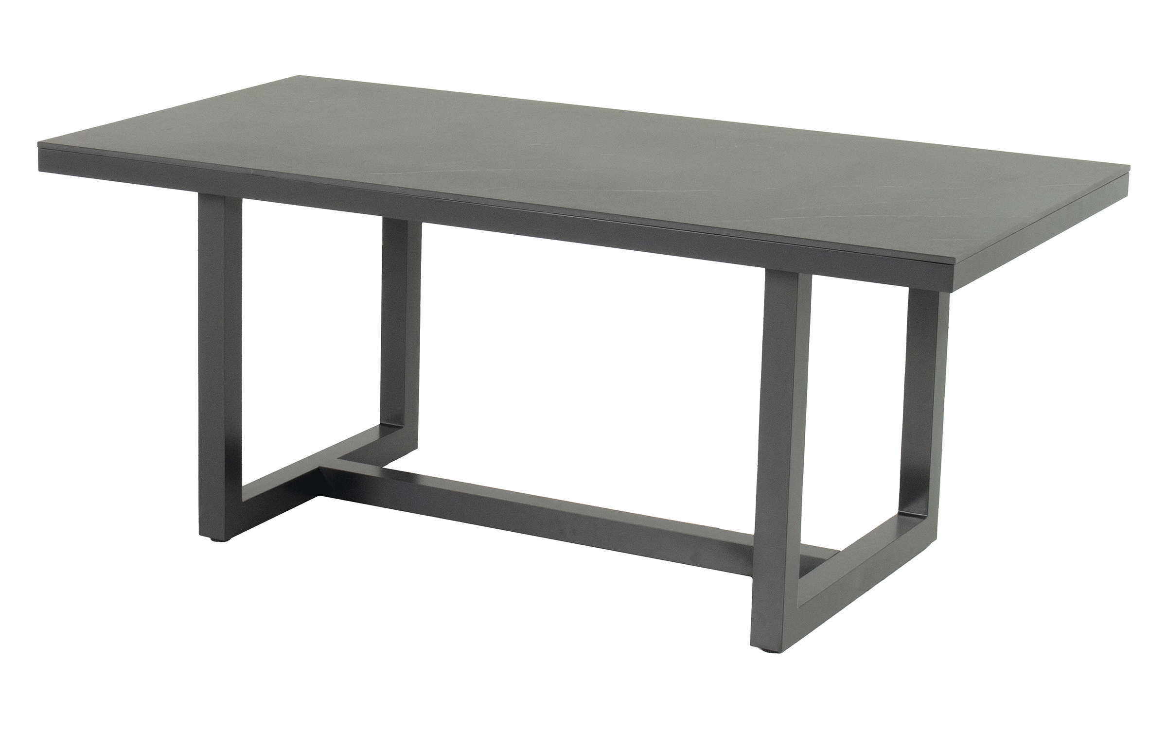 Stół ogrodowy GIO ma blat ceramiczny osadzony na aluminiowej podstawie – takie połączenie zapewnia wysoką wytrzymałość i stabilność, a minimalistyczna forma łatwo wpisuje się w różne aranżacje tarasu.