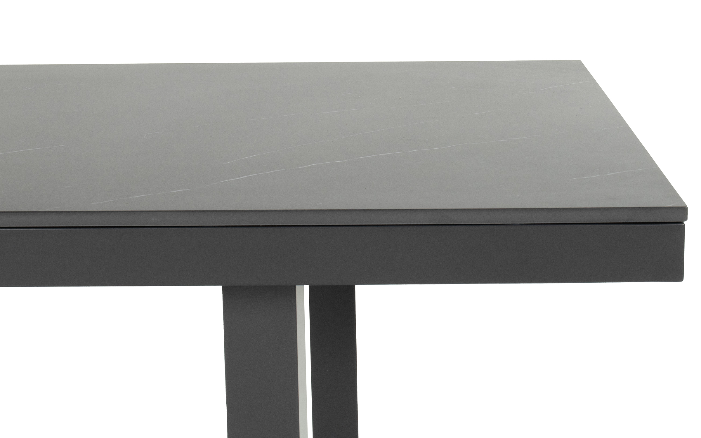 Konstrukcja z aluminium malowanego proszkowo w kolorze antracyt. Blat stołu ceramiczny imitacja terazzo. Siedzisko/oparcie krzeseł z tekstyliny; poduszki z tkaniny olefin, zdejmowane pokrowce, wypełnienie Quick Dry Foam.