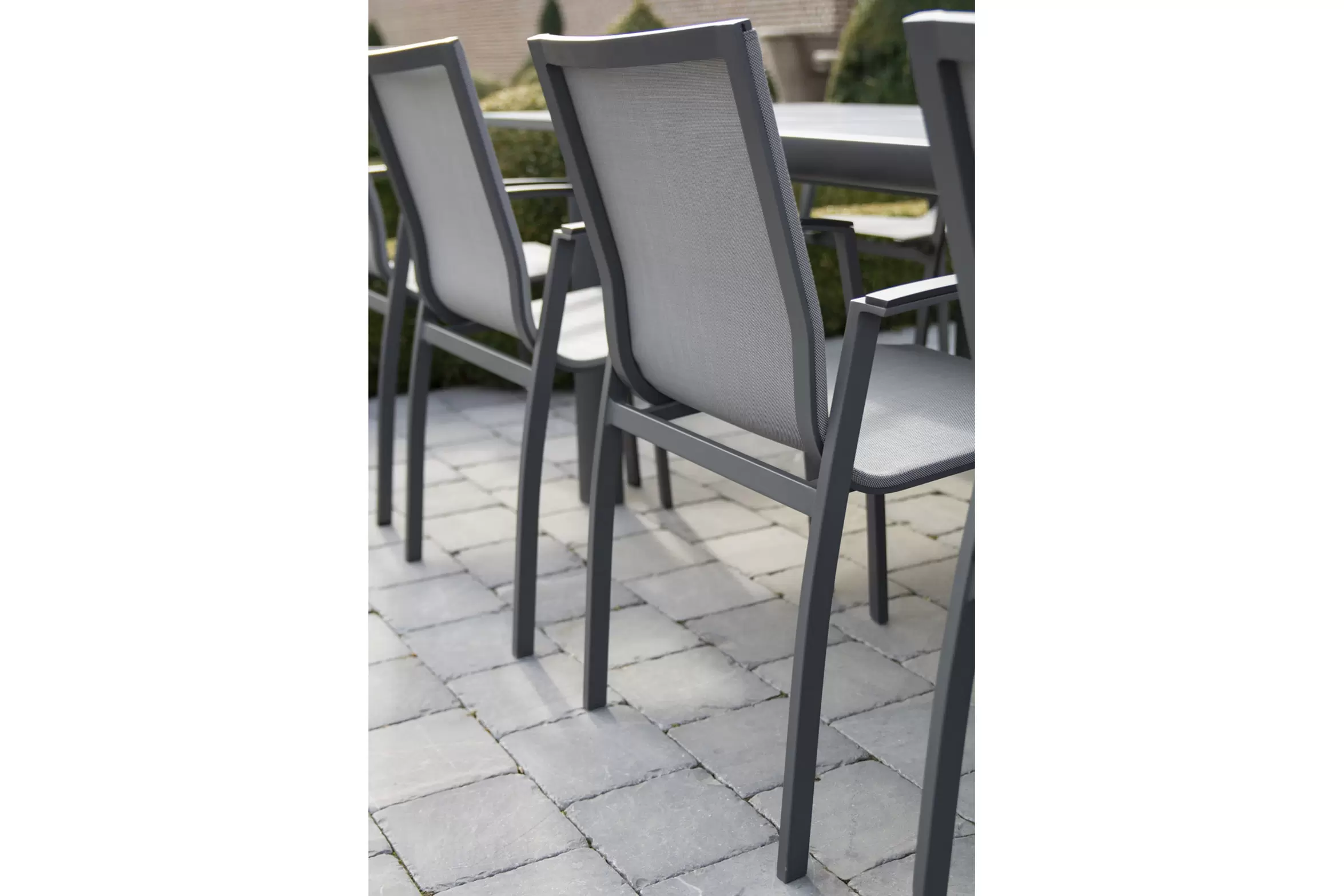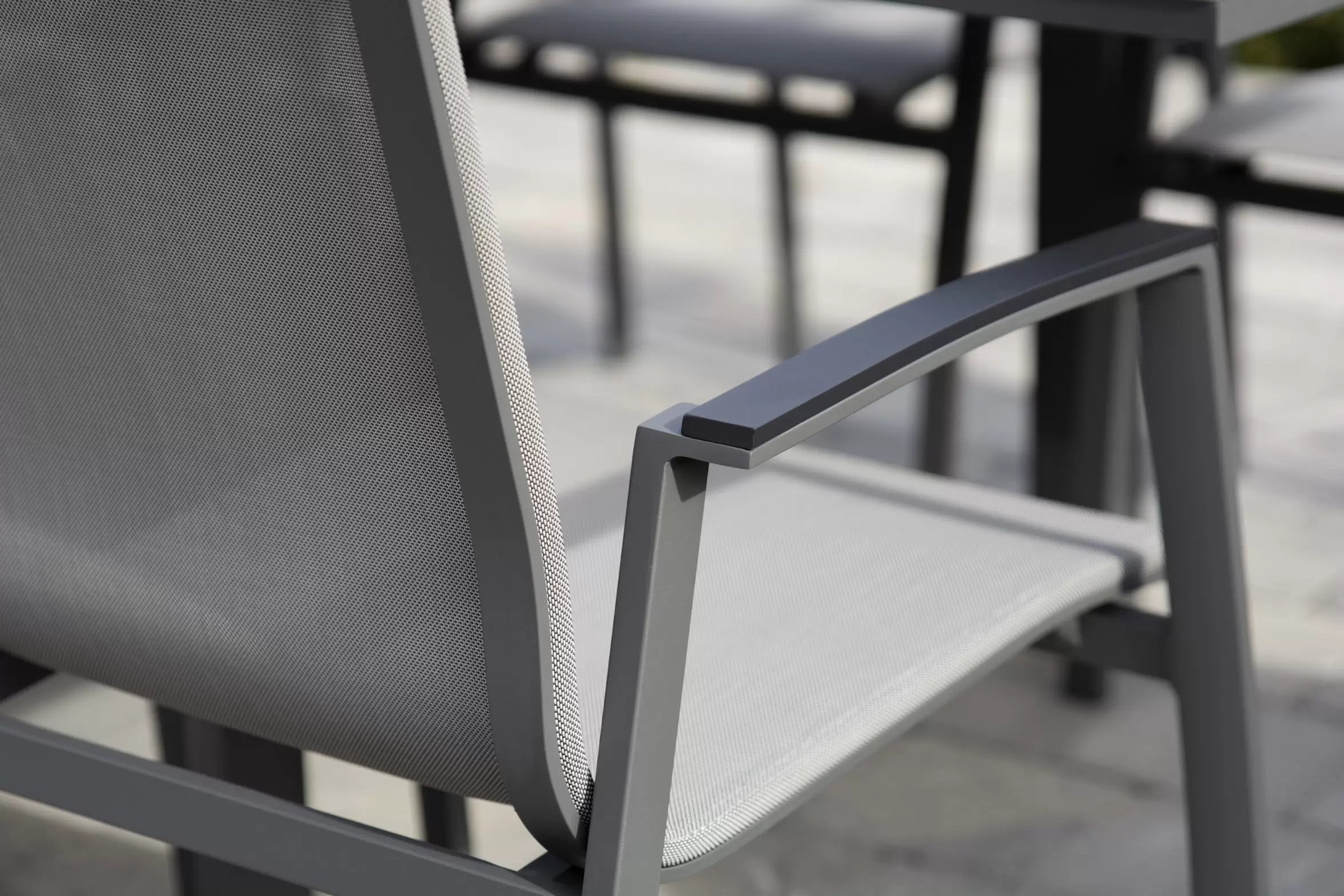 Fotele o konstrukcji aluminiowej z siedziskami z tekstyliny. Podłokietniki kompozyt.