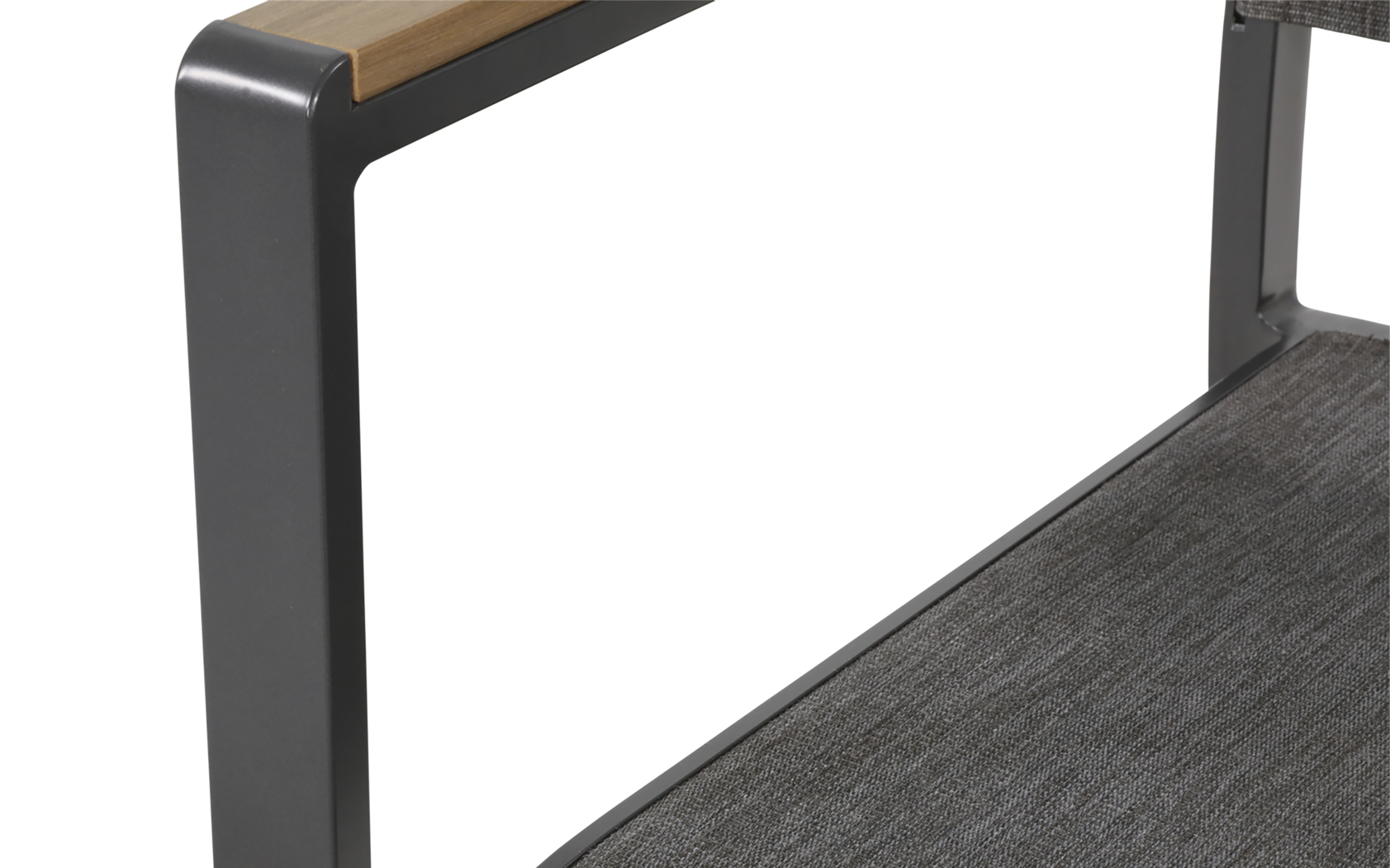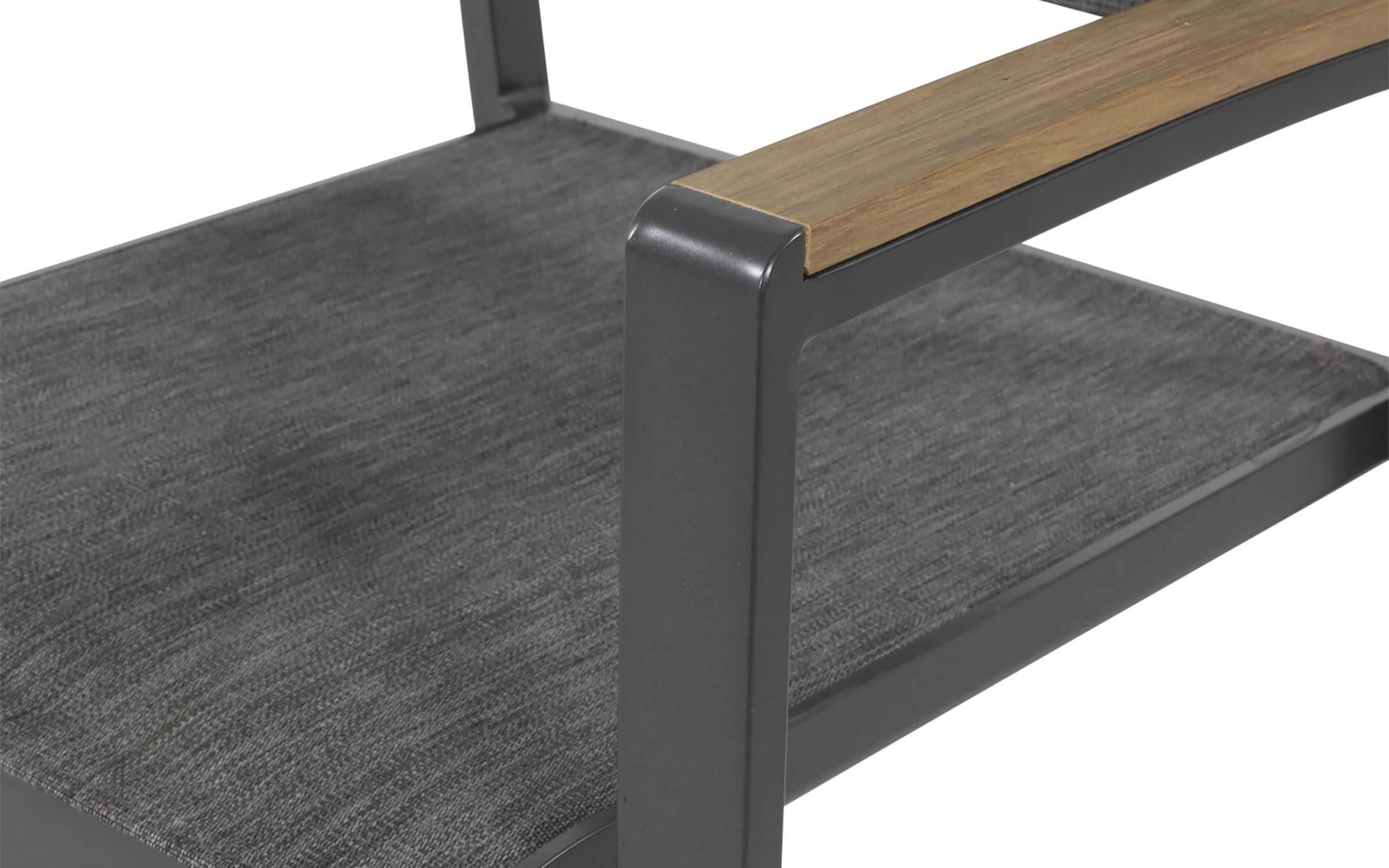Siedzisko i oparcie wykonane z tekstyliny w kolorze szarym zapewniają komfort użytkowania, a aluminiowa rama w odcieniu antracyt gwarantuje trwałość i odporność na korozję.