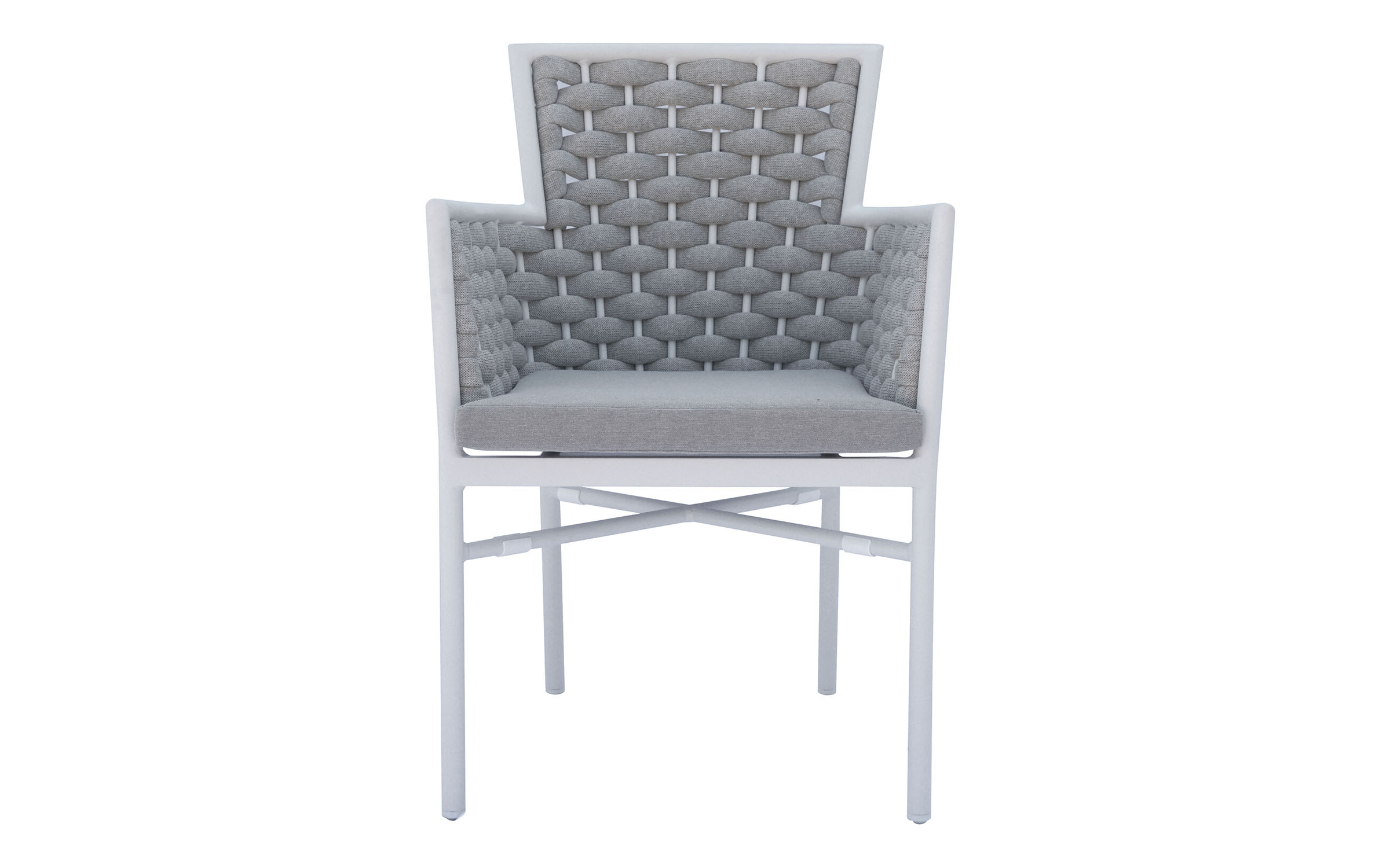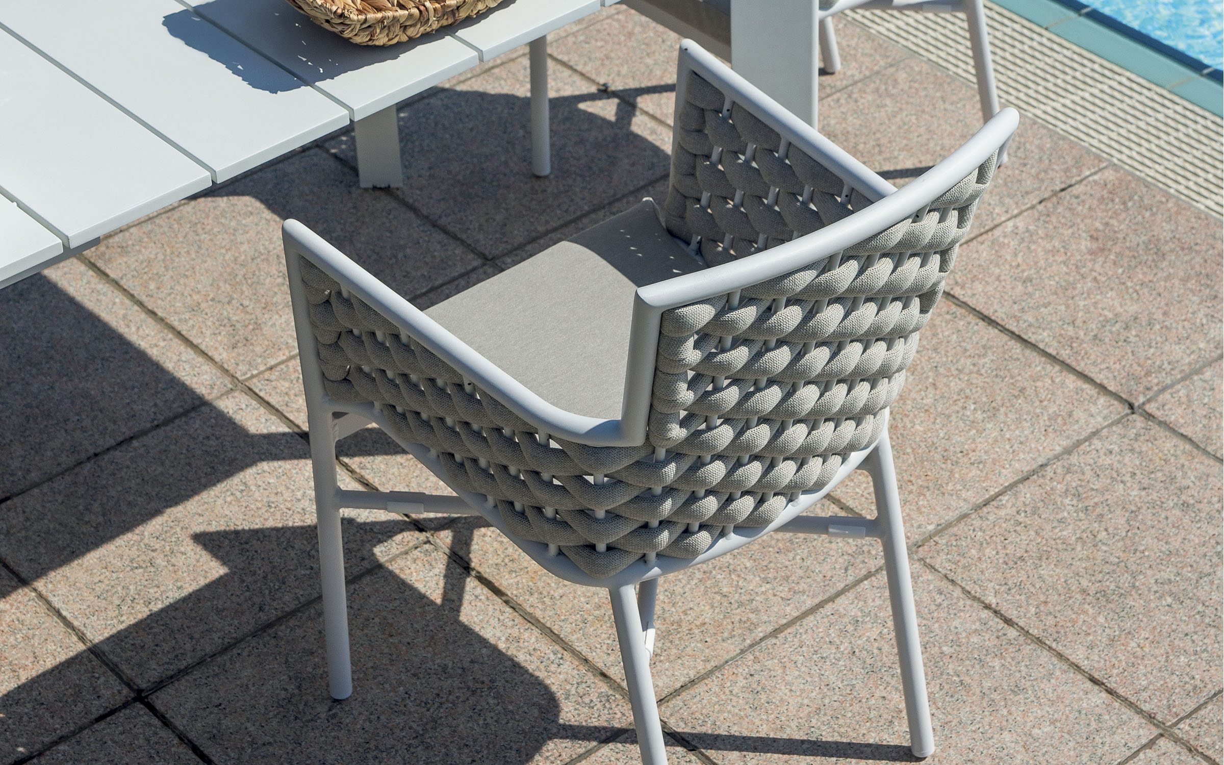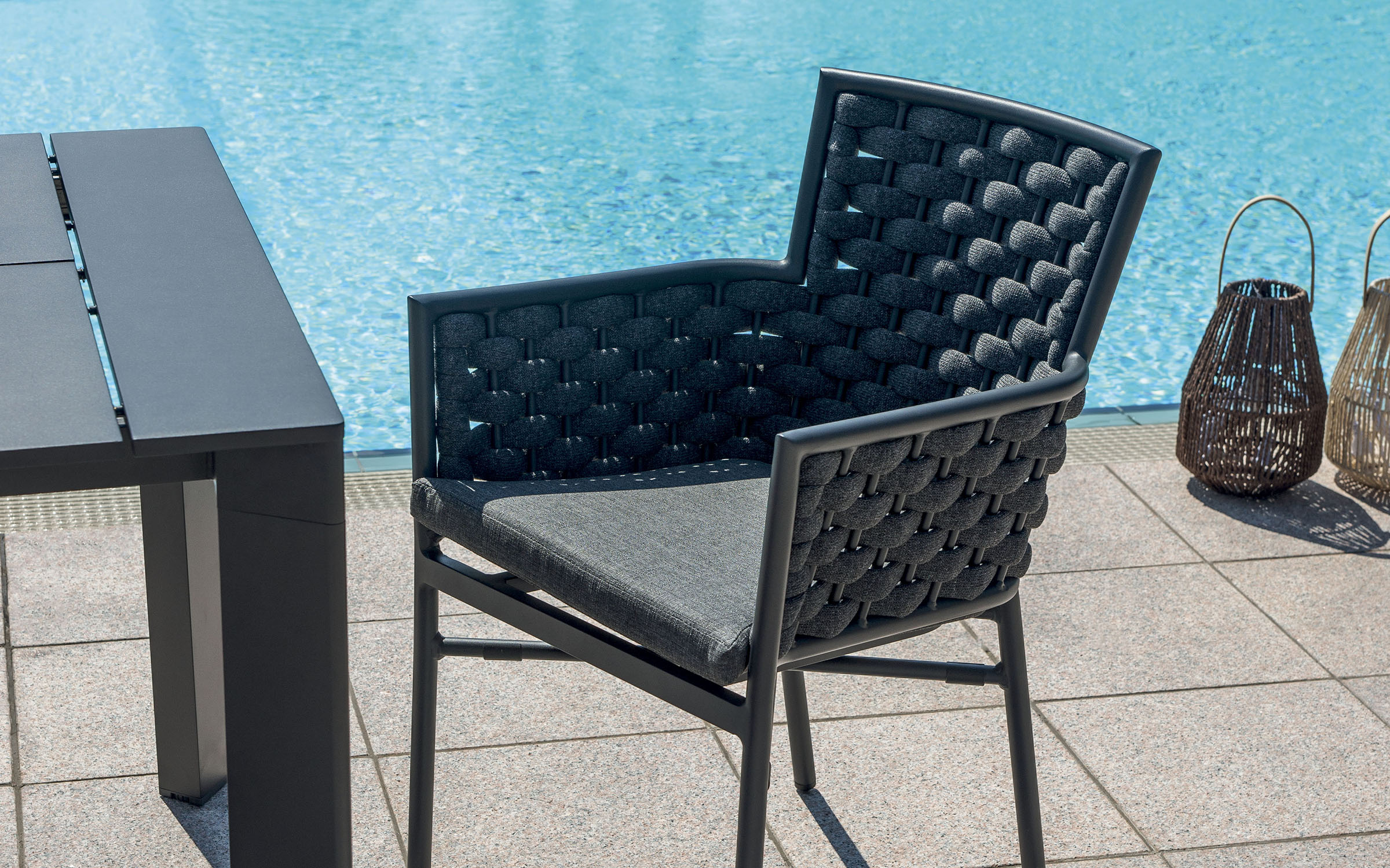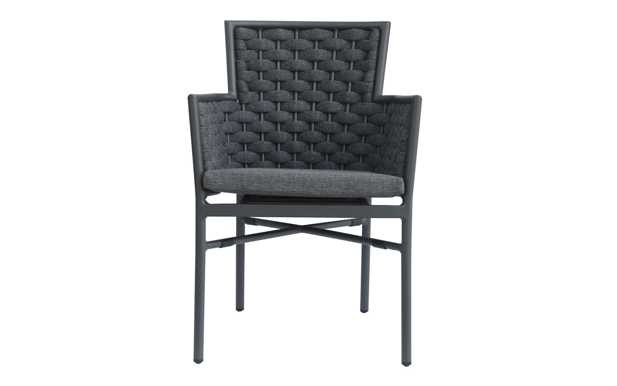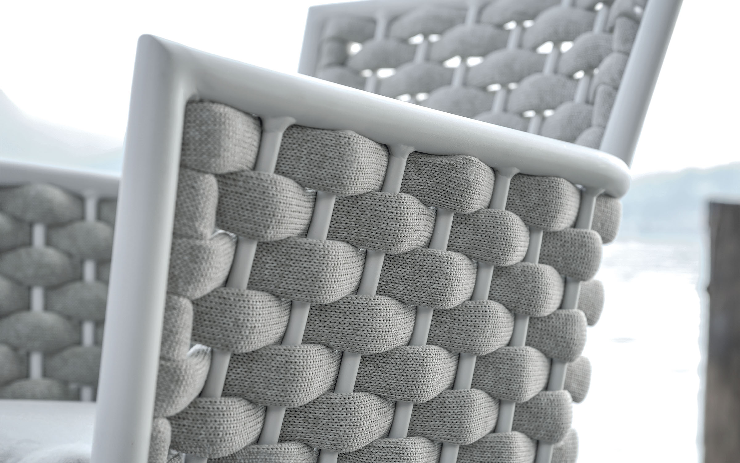 Krzesło sztaplowane do ogródków piwnych wykonane z aluminium z oplotem na bokach i oparciu z miękkich pasów olefinowego materiału z piankowym wypełnieniem.