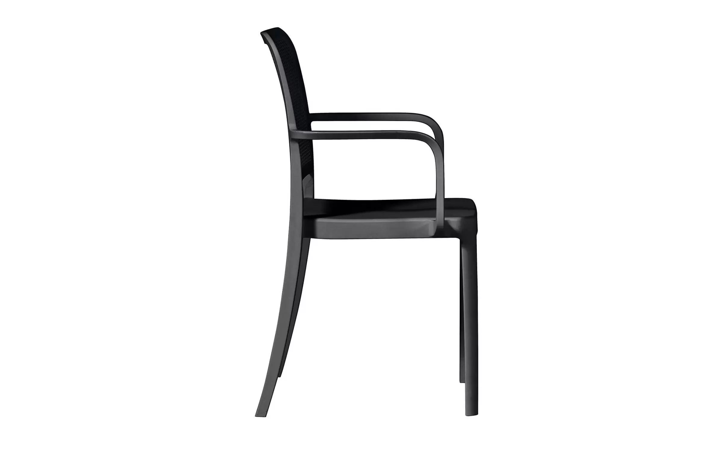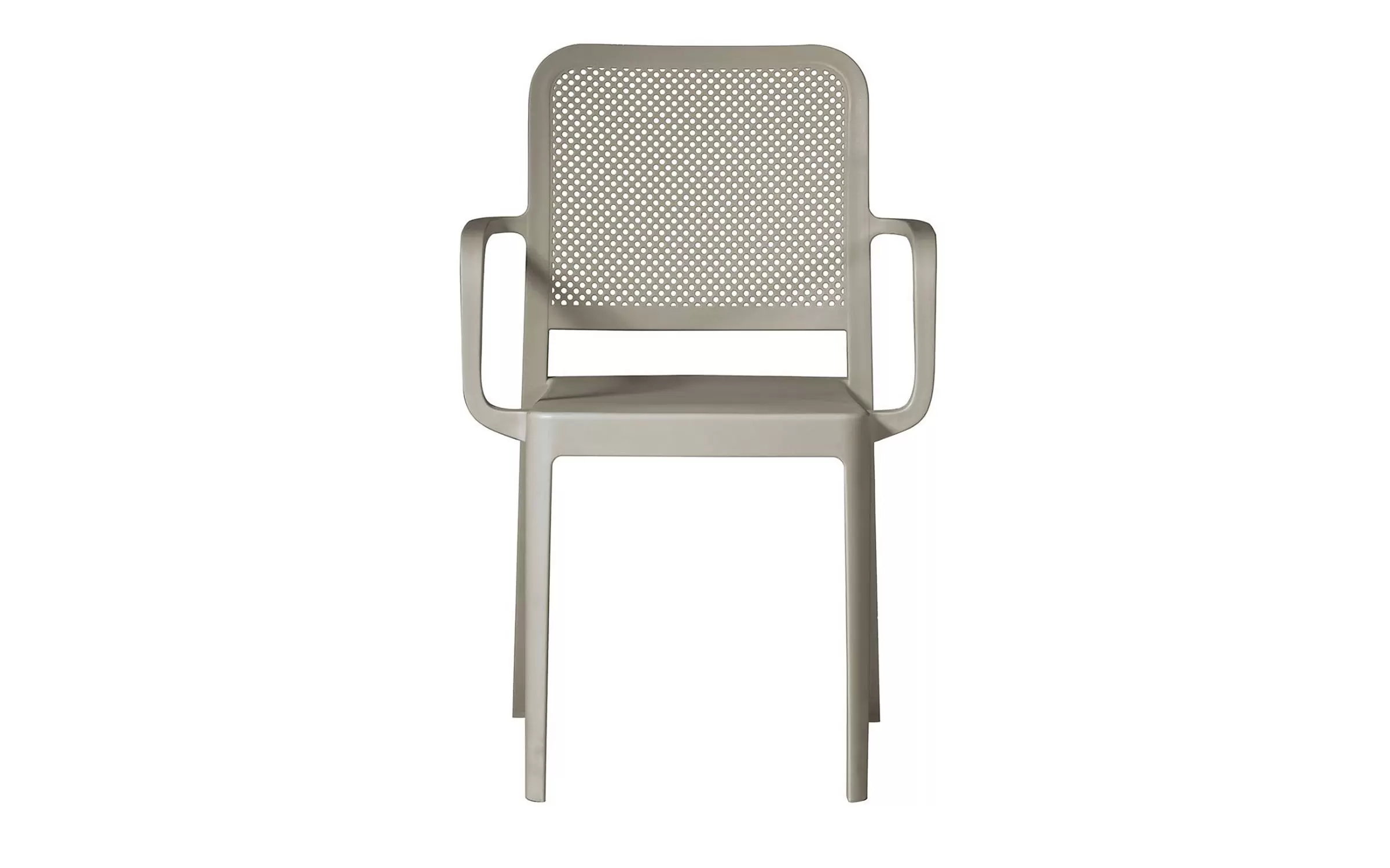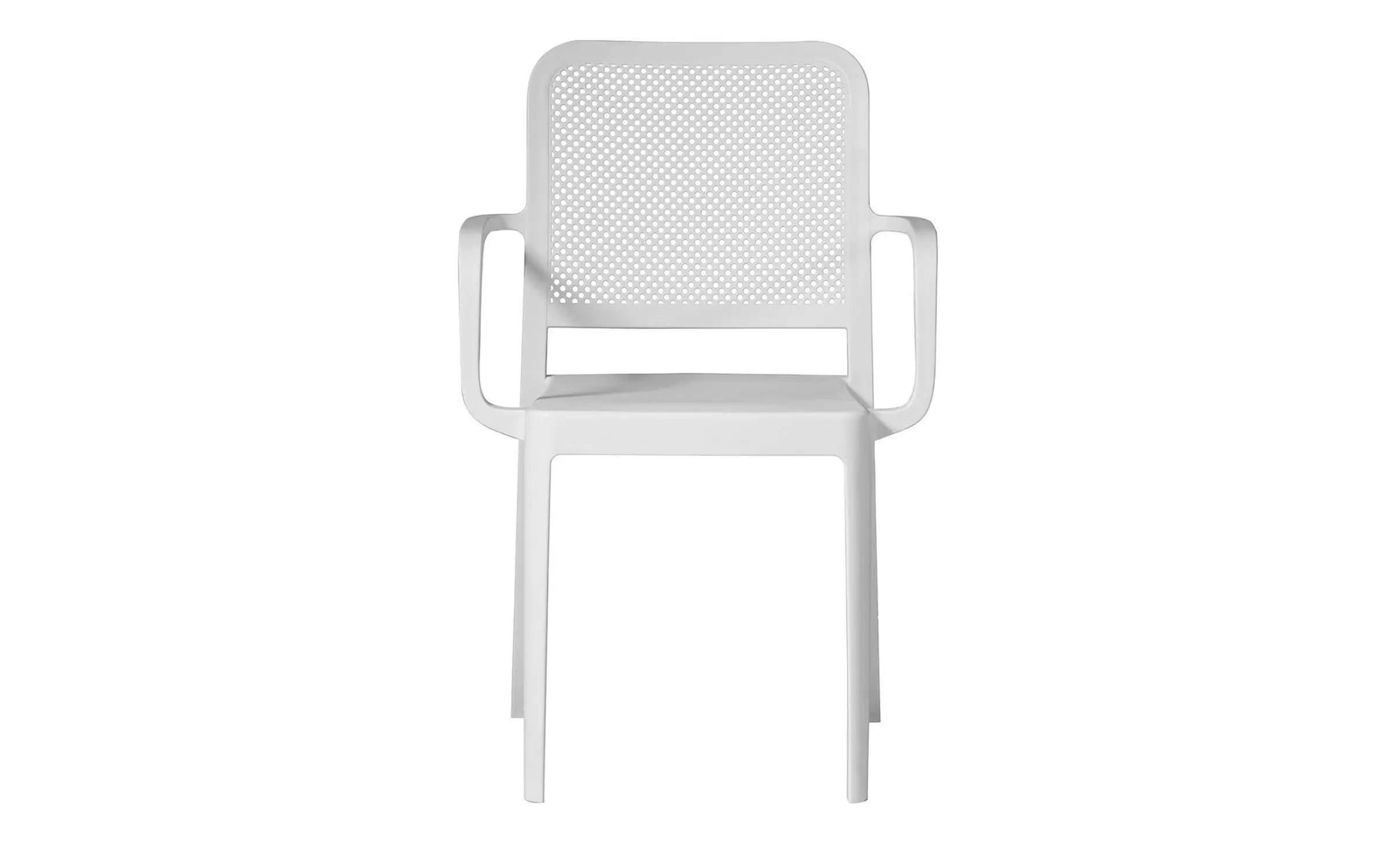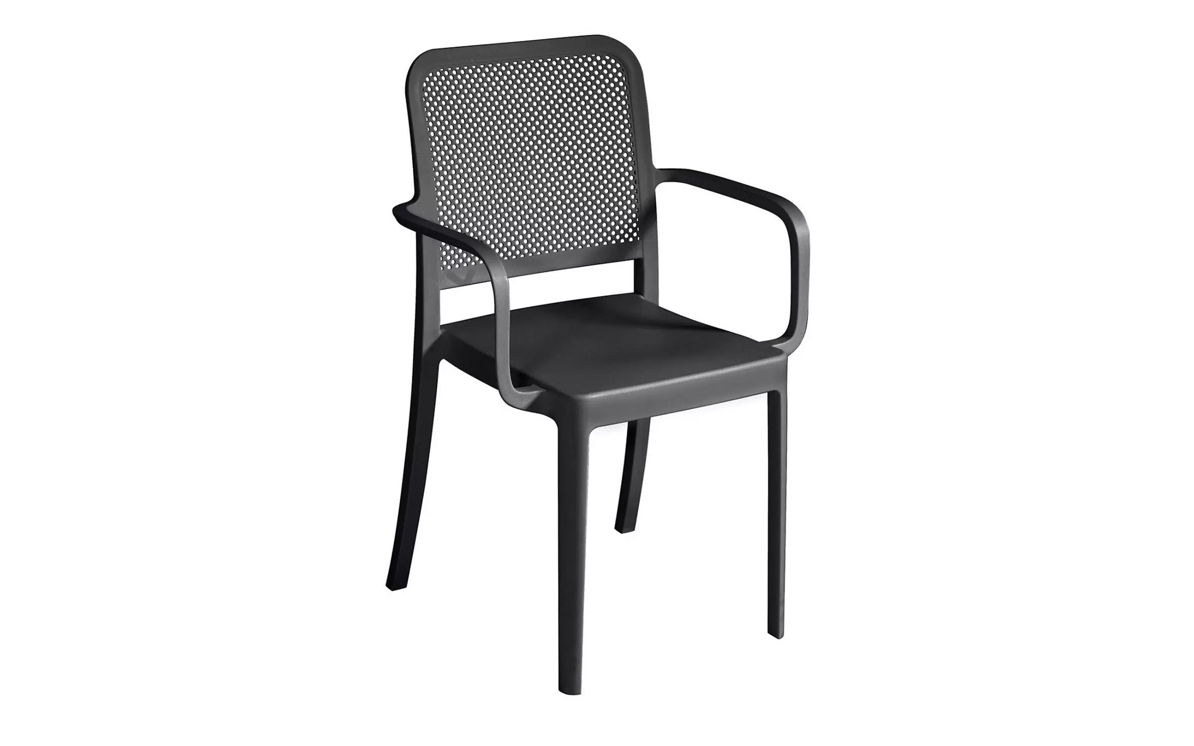 Sztaplowany fotel z podłokietnikami wykonane z polipropylenu wzmocnionego włóknem szklanymi. Nowoczesna forma i wygodne siedzisko oraz materiały powodują, że może być użytkowana cały rok na zewnątrz. W całości wykonana z włókna szklanego oraz z żywicy syntetycznej (żywica polipropylenowa z dodatkami zabezpieczającymi przed promieniowaniem UV, barwiona w masie). Sztaplowane.