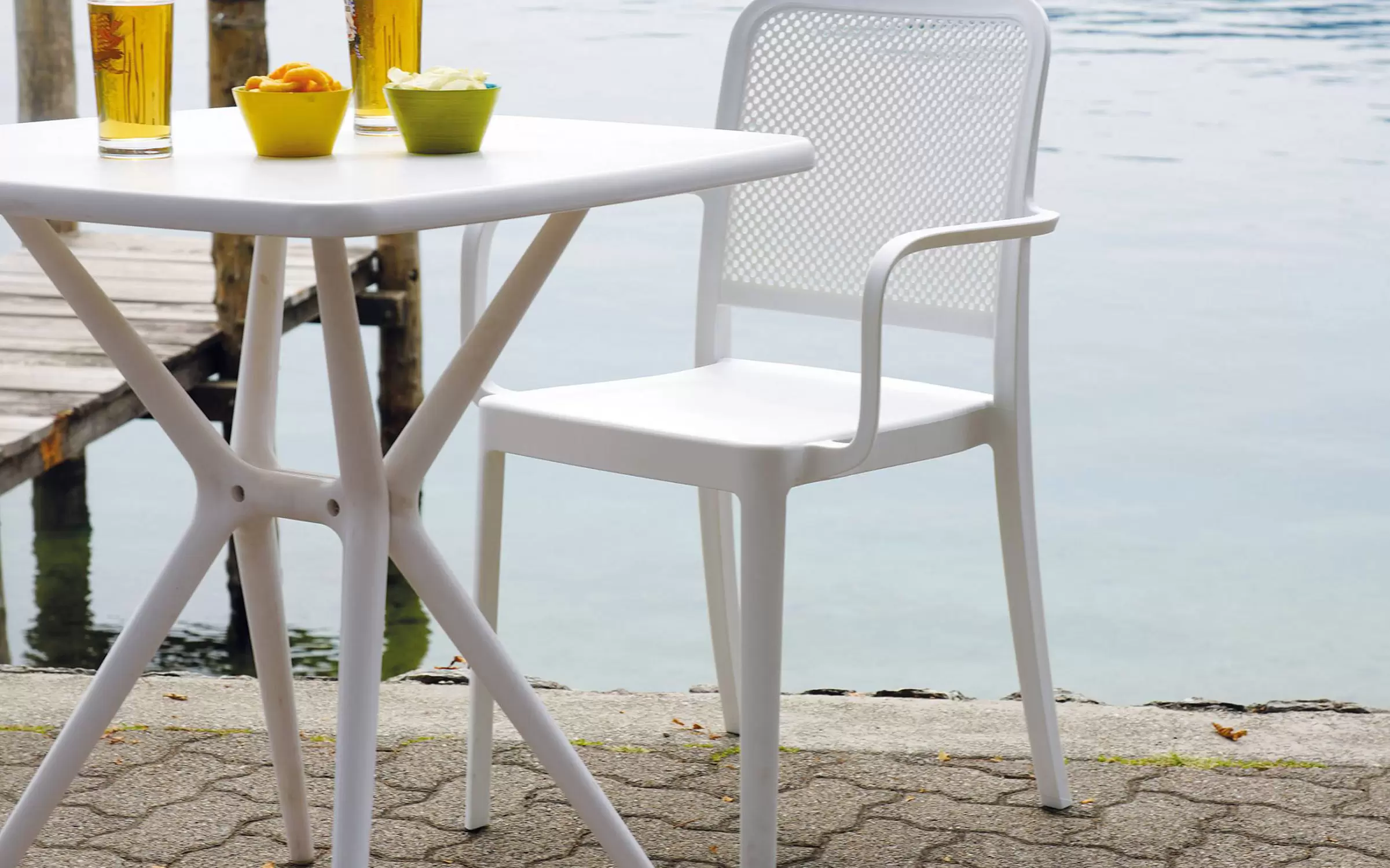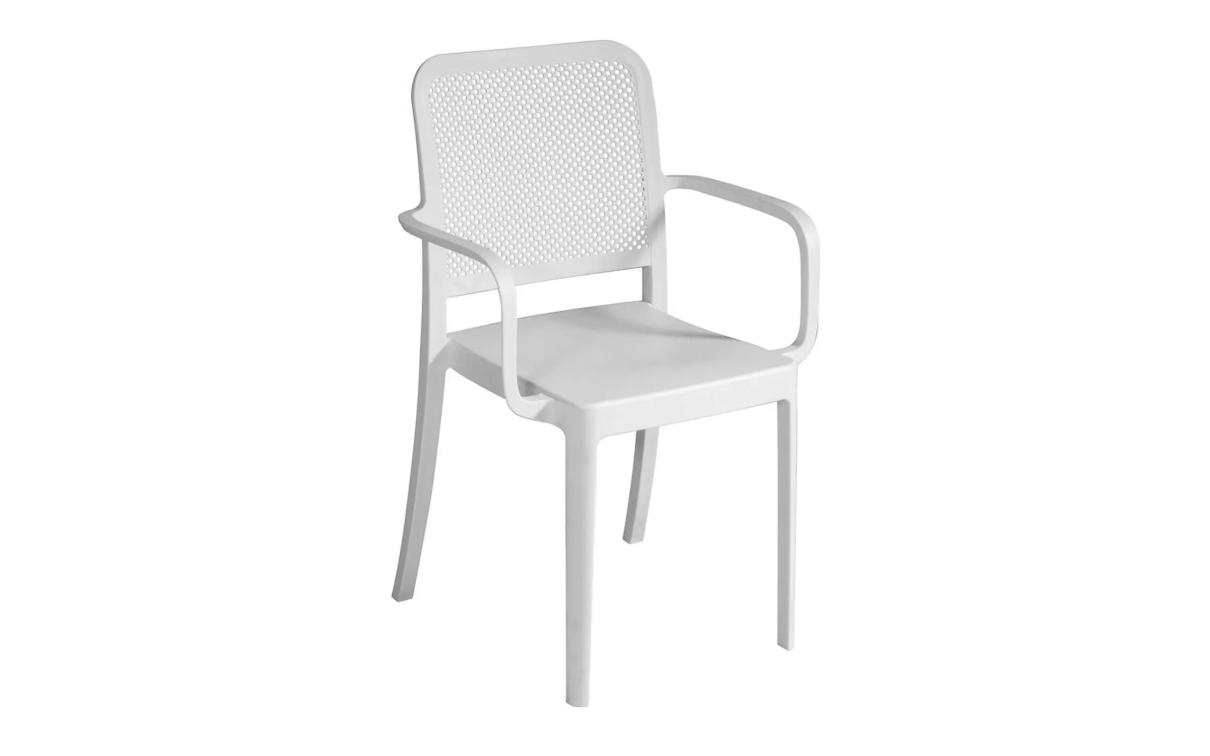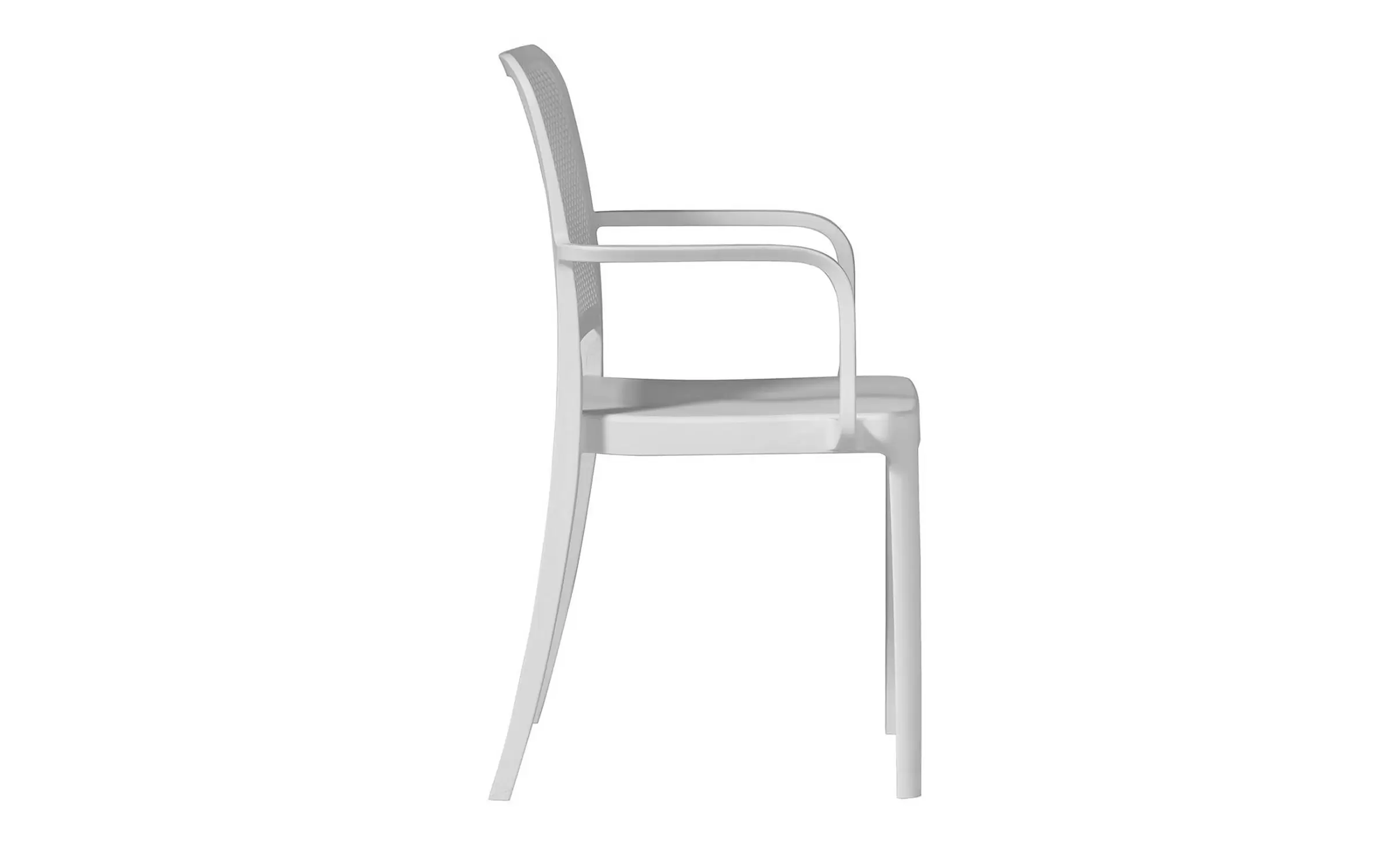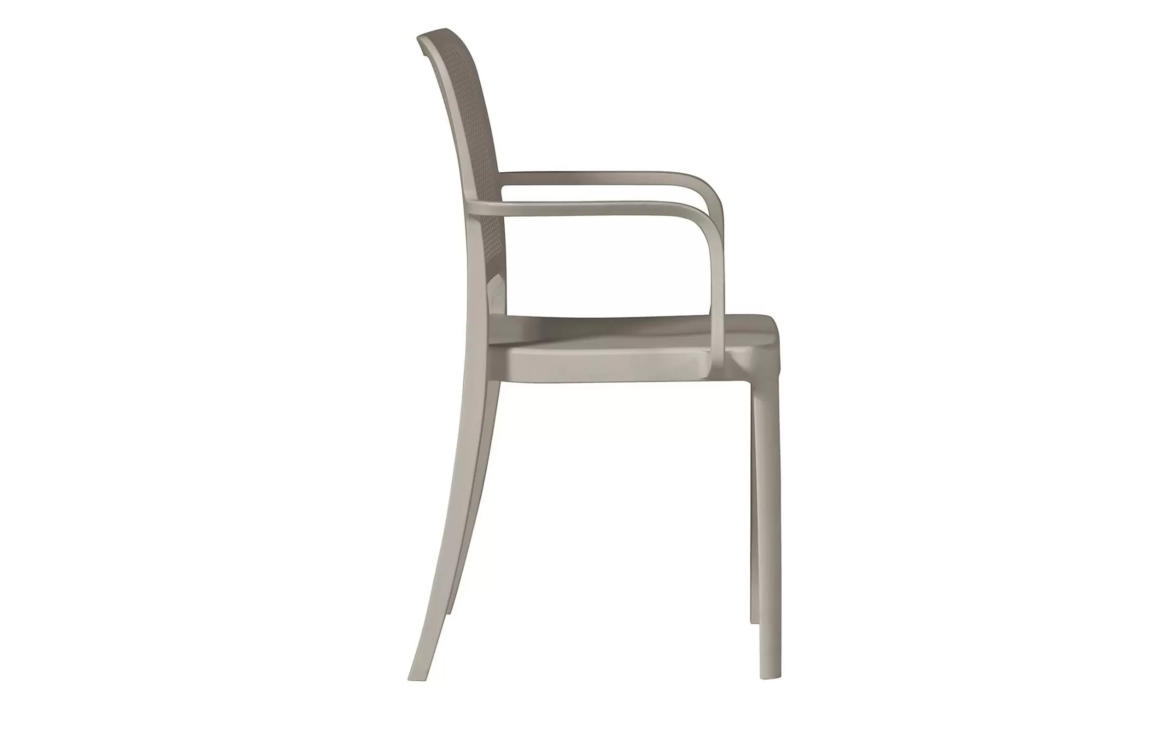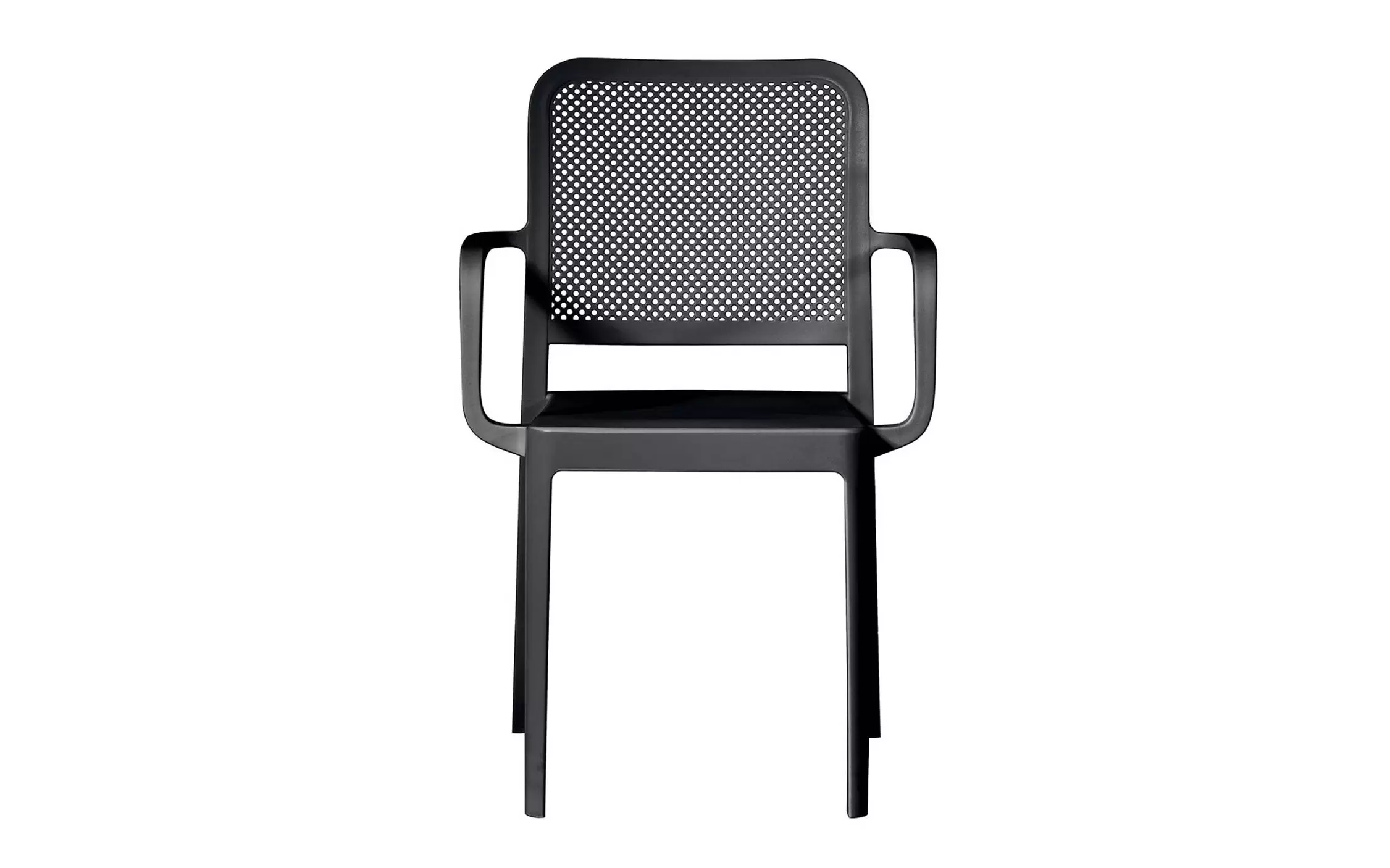 Sztaplowany fotel z podłokietnikami wykonane z polipropylenu wzmocnionego włóknem szklanymi. Nowoczesna forma i wygodne siedzisko oraz materiały powodują, że może być użytkowana cały rok na zewnątrz. W całości wykonana z włókna szklanego oraz z żywicy syntetycznej (żywica polipropylenowa z dodatkami zabezpieczającymi przed promieniowaniem UV, barwiona w masie). Sztaplowane.