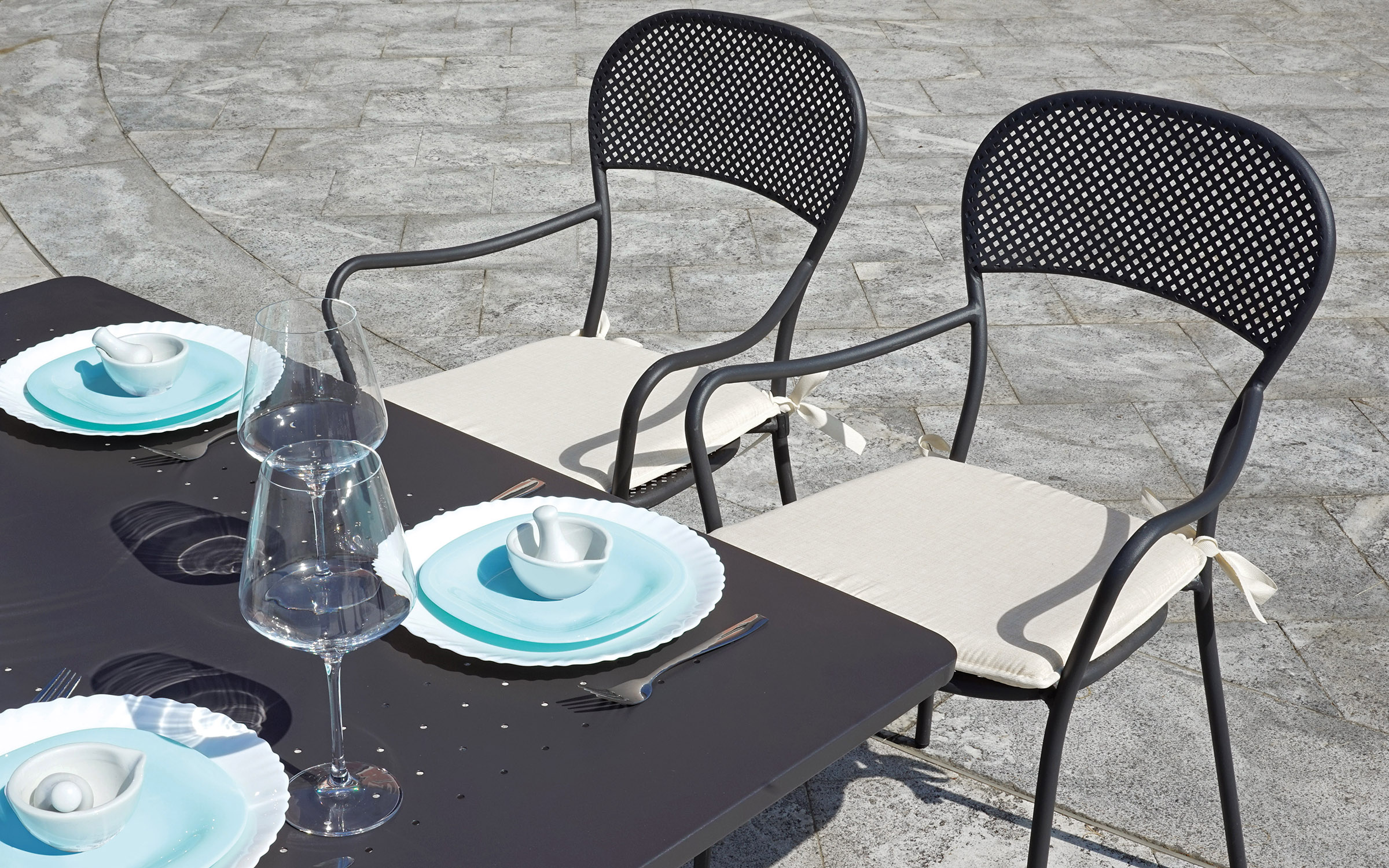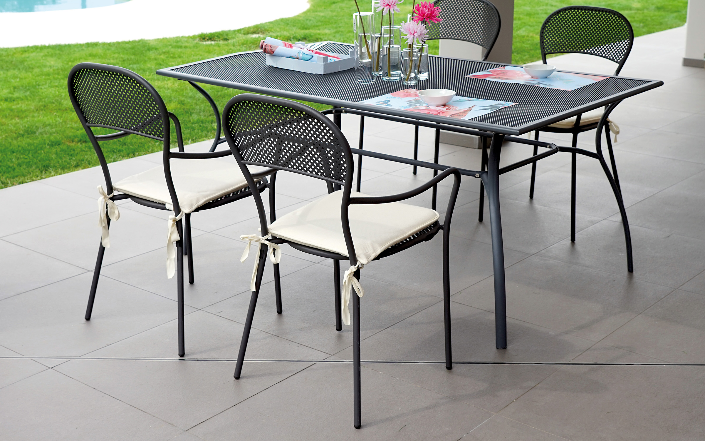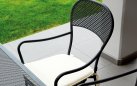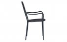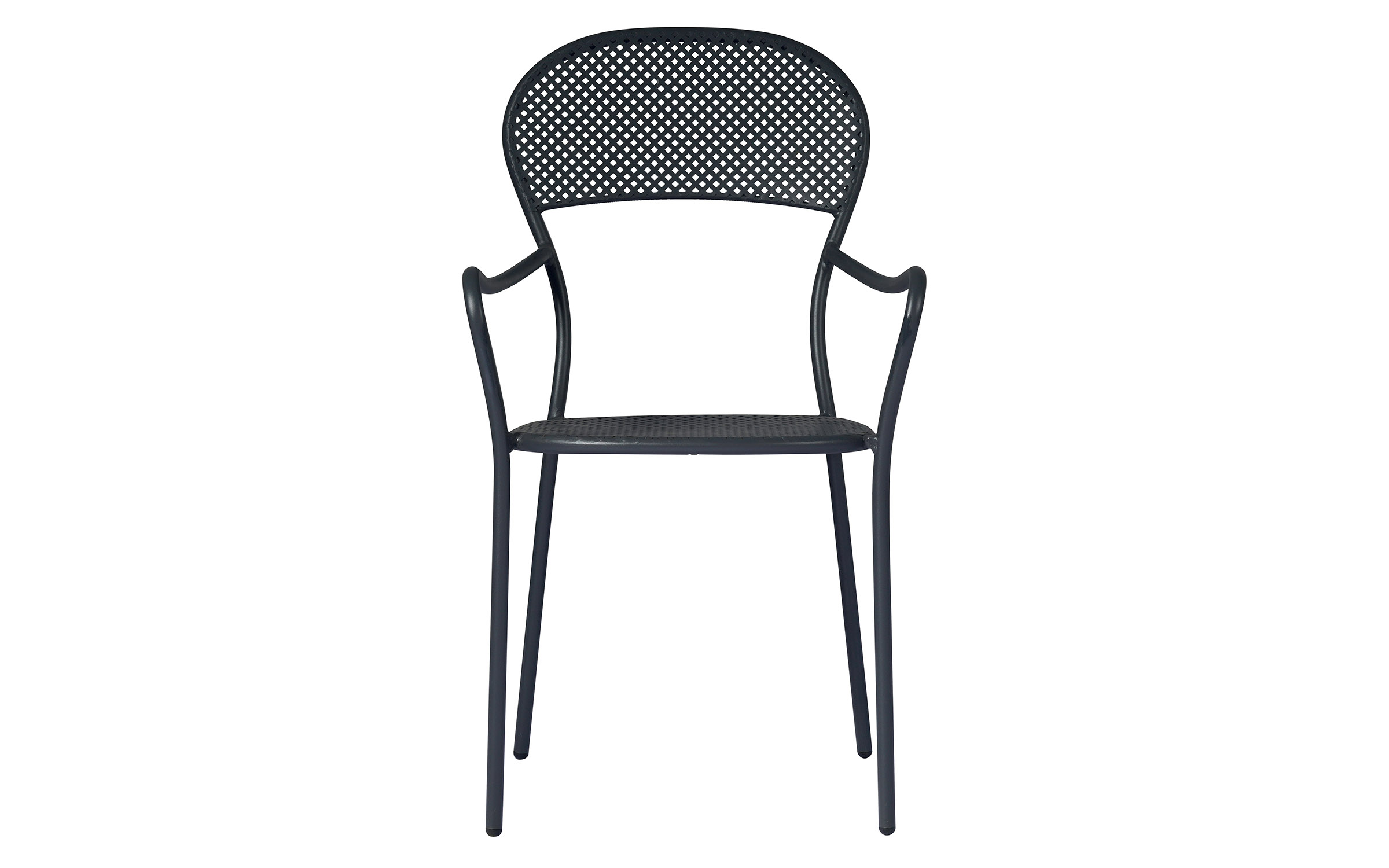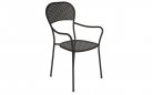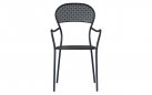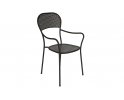 Fotel ogrodowy z podłokietnikami wykonany z prętów stalowych cynkowanych i malowanych proszkowo na kolor ciemnoszary. Mocna i stabilna konstrukcja nadająca się do zastosowania w ogródkach przy restauracjach. Siedzisko i oparcie z wyciętym wzorem rombu. Opcjonalnie kremowa poduszka na siedzisko.