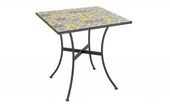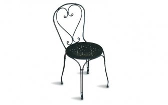 Fotel o konstrukcji stalowej malowanej proszkowo na kolor czarny. Na oparciu wpleciono okrągły element ozdobny z mozaiki w stylu artdeco.