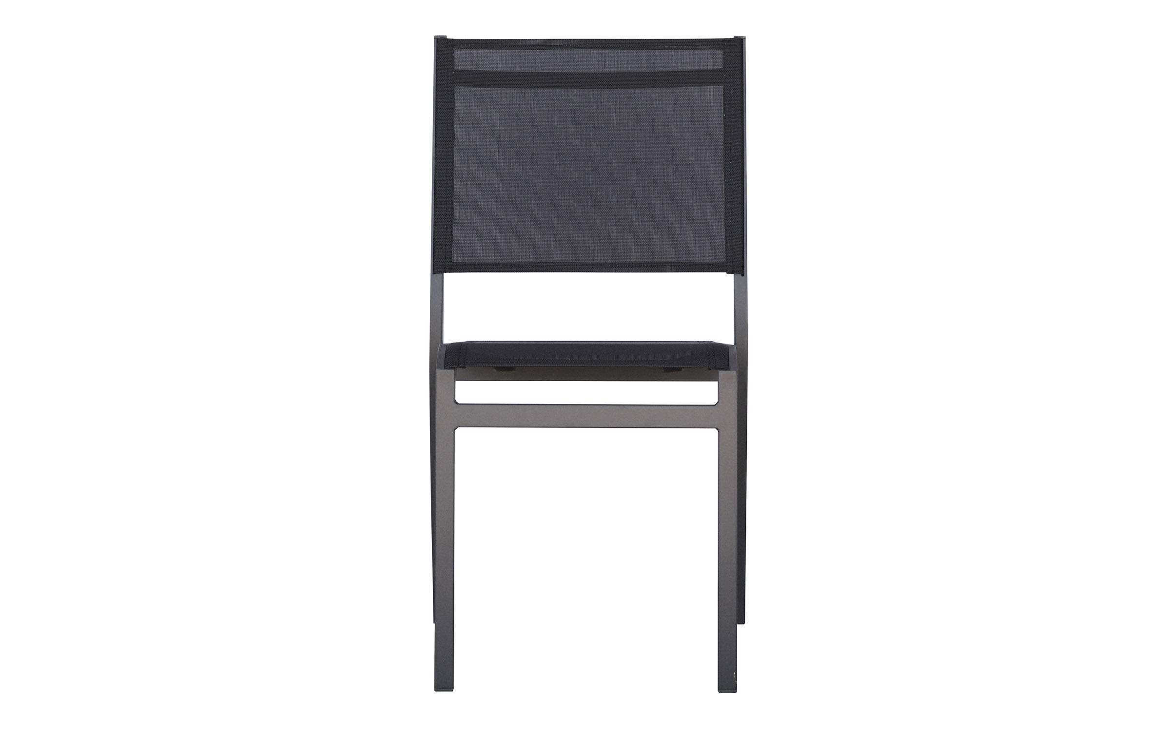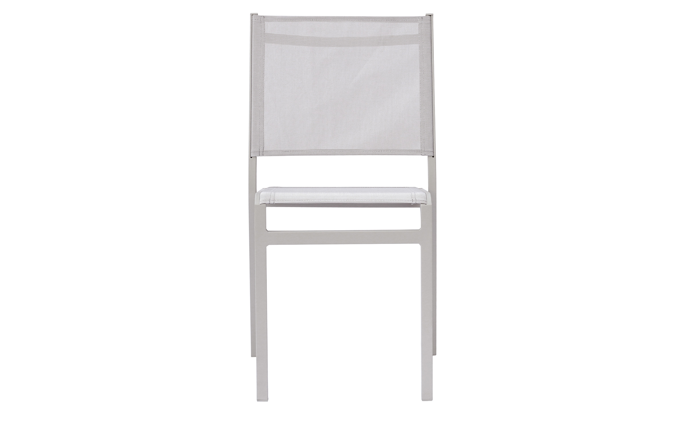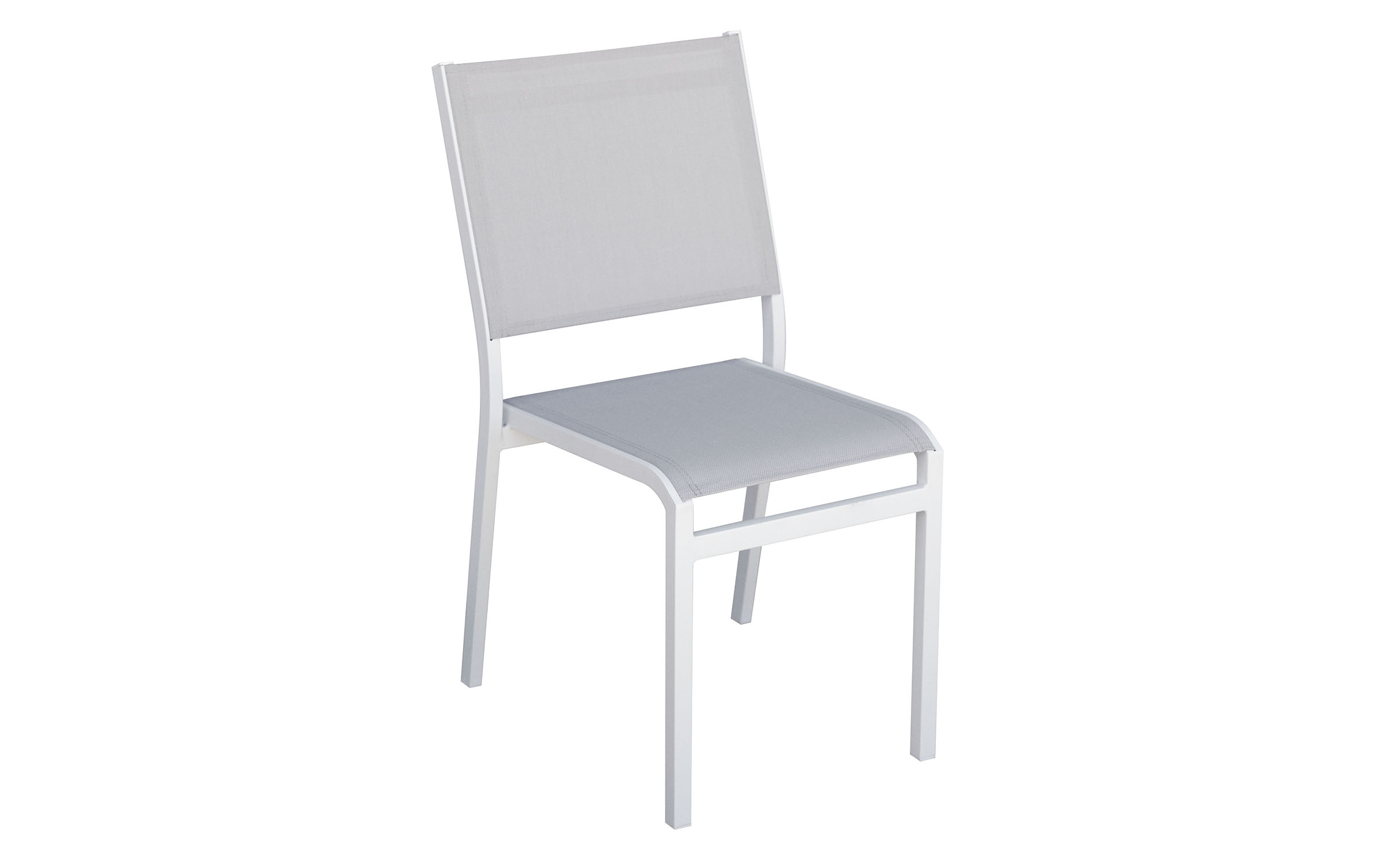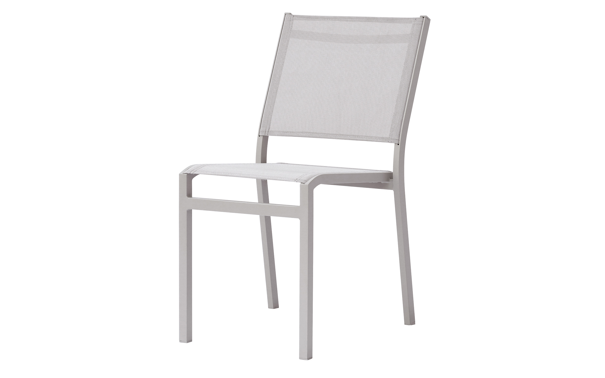 Minimalistyczne krzesło ogrodowe bez podłokietników, wykonane z aluminium malowanego proszkowo oraz tekstyliny odpornej na warunki atmosferyczne. Konstrukcja sztaplowana pozwala na wygodne przechowywanie. Idealne do zestawów jadalnianych na tarasie lub balkonie. Dostępne w dwóch wersjach kolorystycznych: