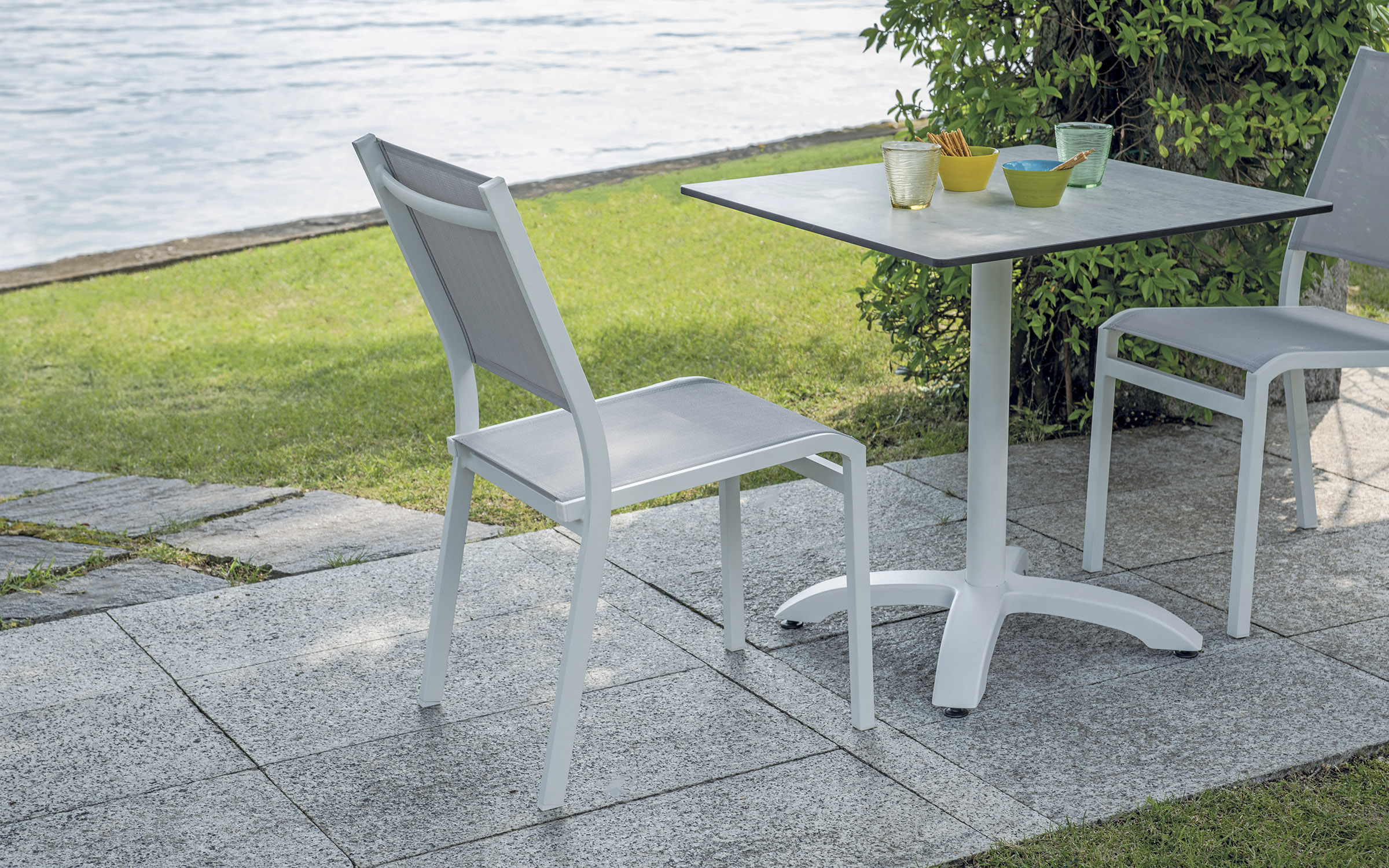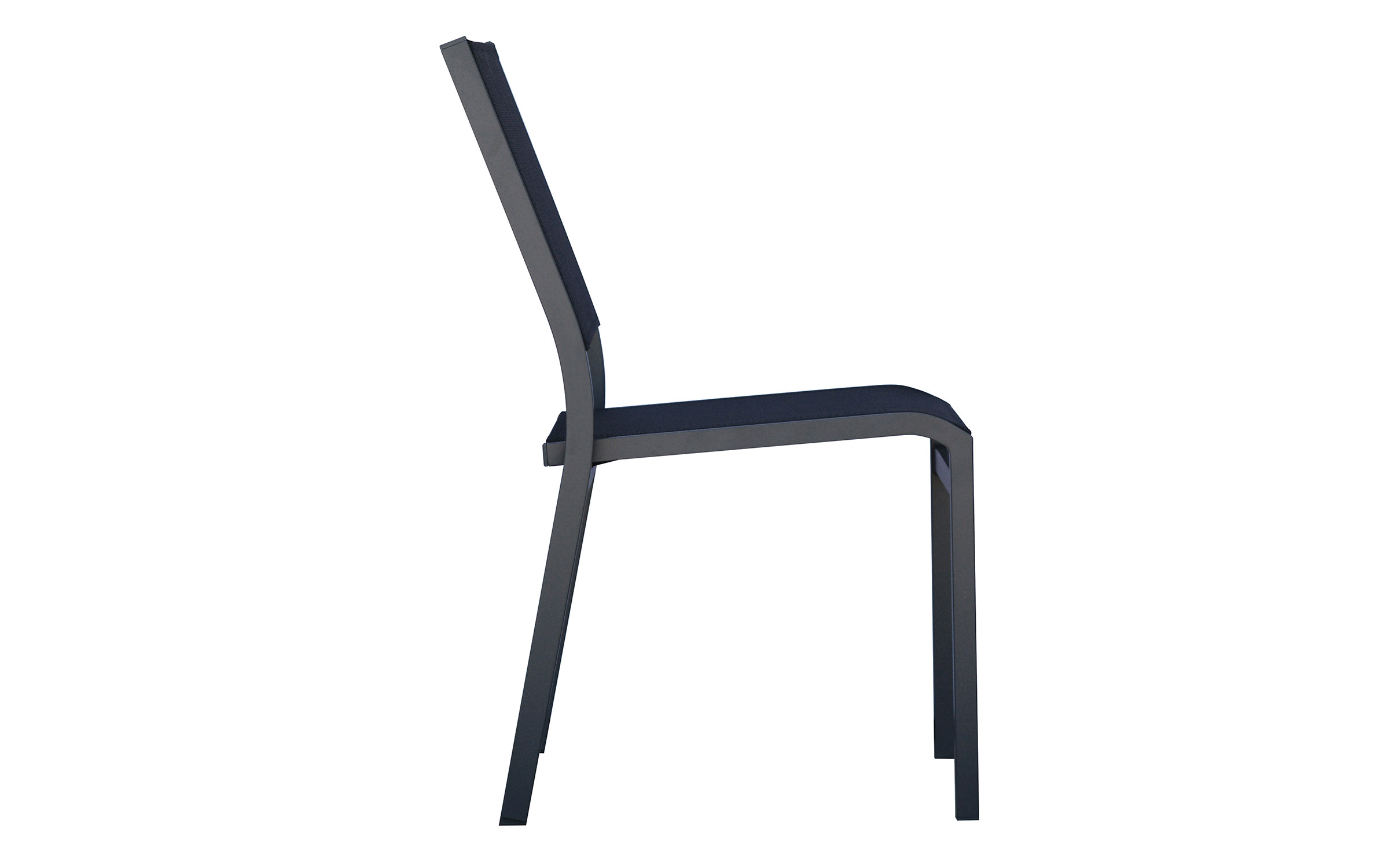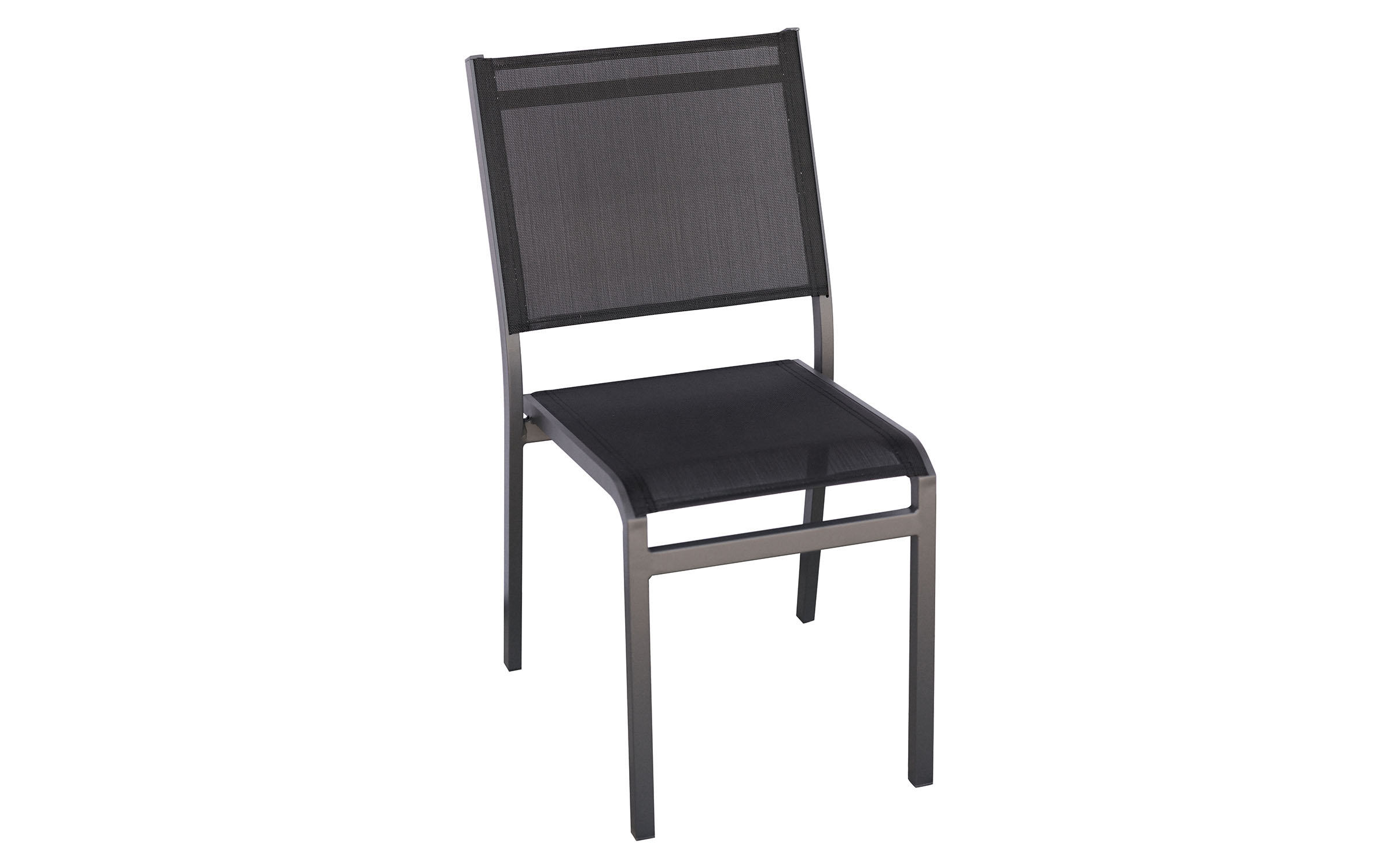 Minimalistyczne krzesło ogrodowe bez podłokietników, wykonane z aluminium malowanego proszkowo oraz tekstyliny odpornej na warunki atmosferyczne. Konstrukcja sztaplowana pozwala na wygodne przechowywanie. Idealne do zestawów jadalnianych na tarasie lub balkonie. Dostępne w dwóch wersjach kolorystycznych: