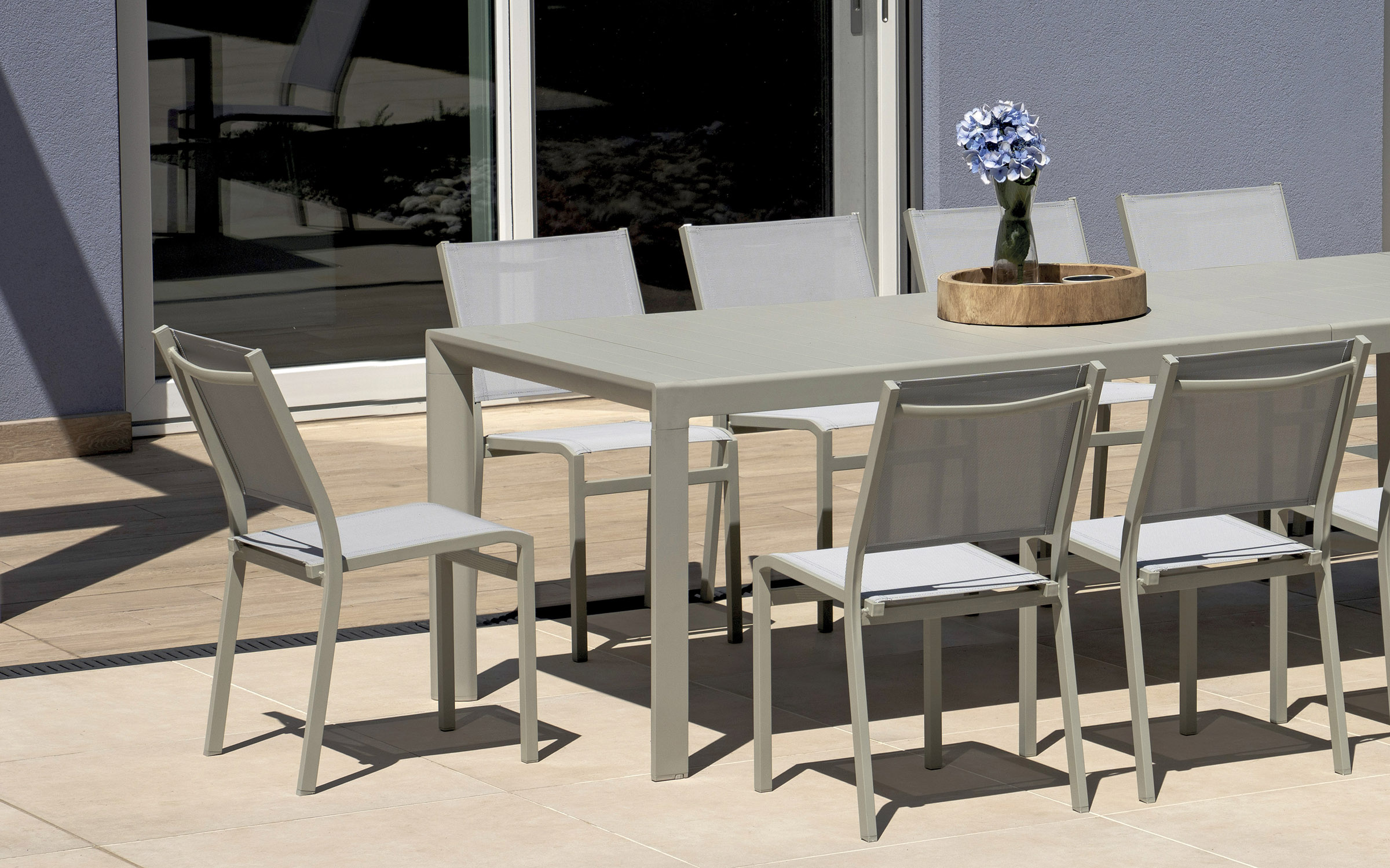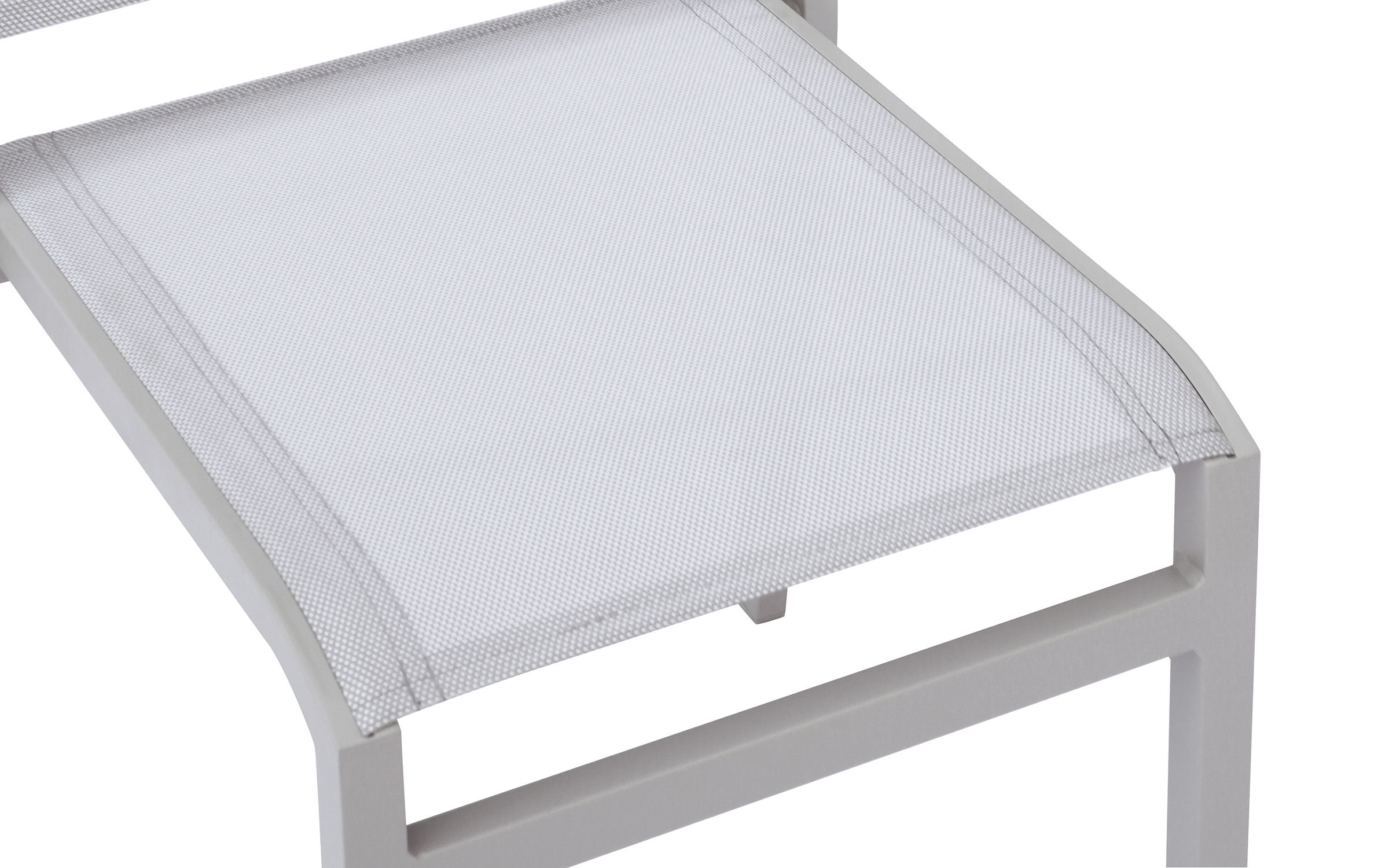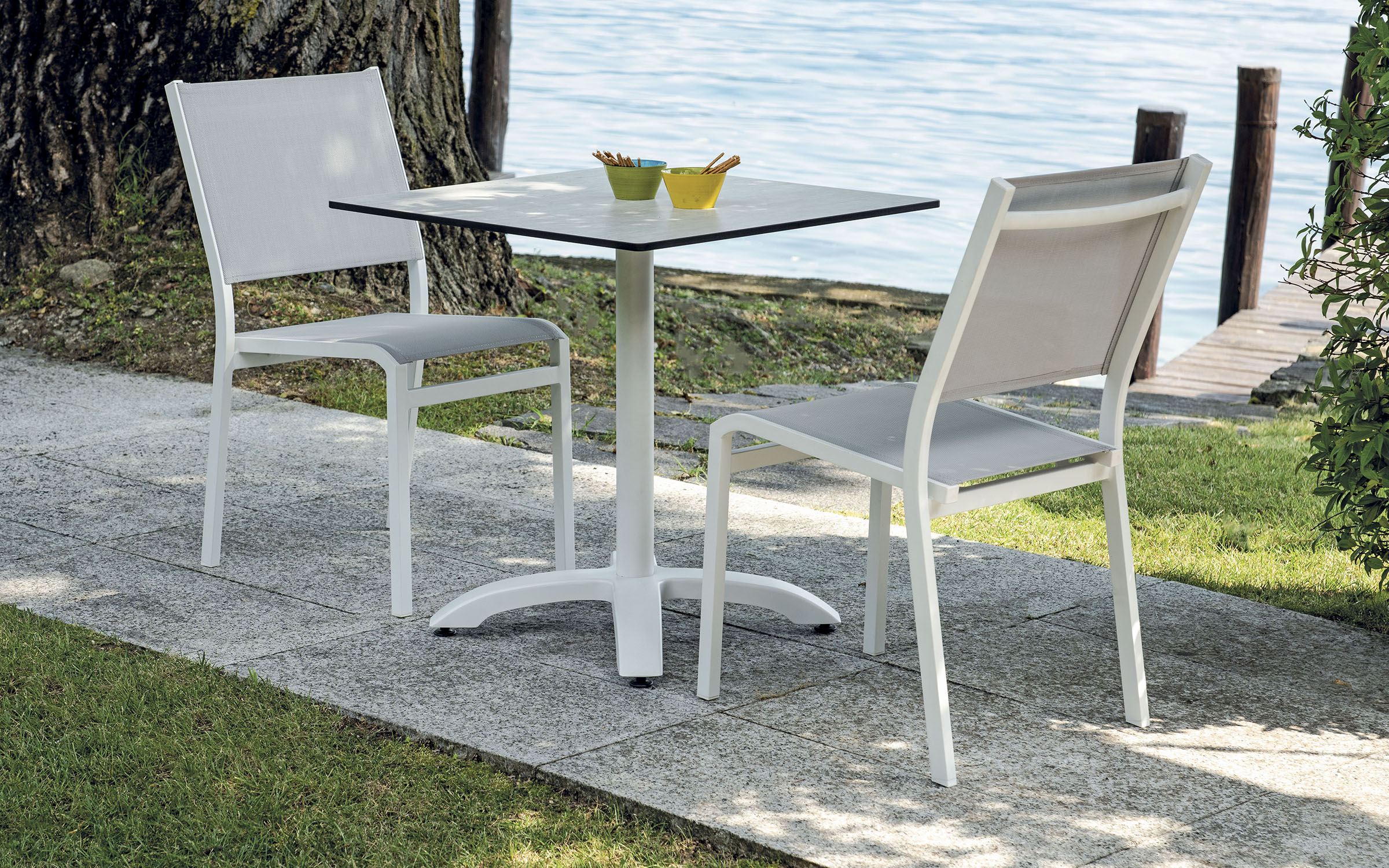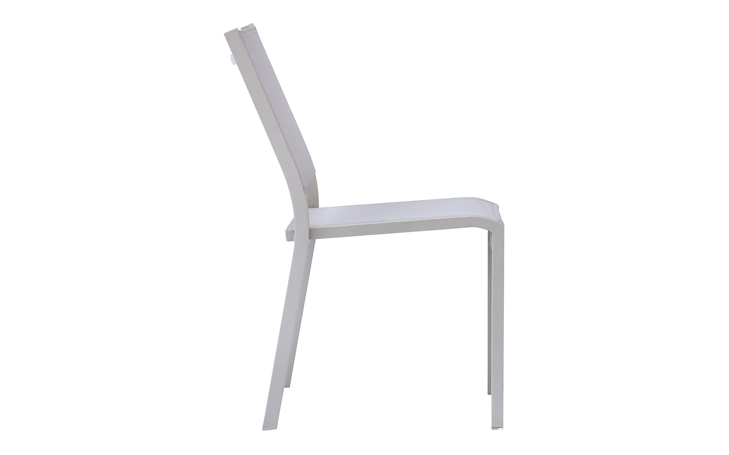 Minimalistyczne krzesło ogrodowe bez podłokietników, wykonane z aluminium malowanego proszkowo oraz tekstyliny odpornej na warunki atmosferyczne. Konstrukcja sztaplowana pozwala na wygodne przechowywanie. Idealne do zestawów jadalnianych na tarasie lub balkonie. Dostępne w dwóch wersjach kolorystycznych: