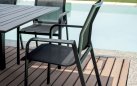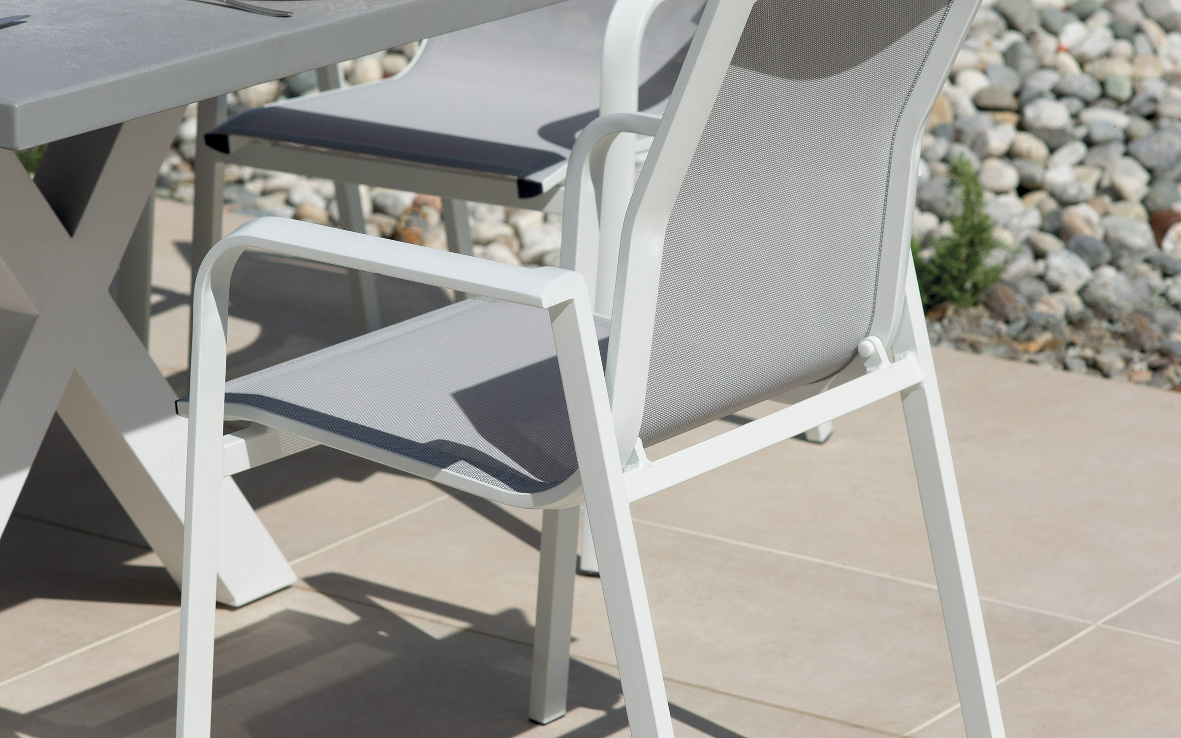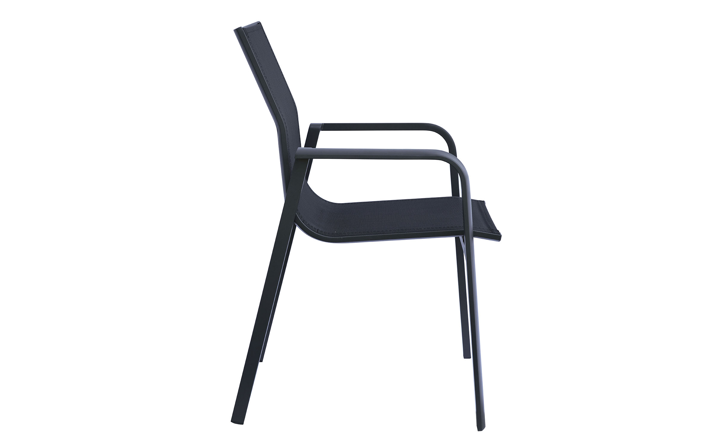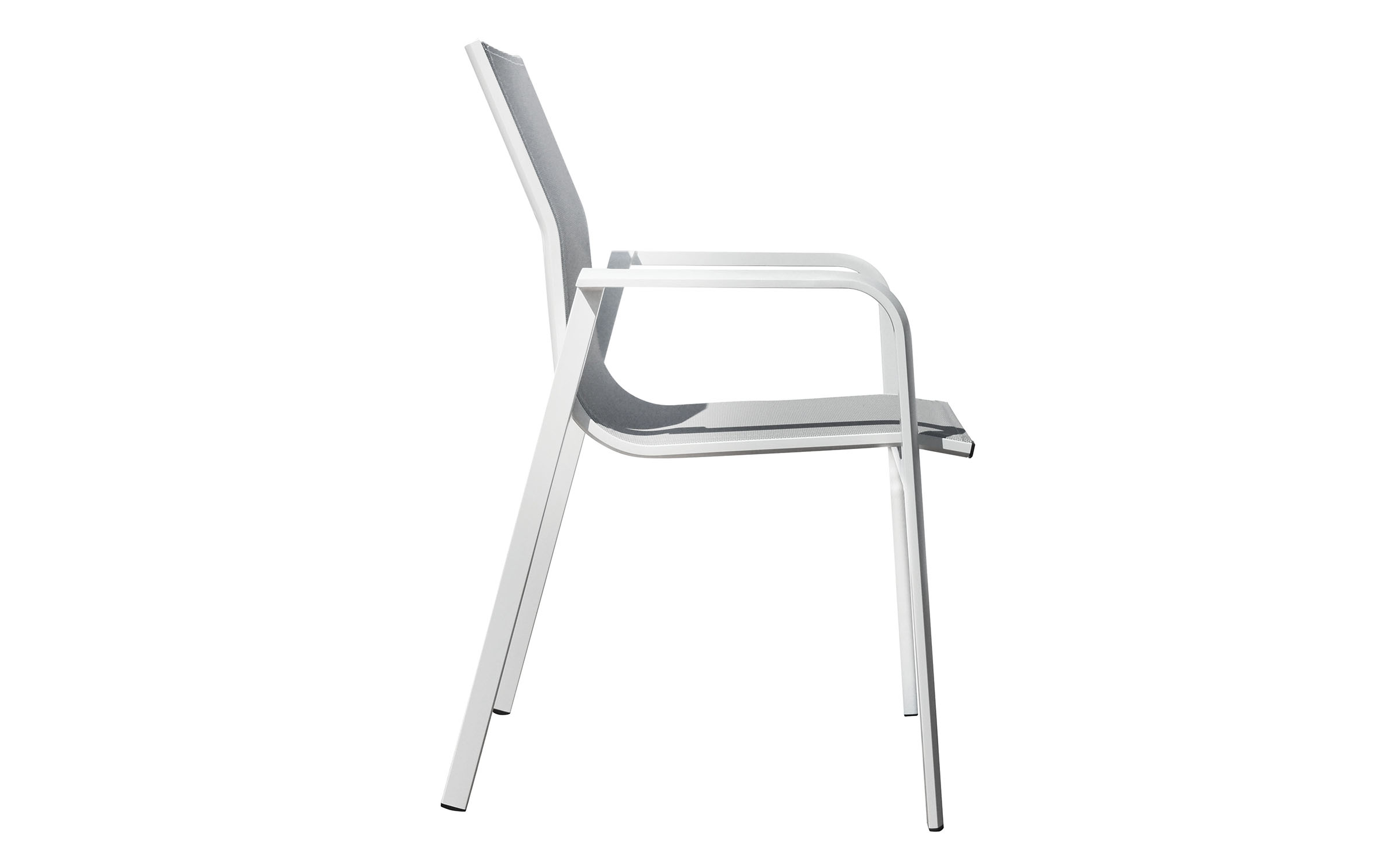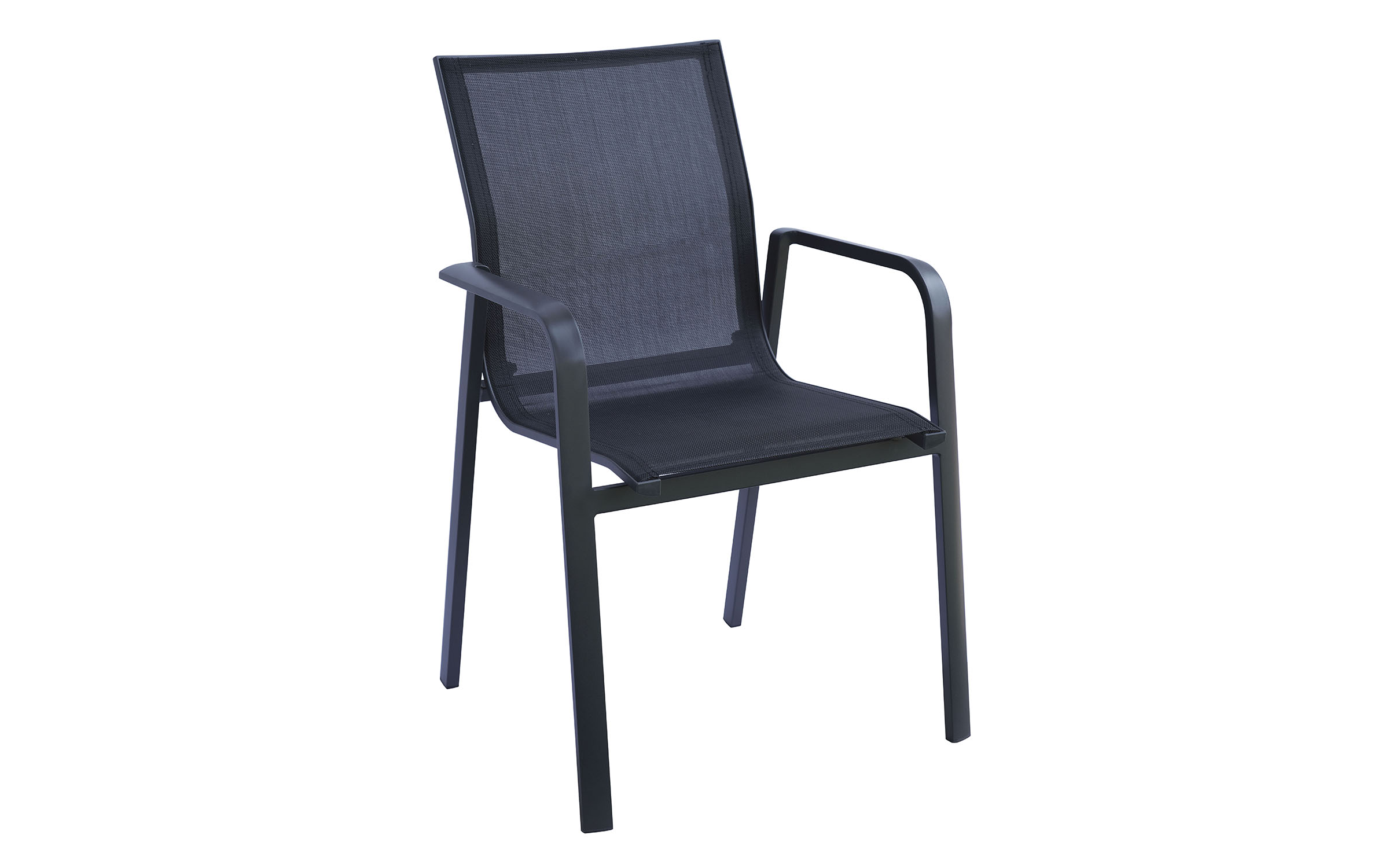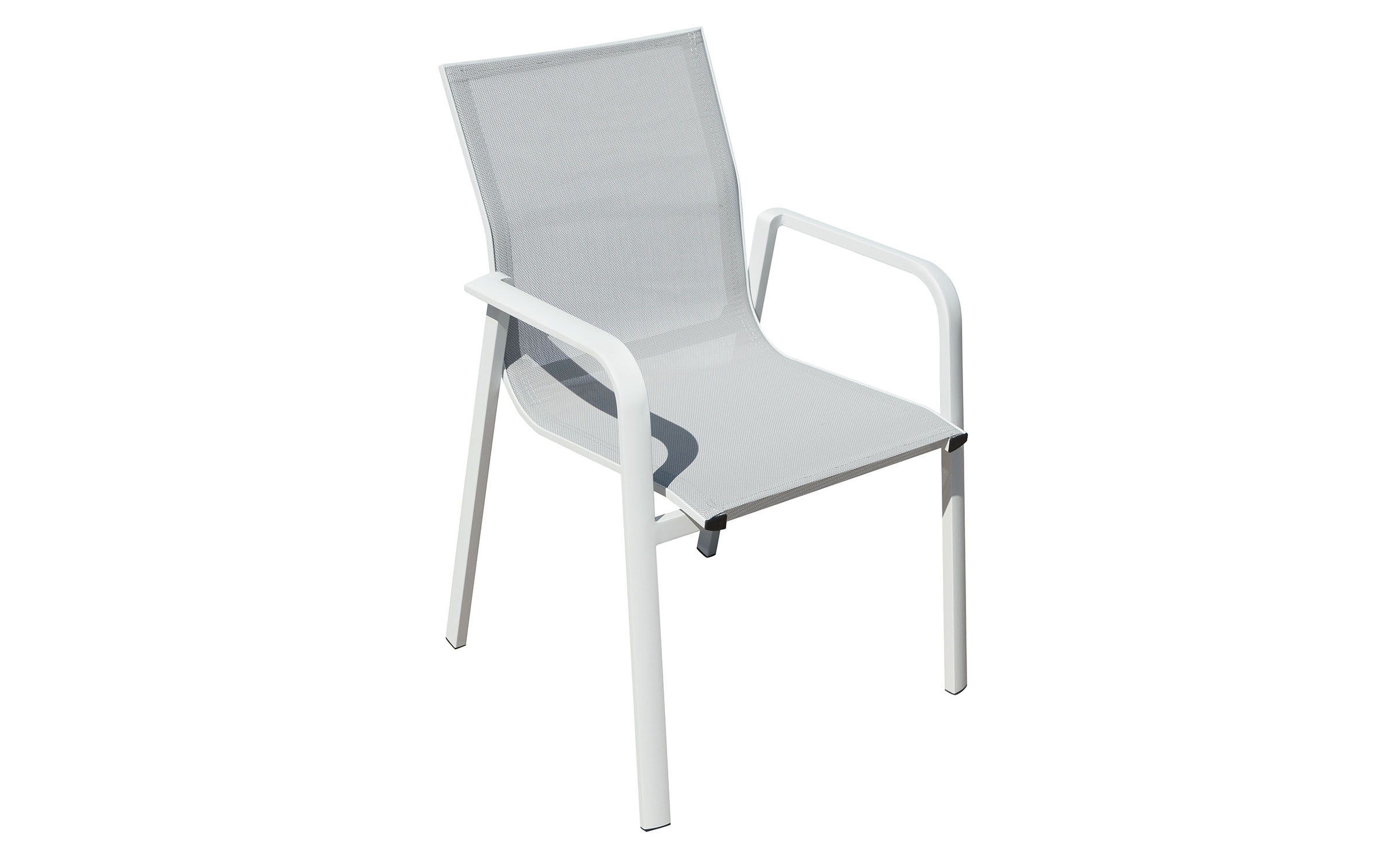 Nowoczesne krzesło ogrodowe z podłokietnikami, wykonane z aluminium malowanego proszkowo oraz tekstyliny odpornej na warunki atmosferyczne. Konstrukcja sztaplowana pozwala na wygodne przechowywanie. Idealne do zestawów jadalnianych na tarasie lub balkonie. Dostępne w dwóch wersjach kolorystycznych: