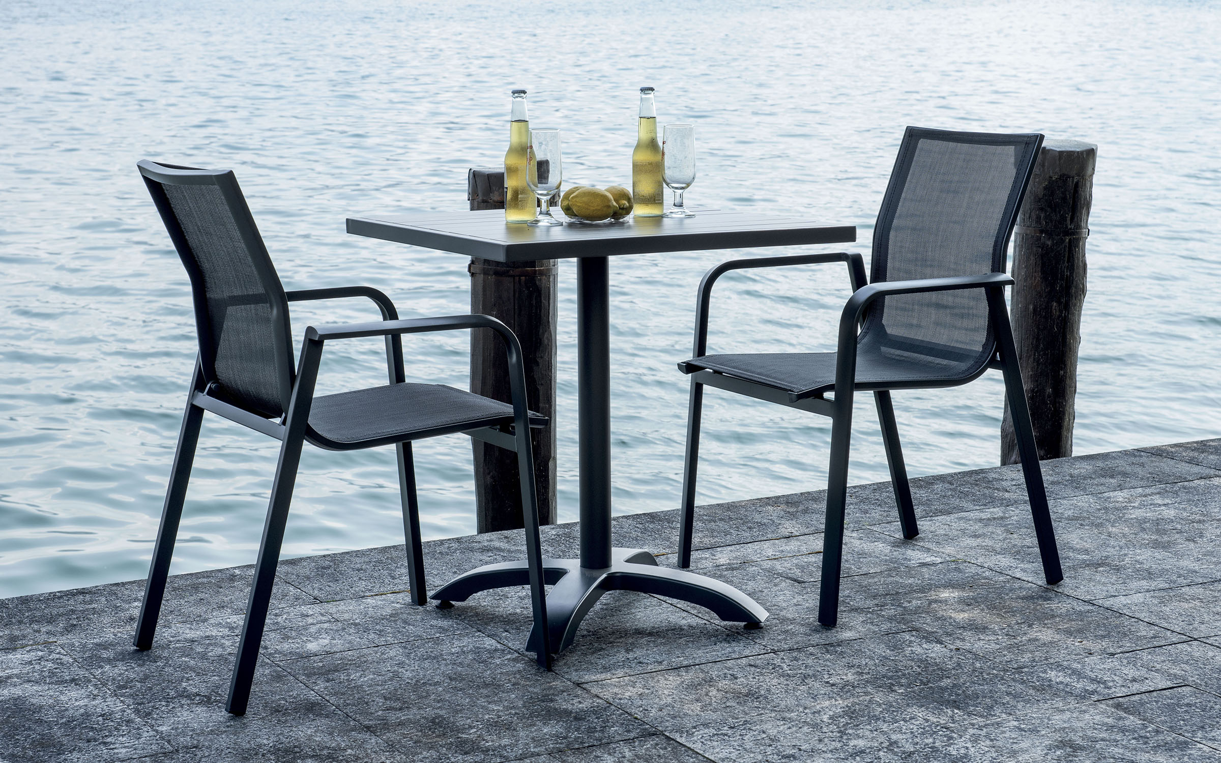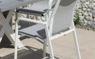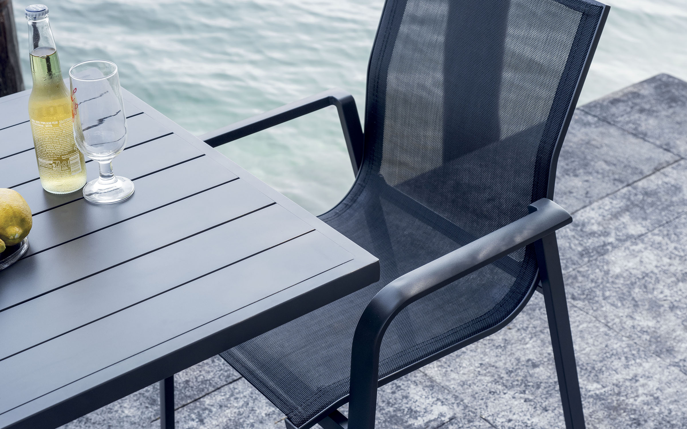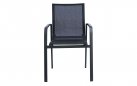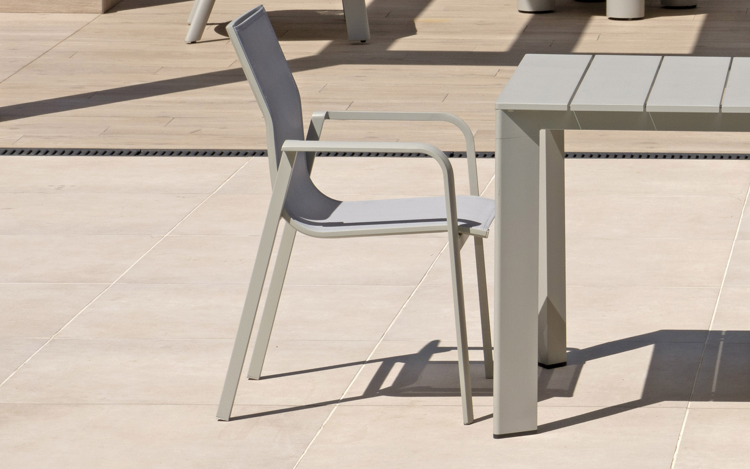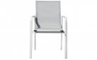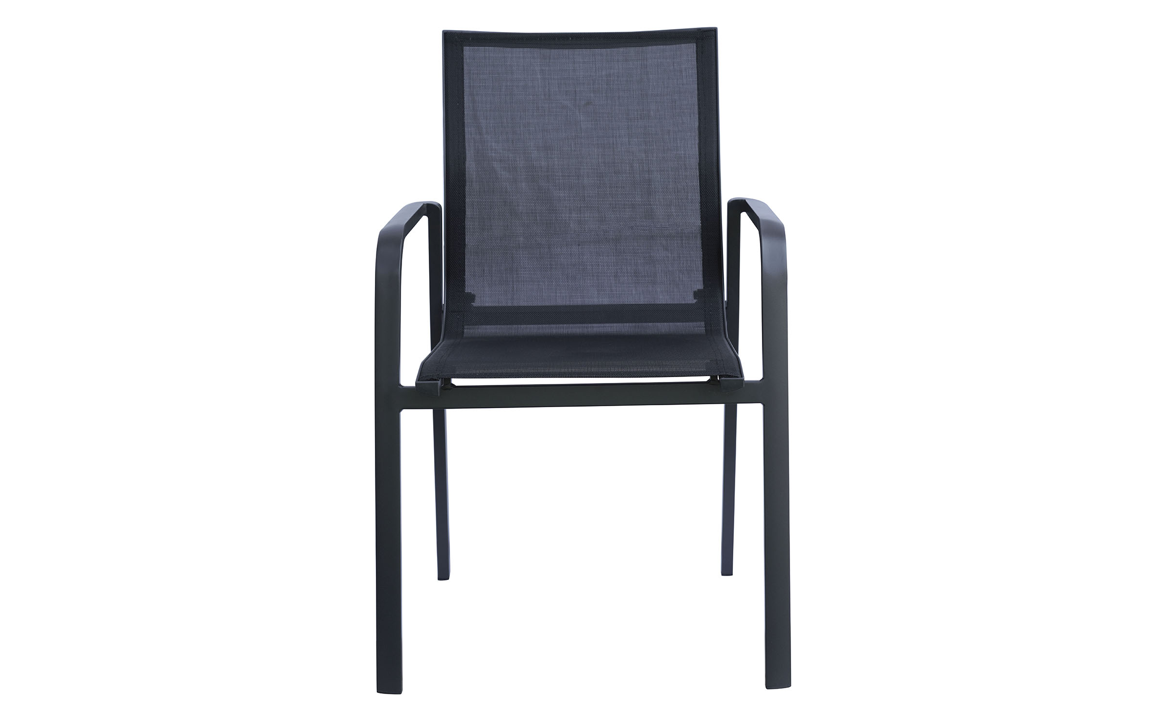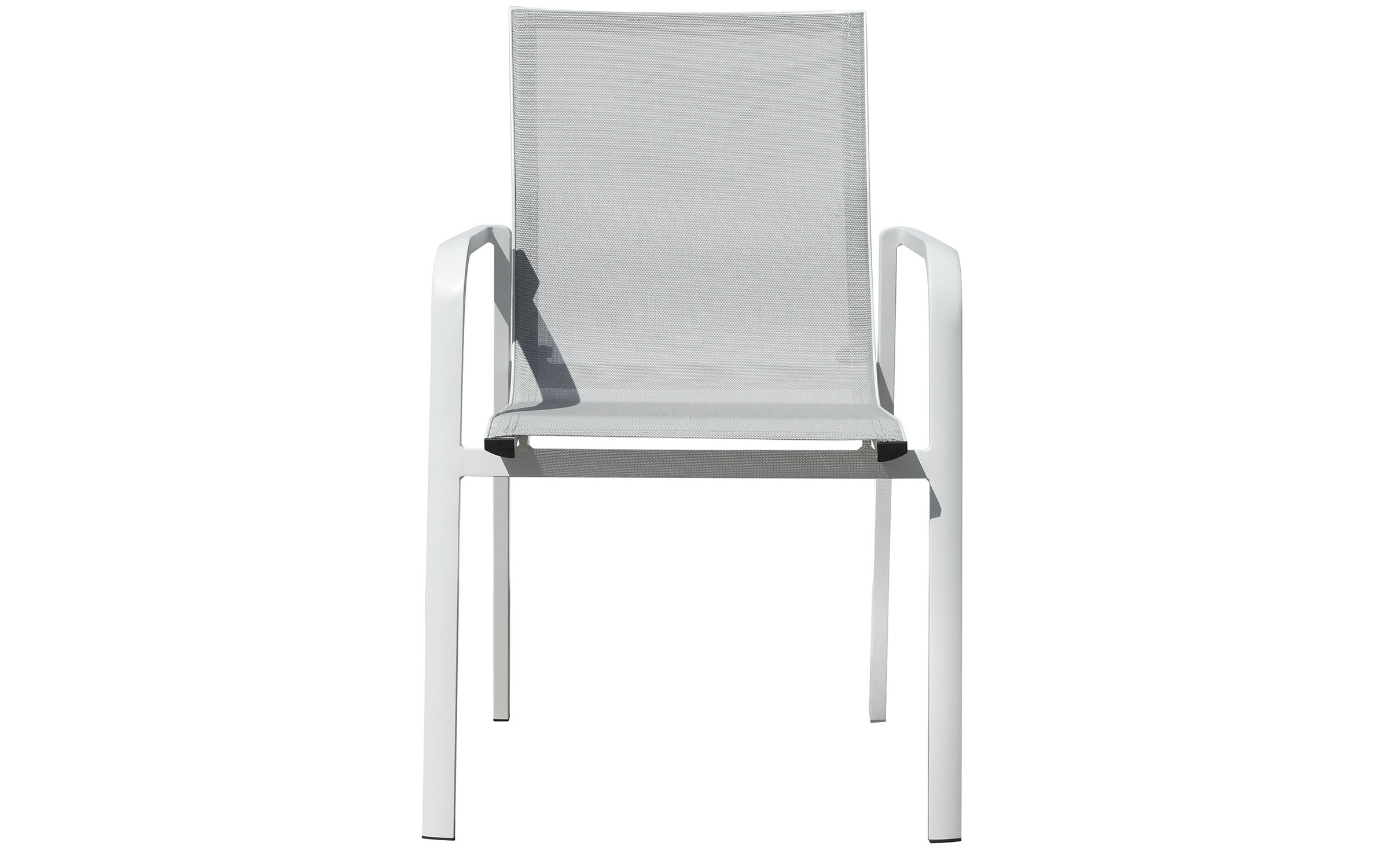 Nowoczesne krzesło ogrodowe z podłokietnikami, wykonane z aluminium malowanego proszkowo oraz tekstyliny odpornej na warunki atmosferyczne. Konstrukcja sztaplowana pozwala na wygodne przechowywanie. Idealne do zestawów jadalnianych na tarasie lub balkonie. Dostępne w dwóch wersjach kolorystycznych:
